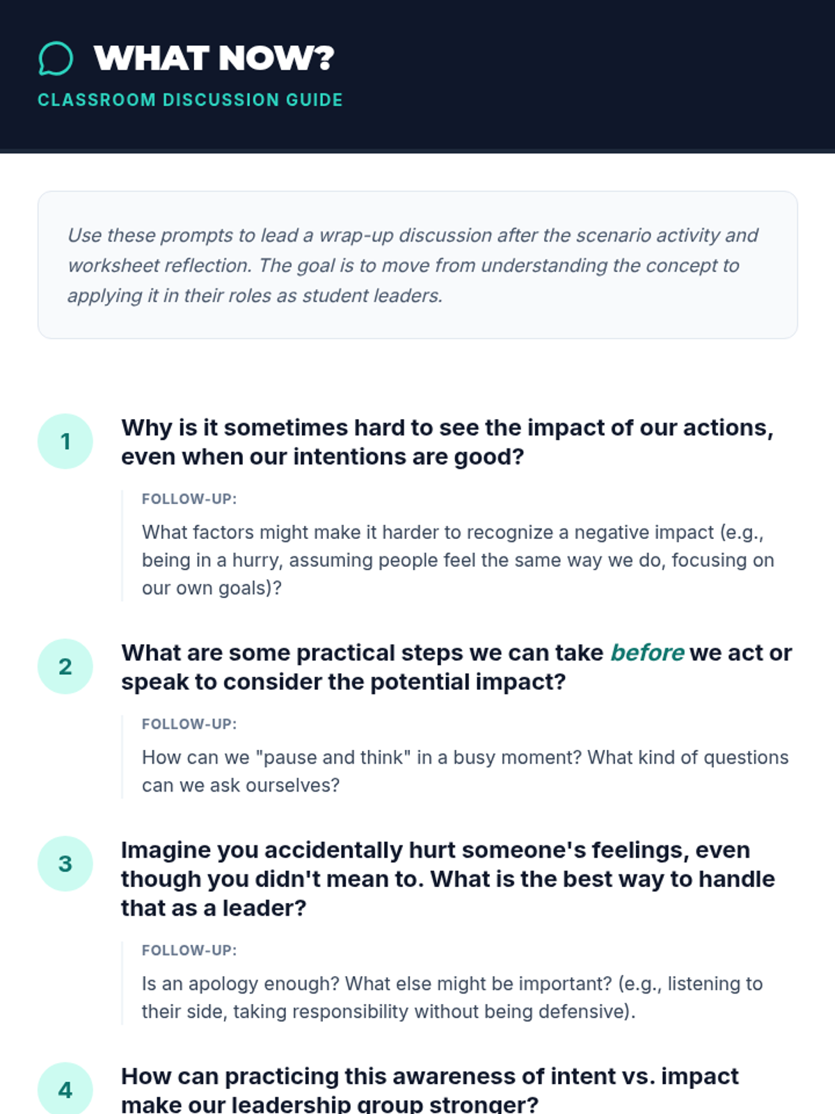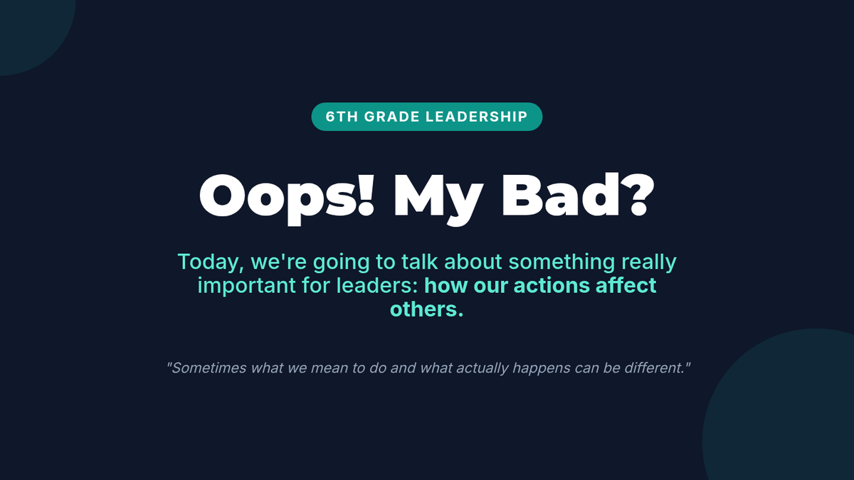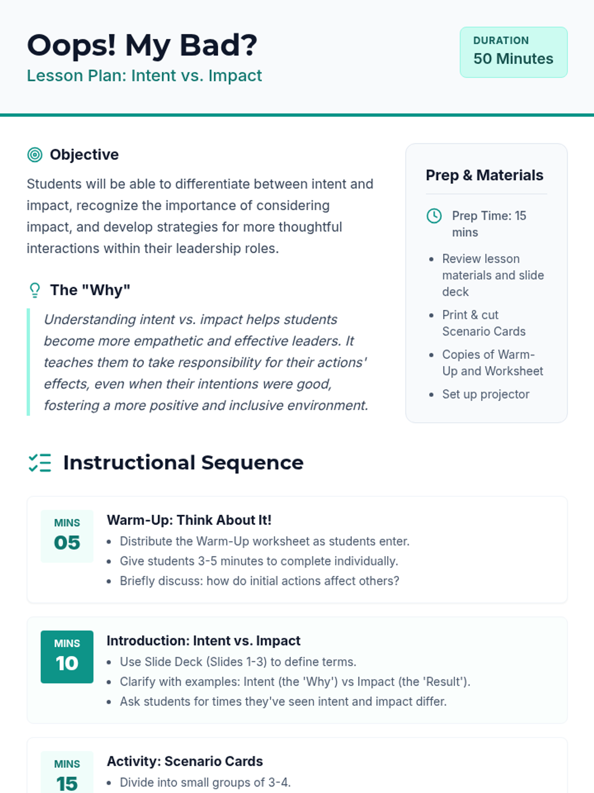 A 50-minute leadership lesson for 6th graders focused on distinguishing between personal intent and the actual impact of actions, fostering empathy and accountability.