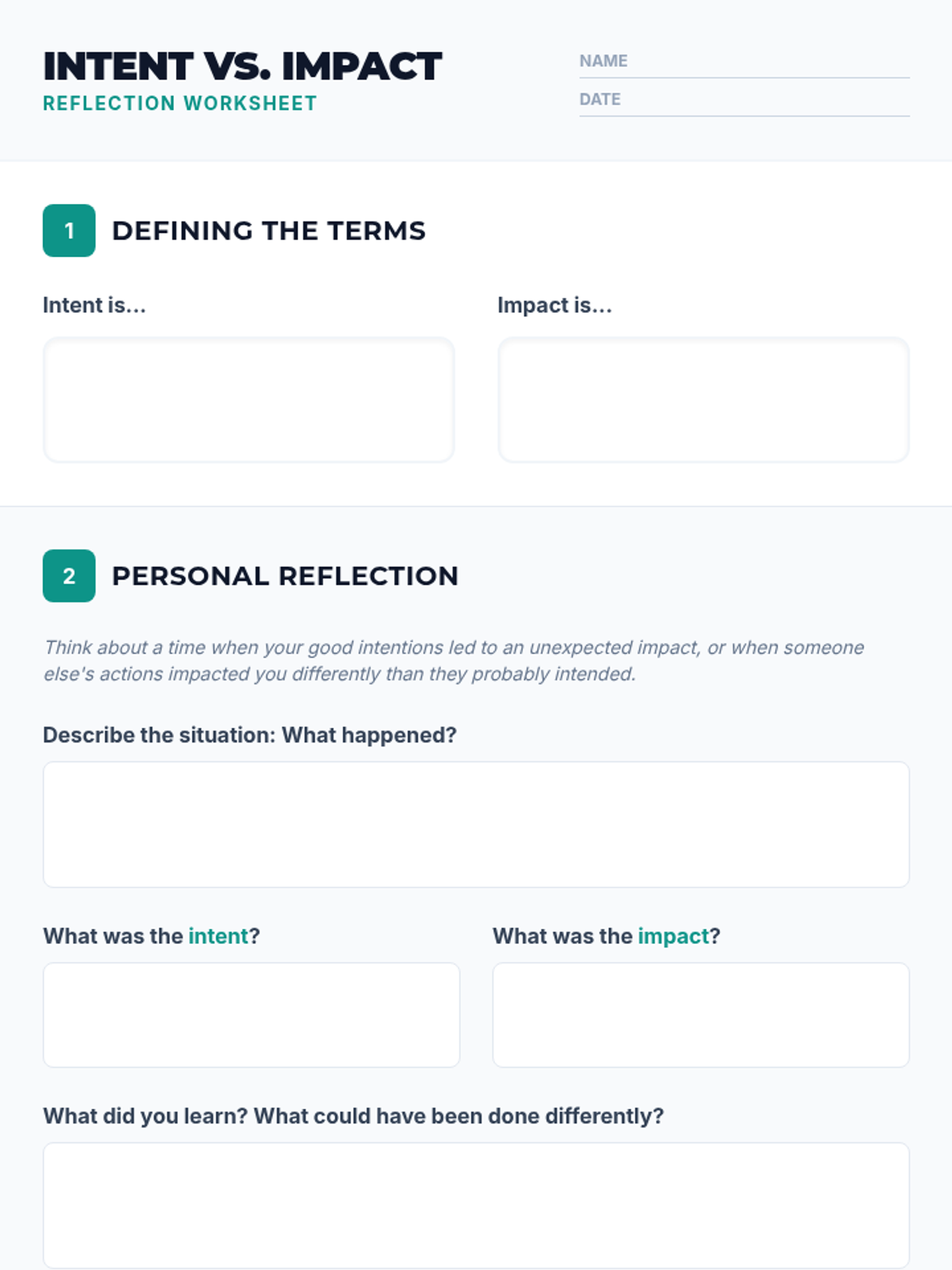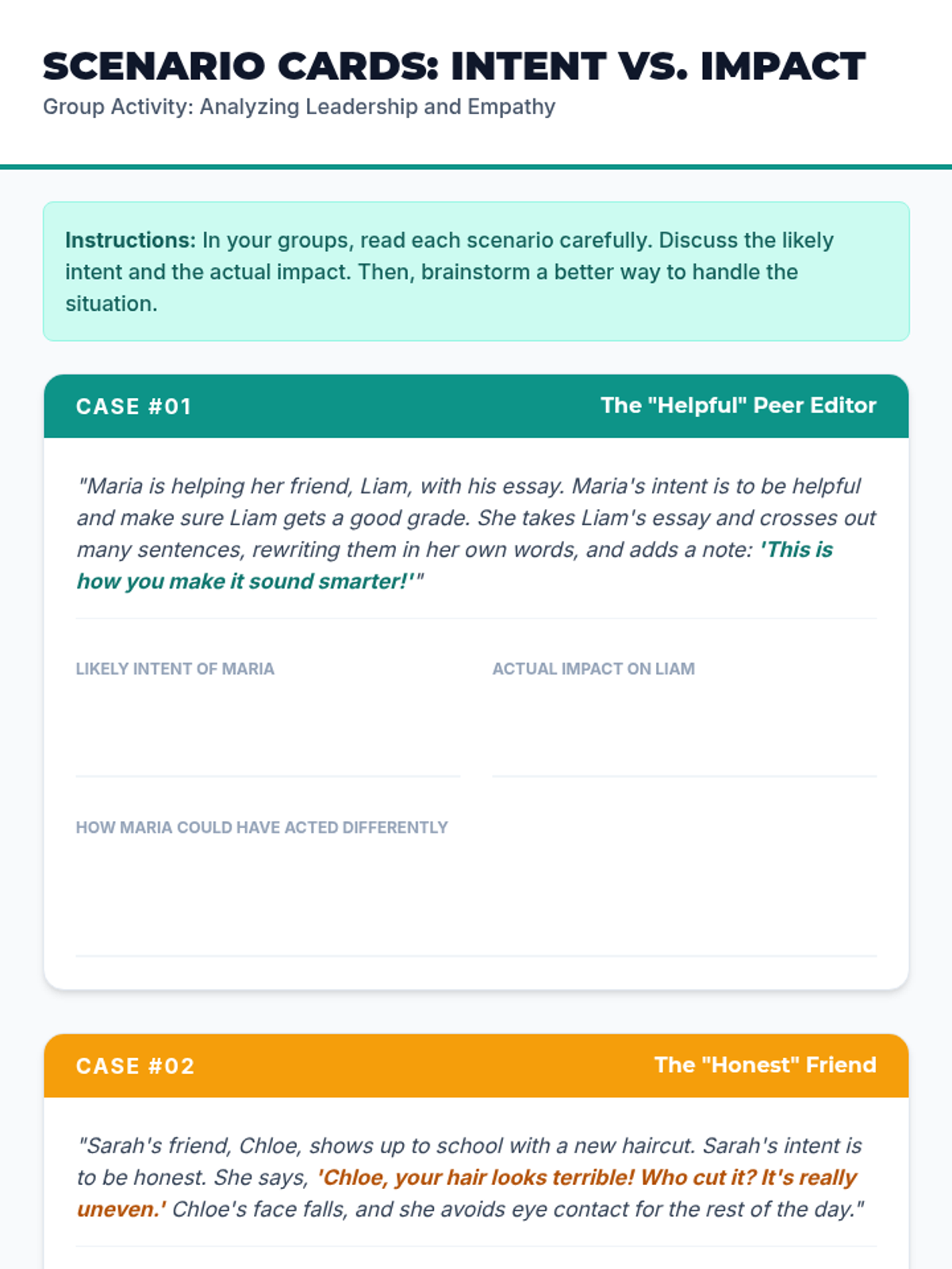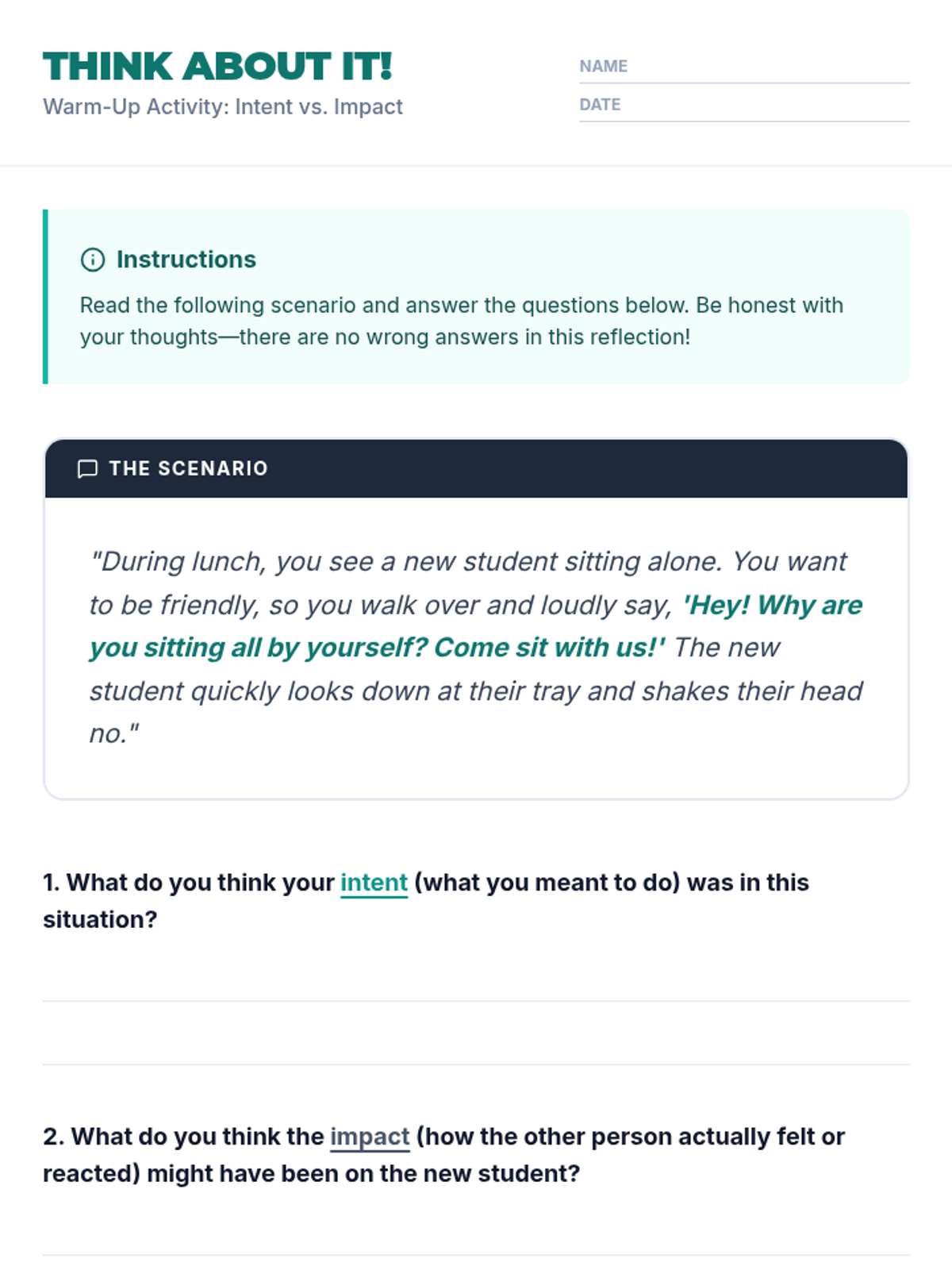 A 50-minute leadership lesson for 6th graders focused on distinguishing between personal intent and the actual impact of actions, fostering empathy and accountability.