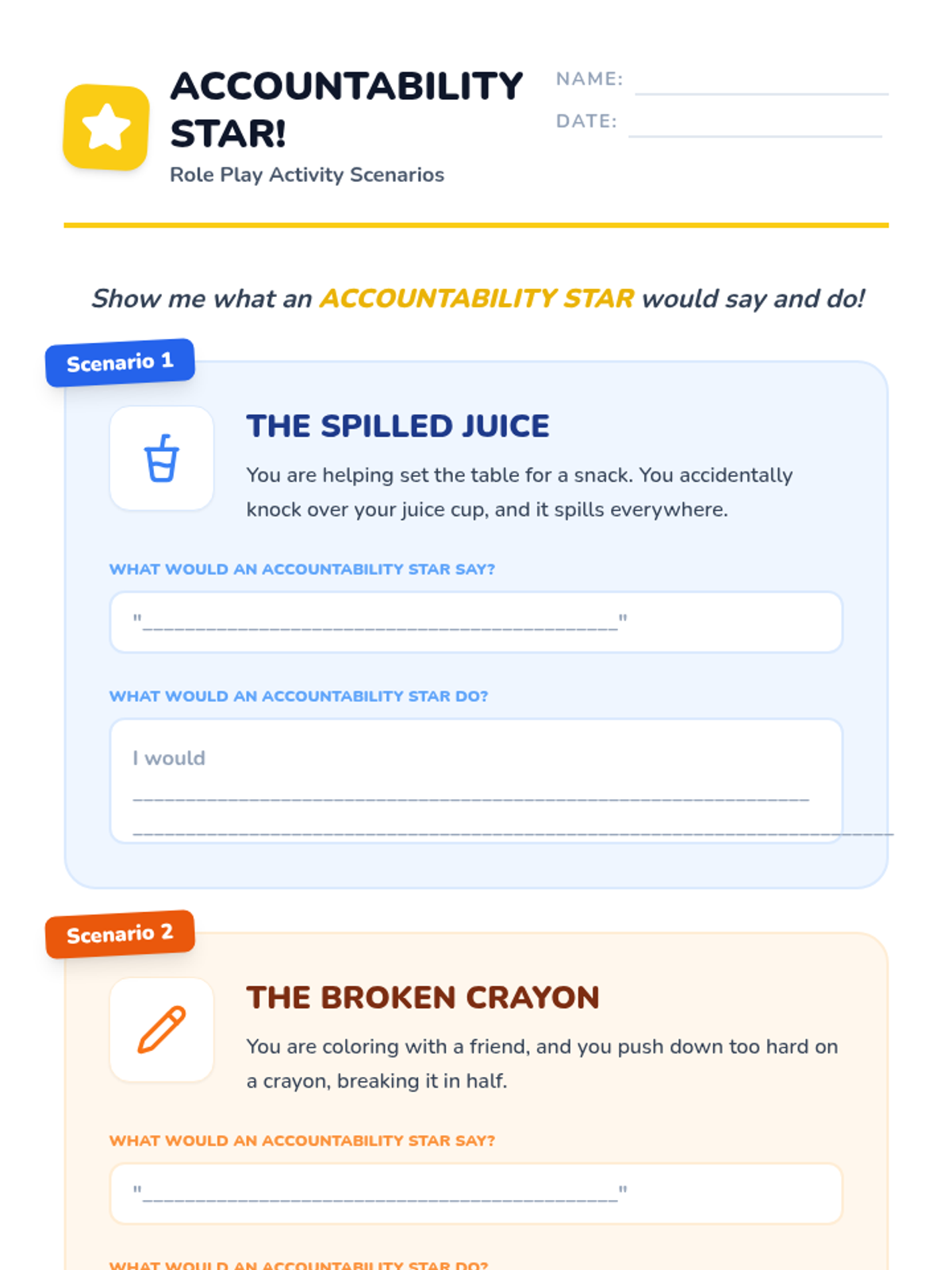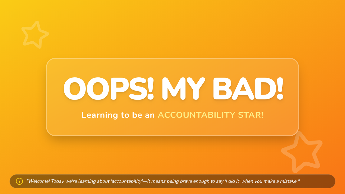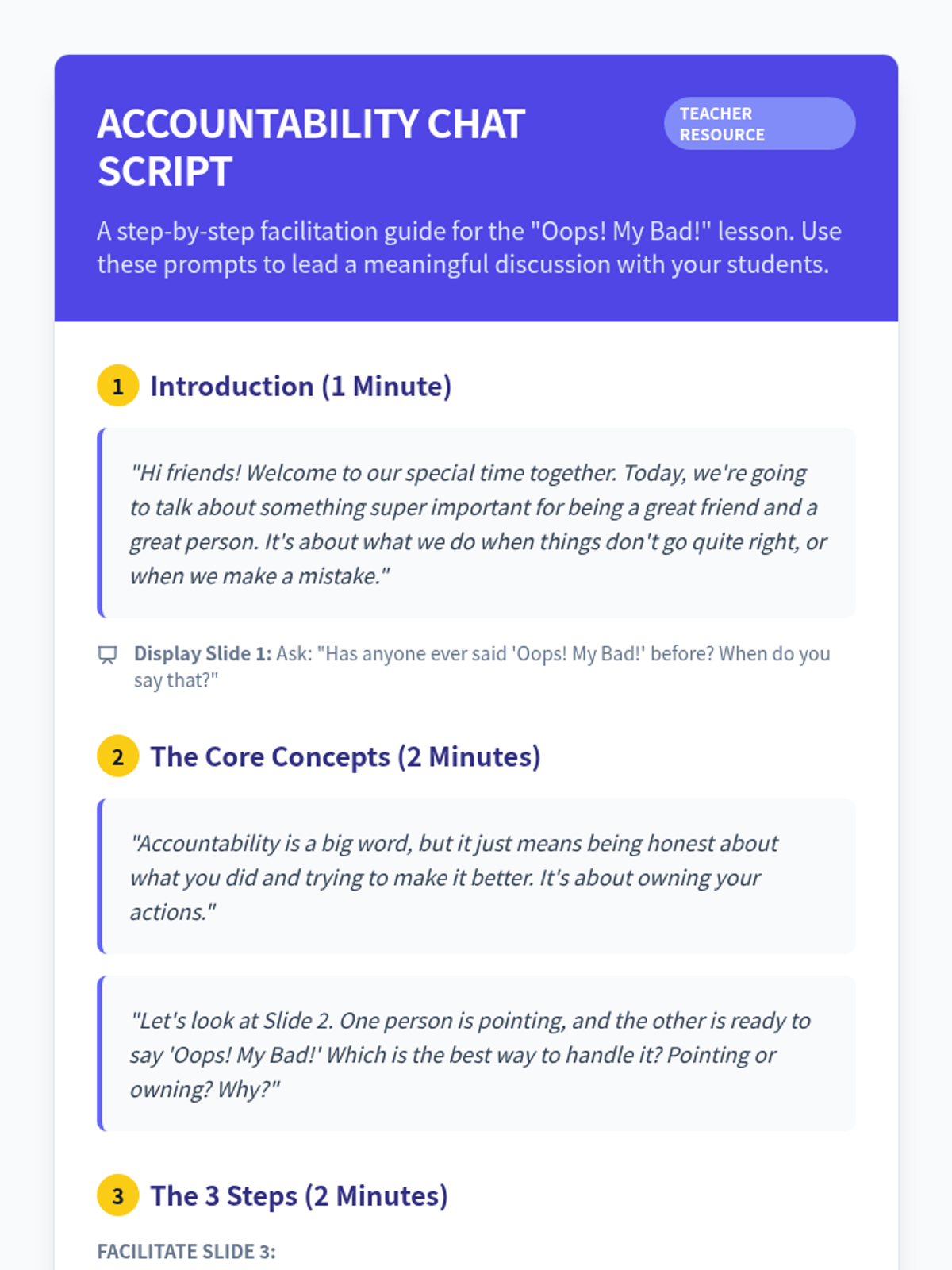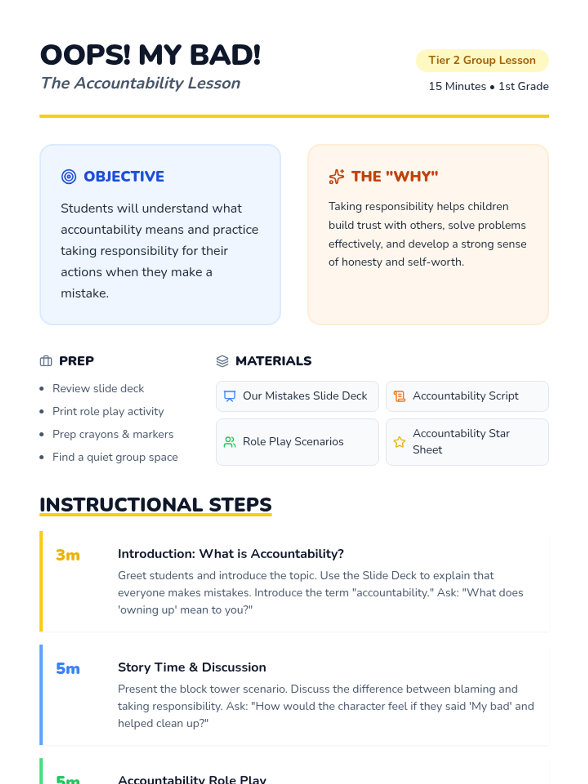 A 15-minute Tier 2 group lesson for 1st-grade students focused on accountability. Students learn to own their mistakes, avoid blaming others, and help fix problems to build trust and self-worth.