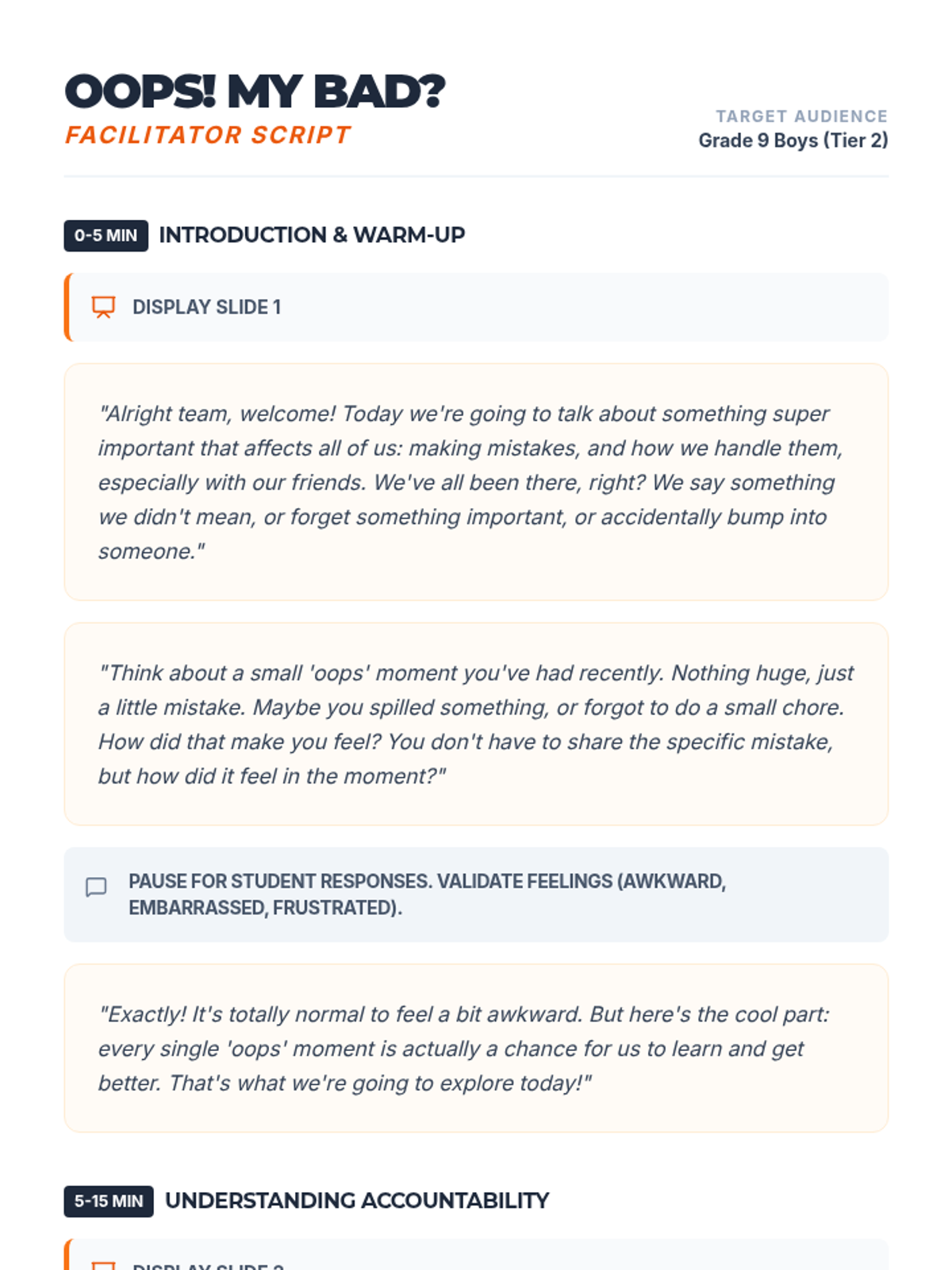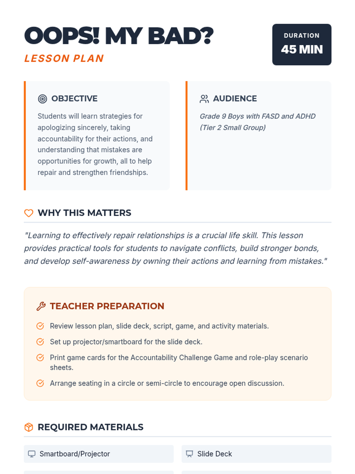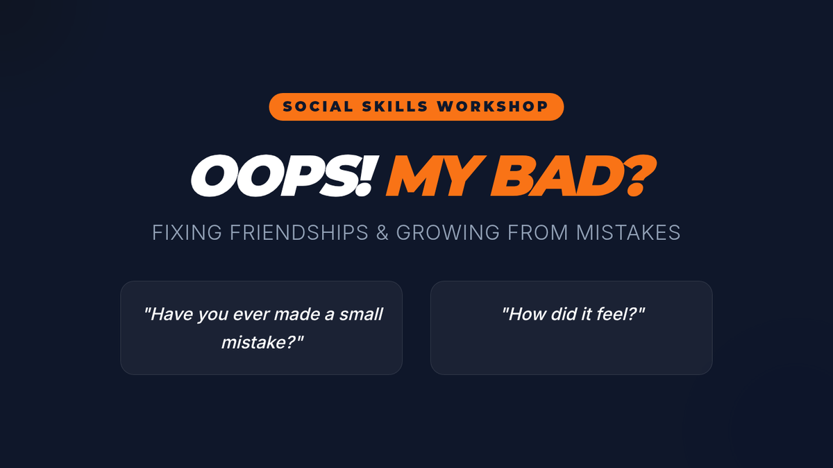 A 45-minute small group session for Grade 9 boys with FASD and ADHD focused on repair, accountability, and sincere apologies. Students learn that mistakes are learning opportunities and practice specific steps to fix relationships.