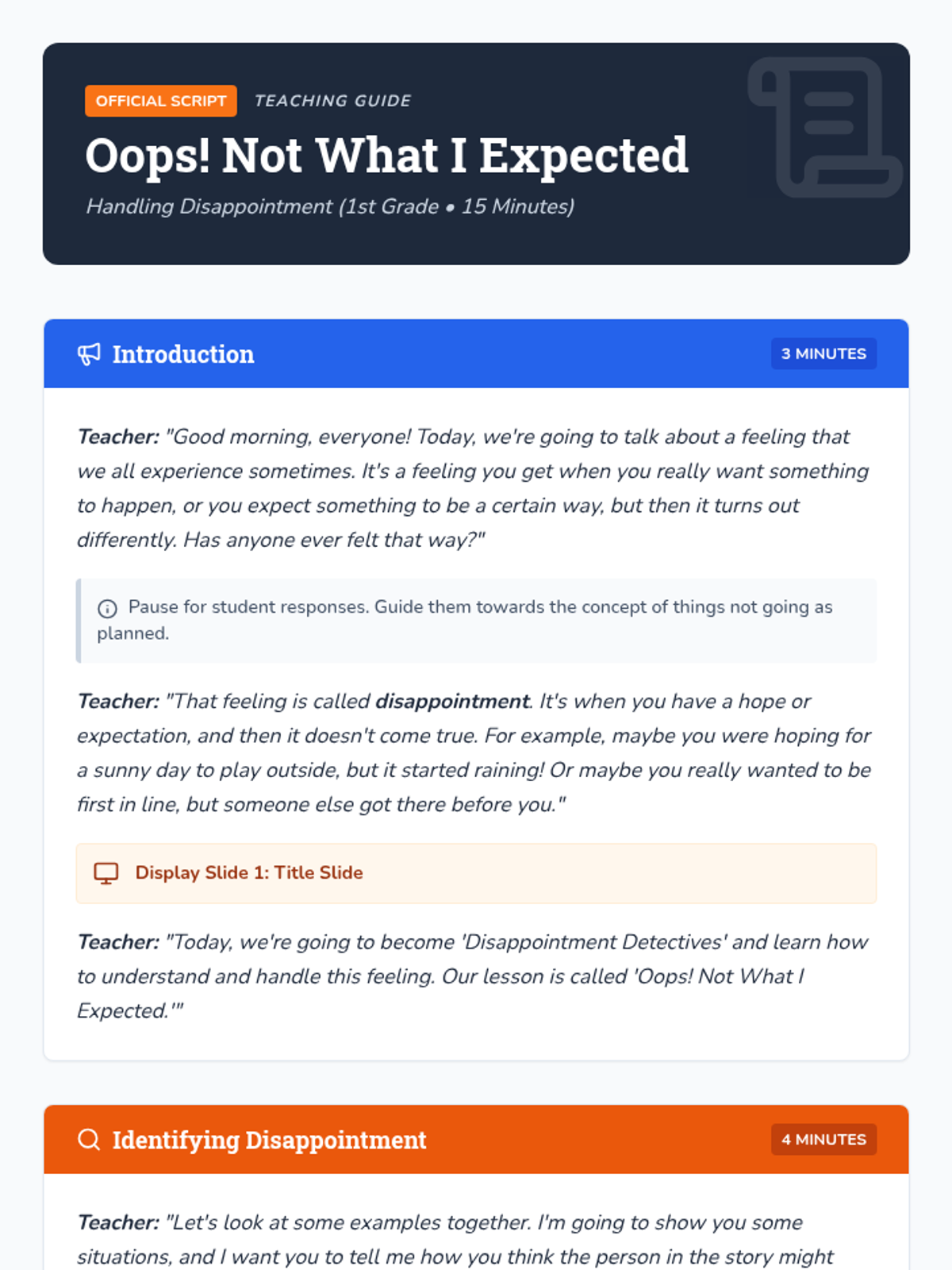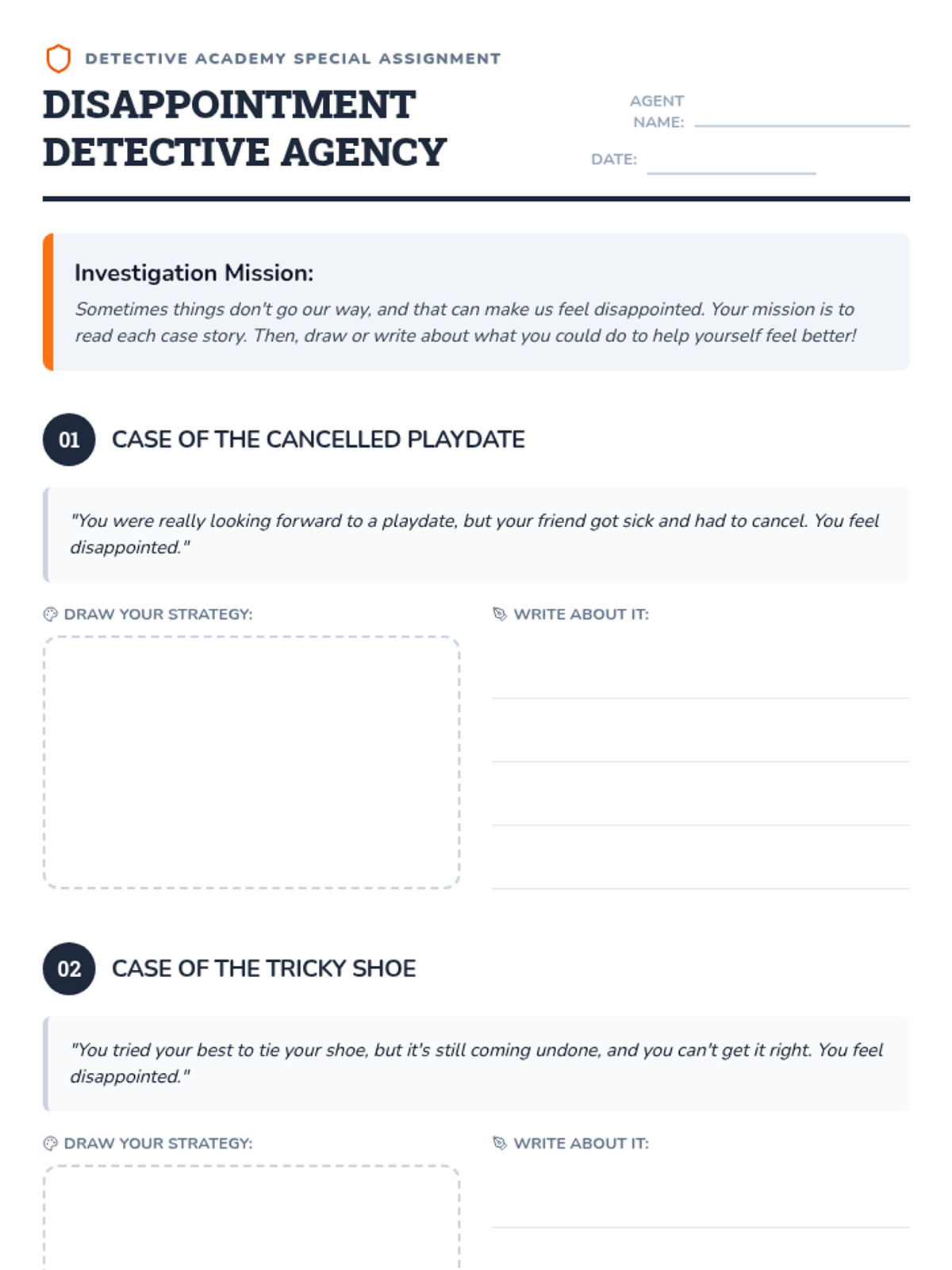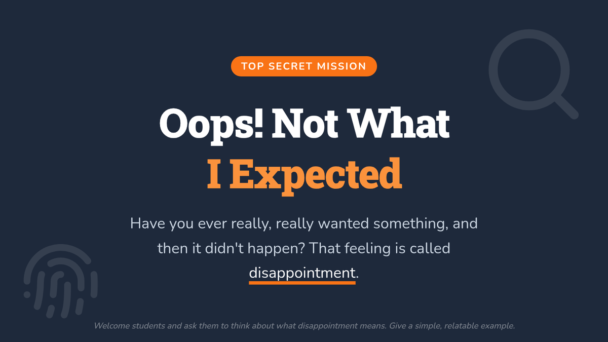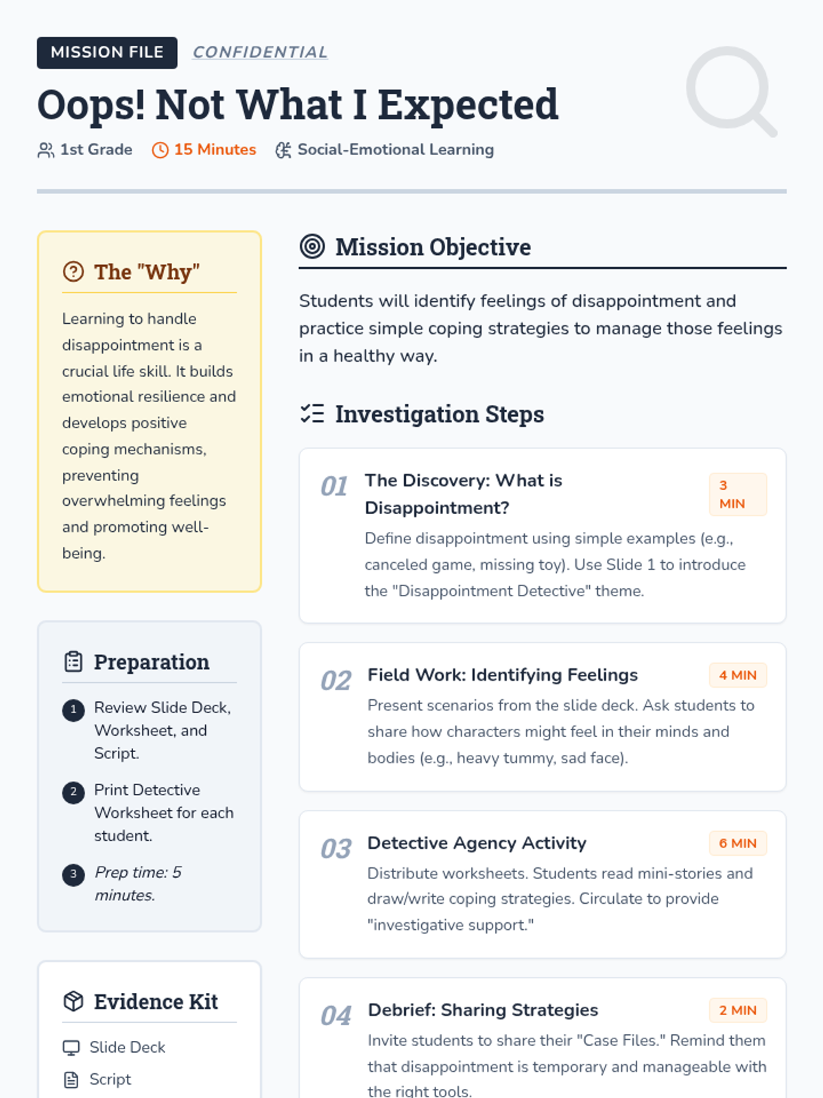 A 15-minute social-emotional learning lesson for 1st graders to identify disappointment and learn healthy coping strategies through a detective-themed activity.