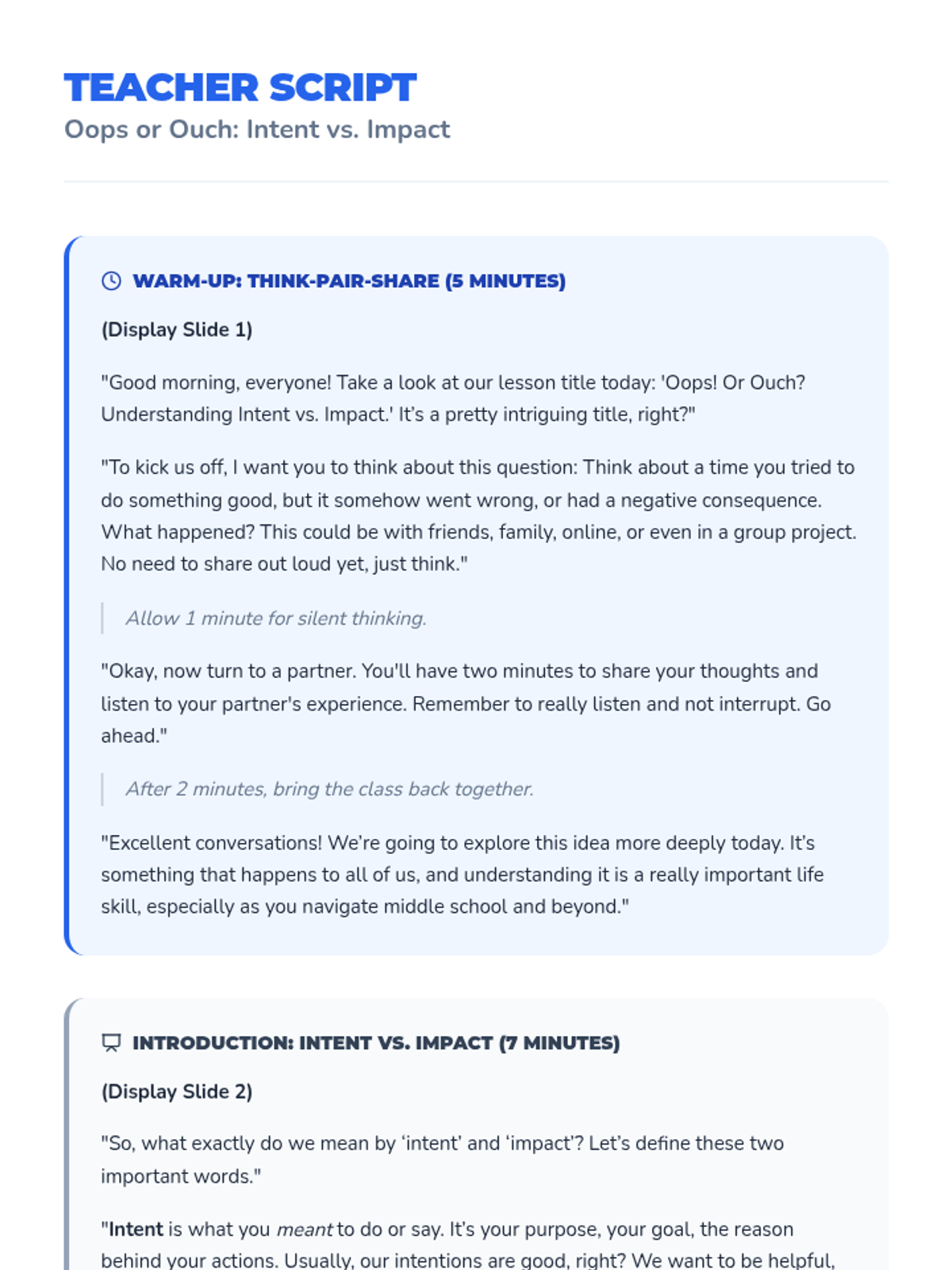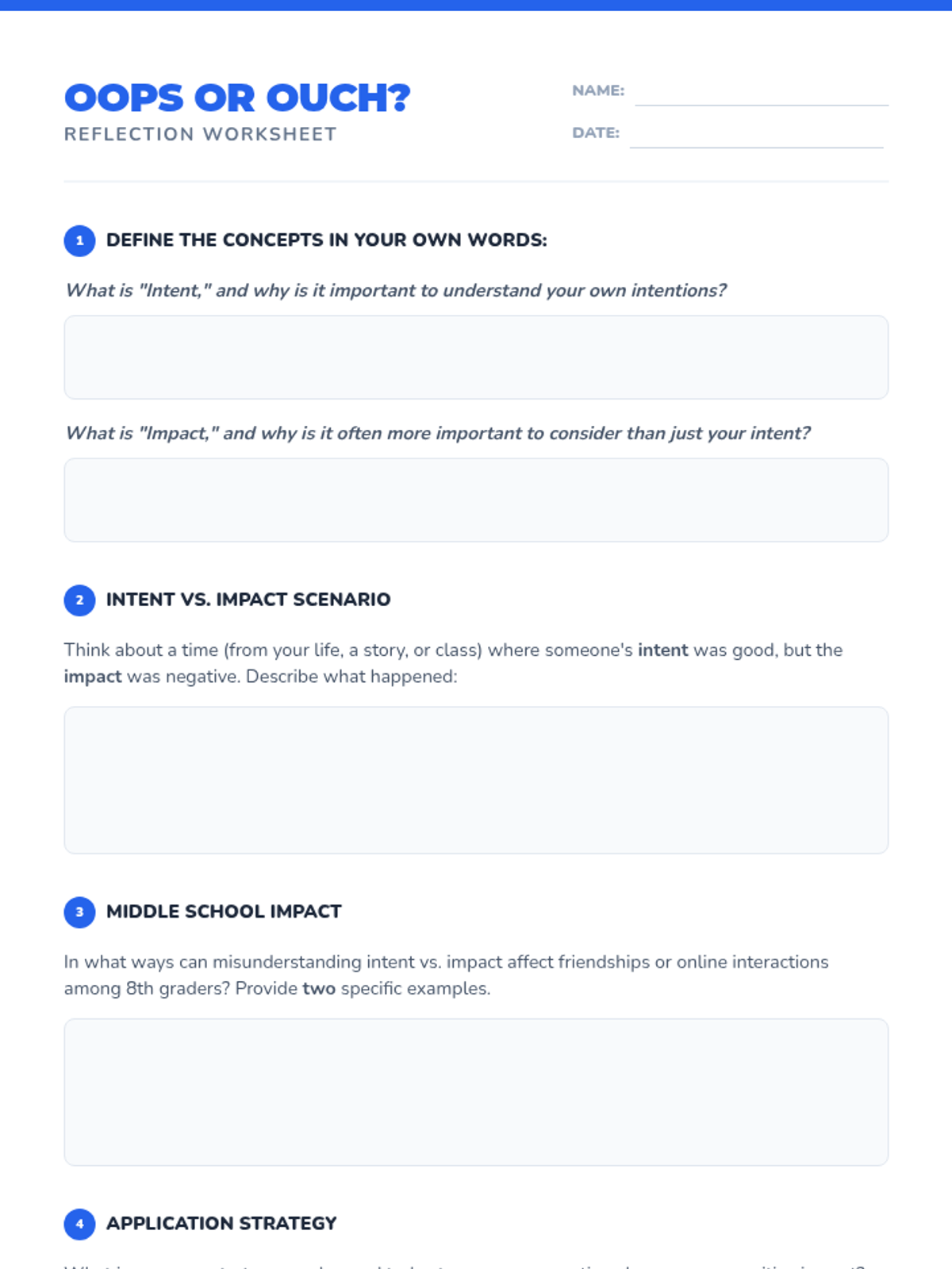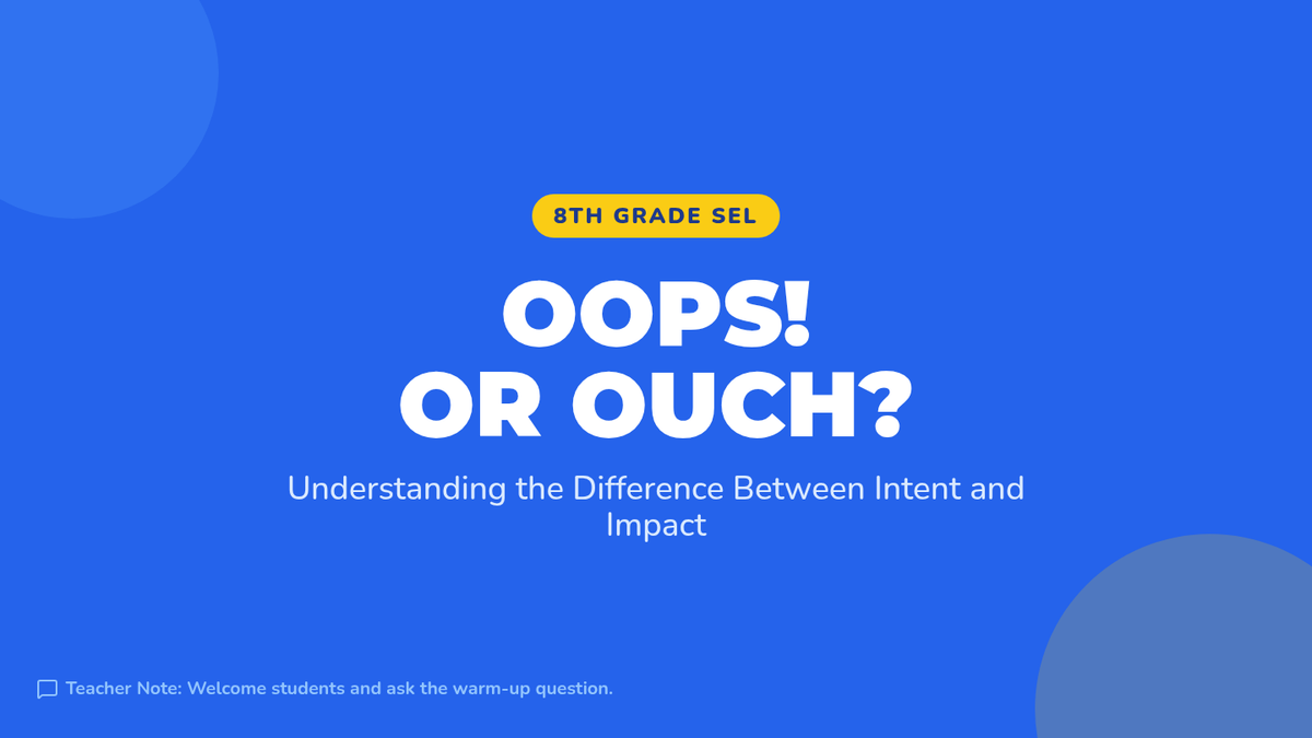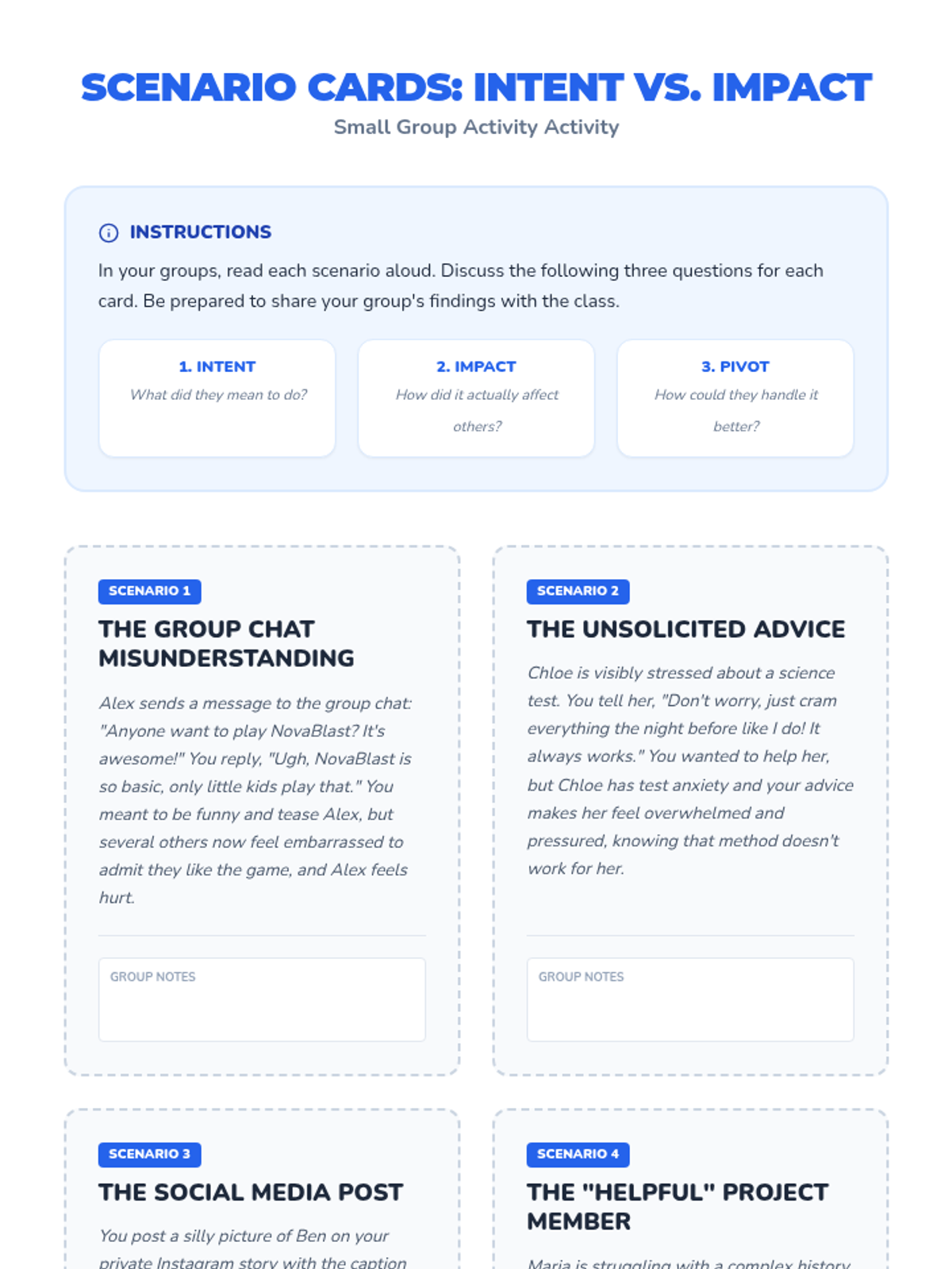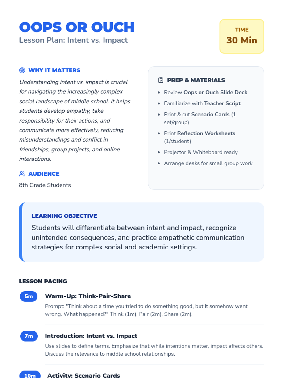 This single-session 30-minute lesson for 8th graders explores the critical distinction between intent and impact. Students will engage with real-world scenarios to understand how well-meaning actions can have negative consequences and learn strategies for more empathetic communication.