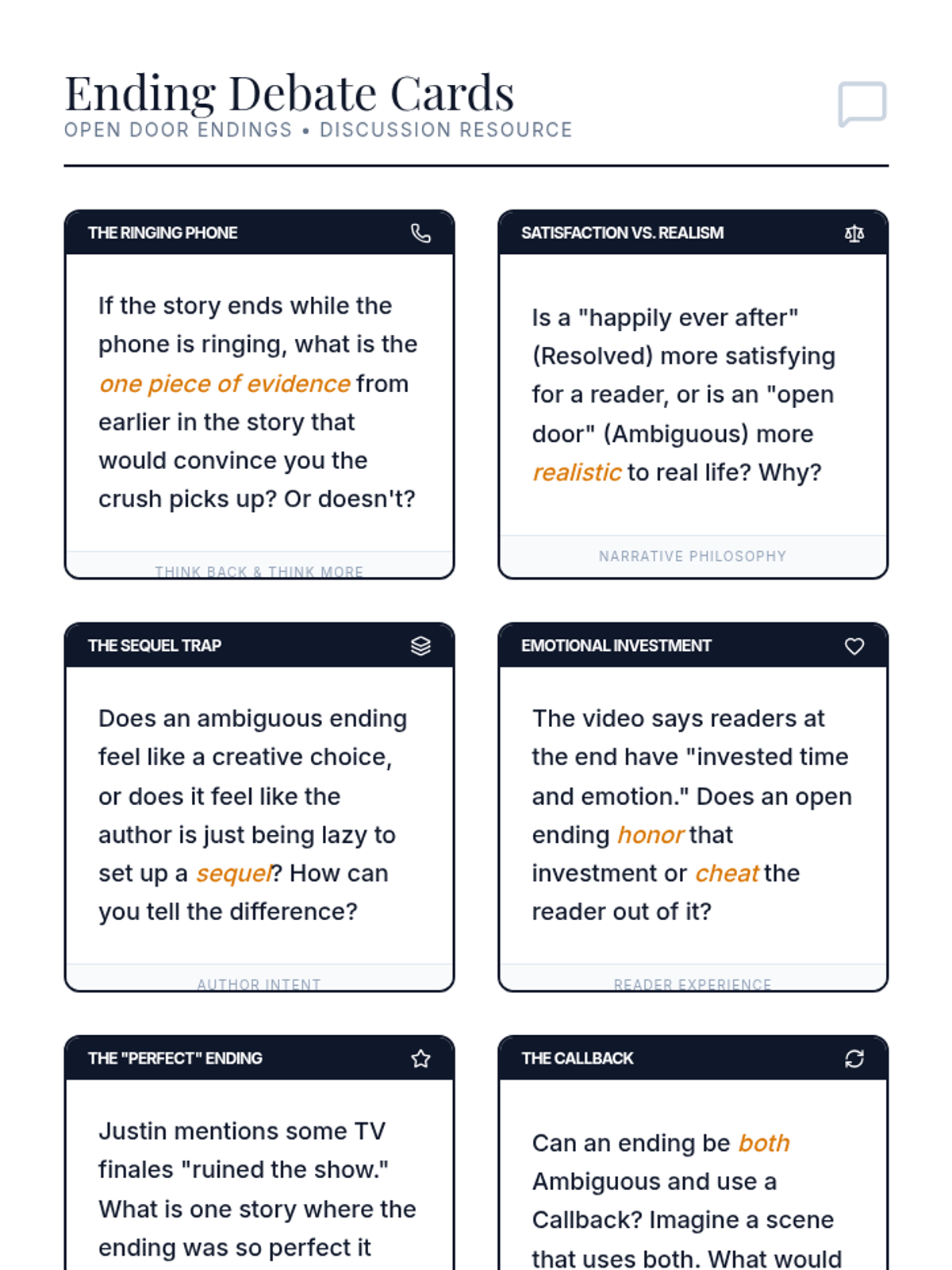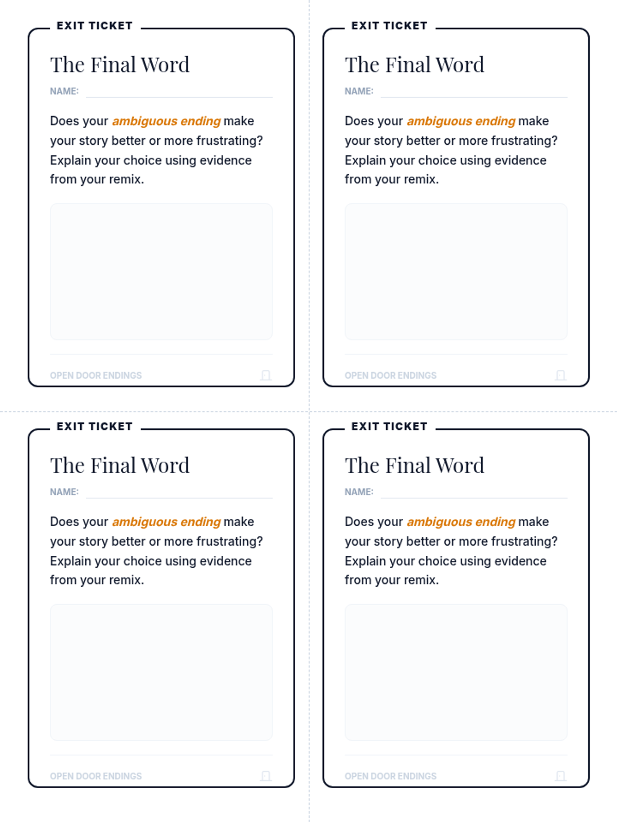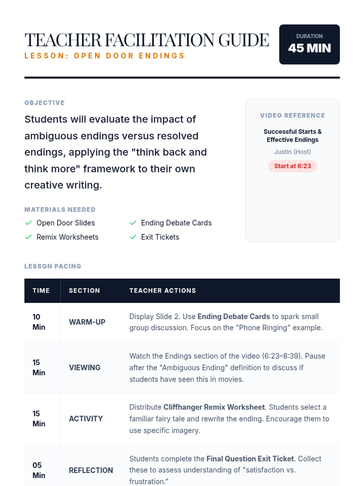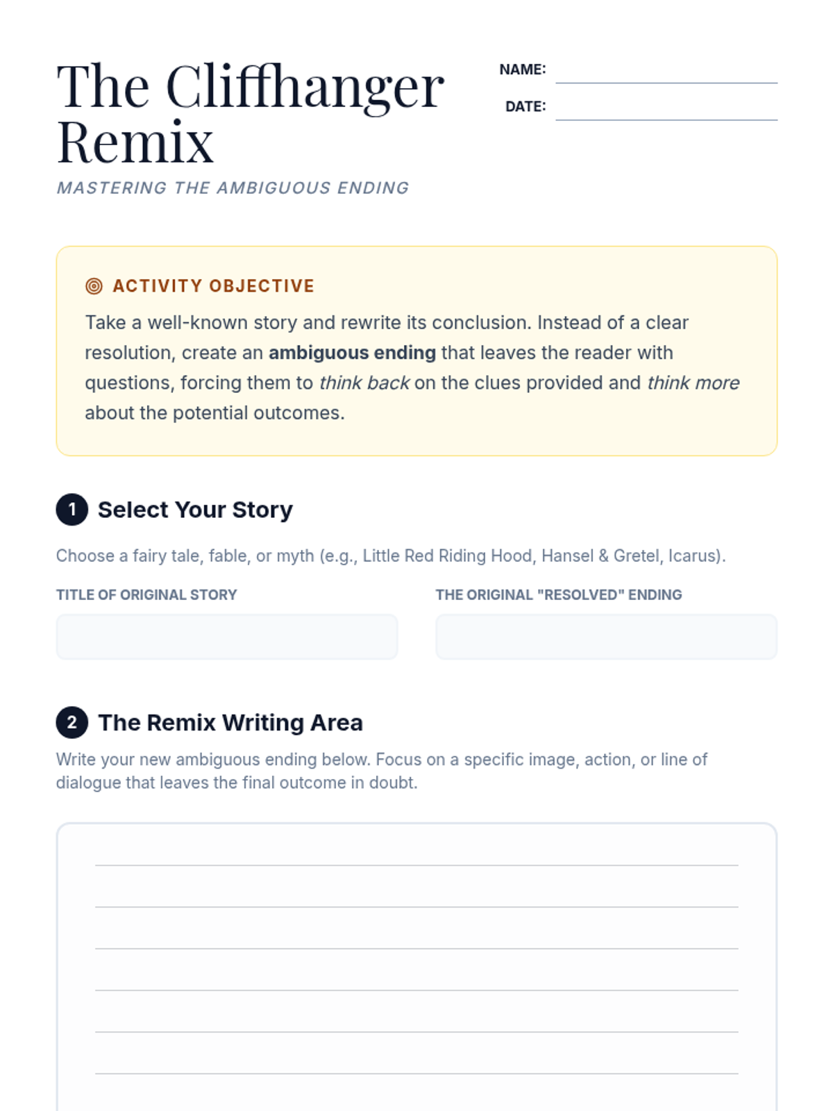 Students will explore the narrative craft of endings, specifically focusing on the tension between resolution and ambiguity. They will evaluate how 'thinking back and thinking more' impacts reader satisfaction through a creative rewriting activity.