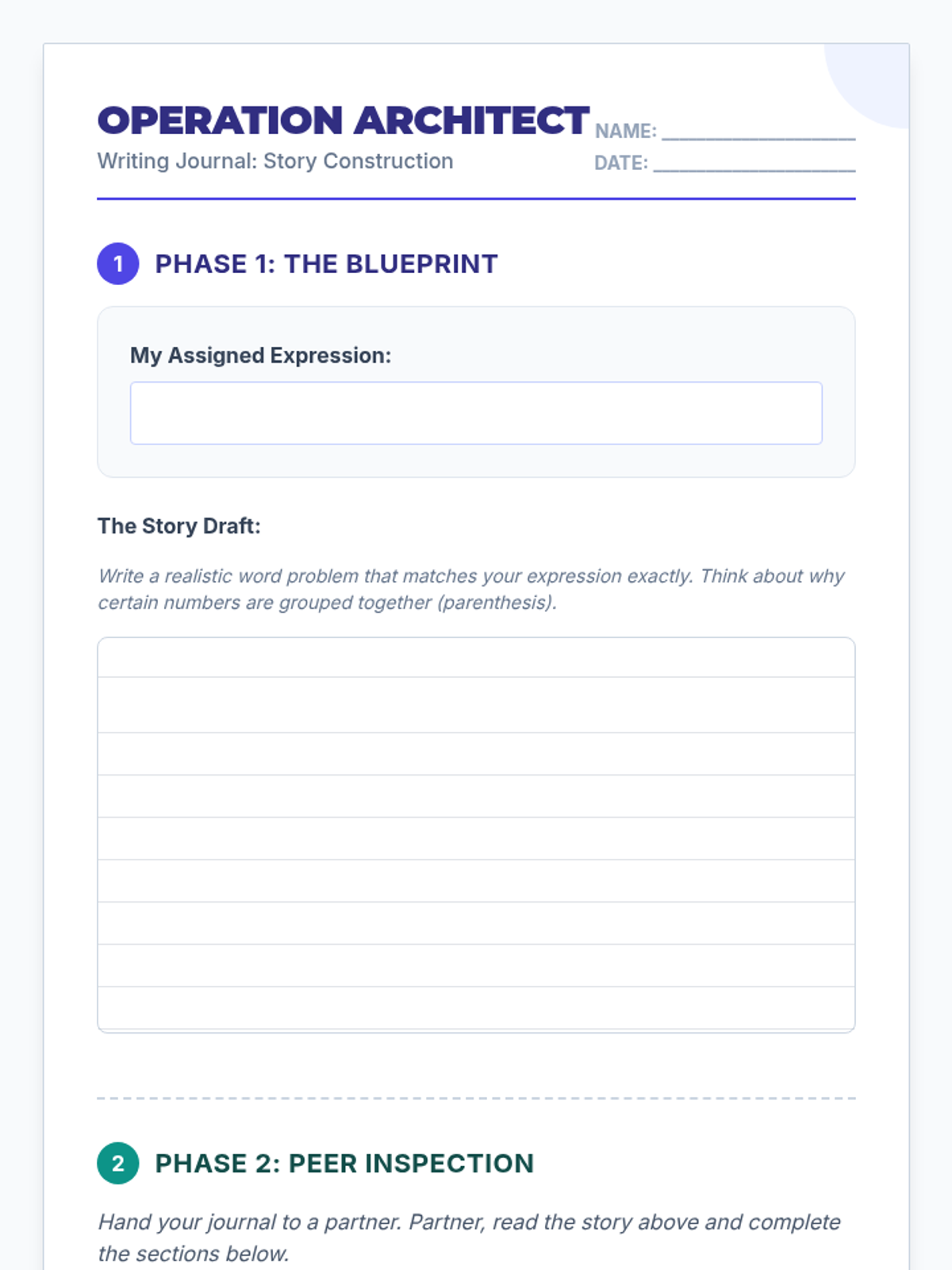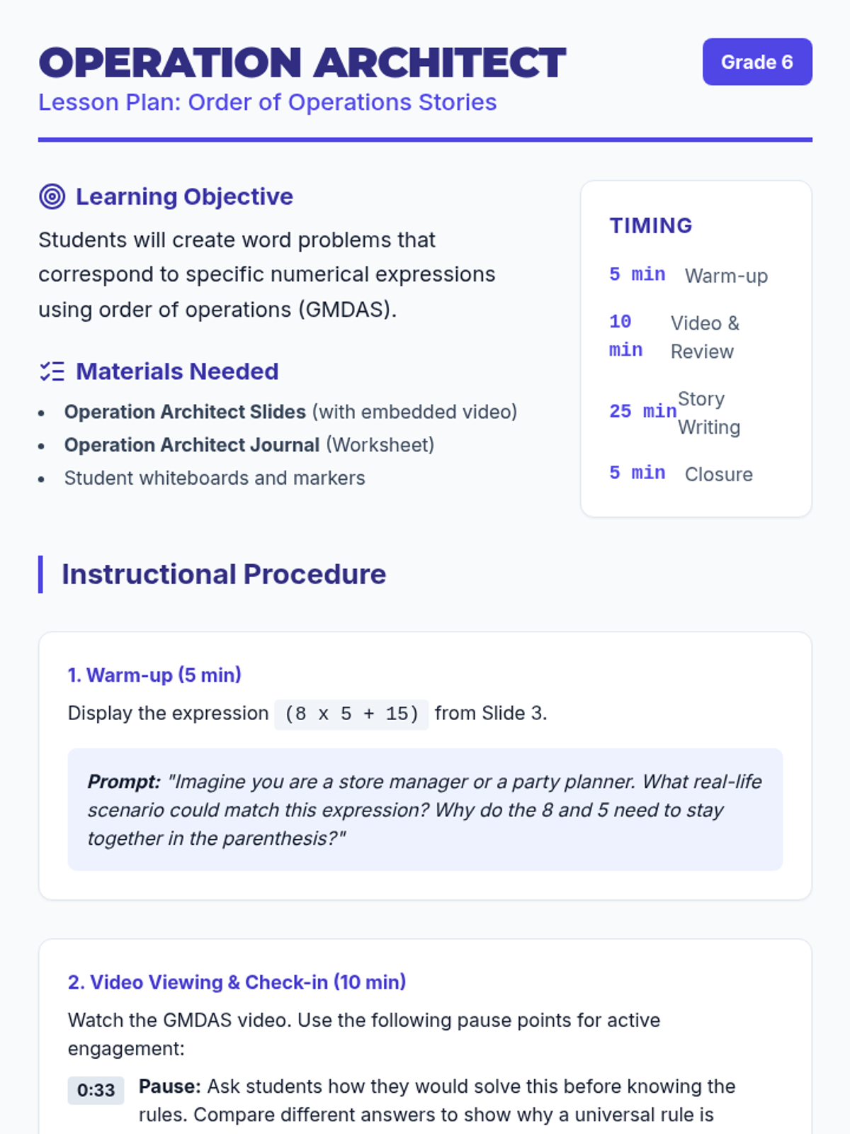 Students will learn to translate complex numerical expressions into realistic real-world scenarios, reinforcing their understanding of the order of operations (GMDAS). This lesson uses a step-by-step video review followed by a creative writing activity where students draft and peer-solve math stories.