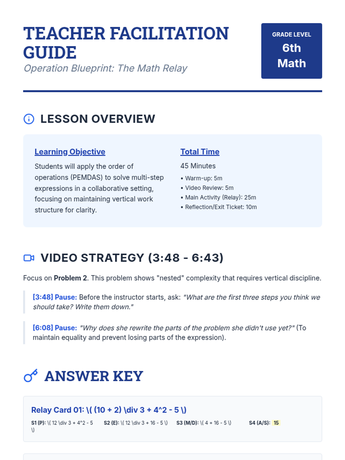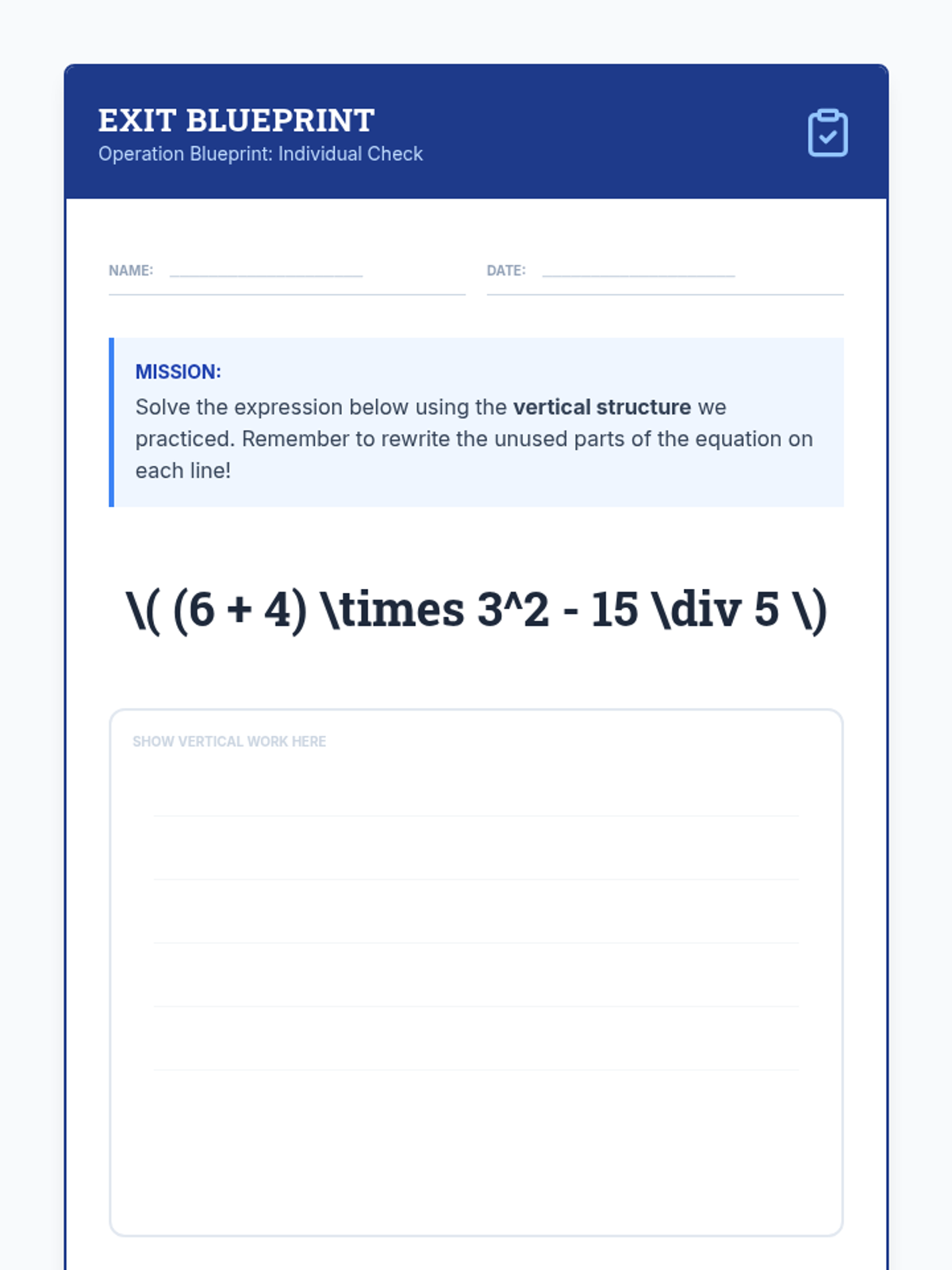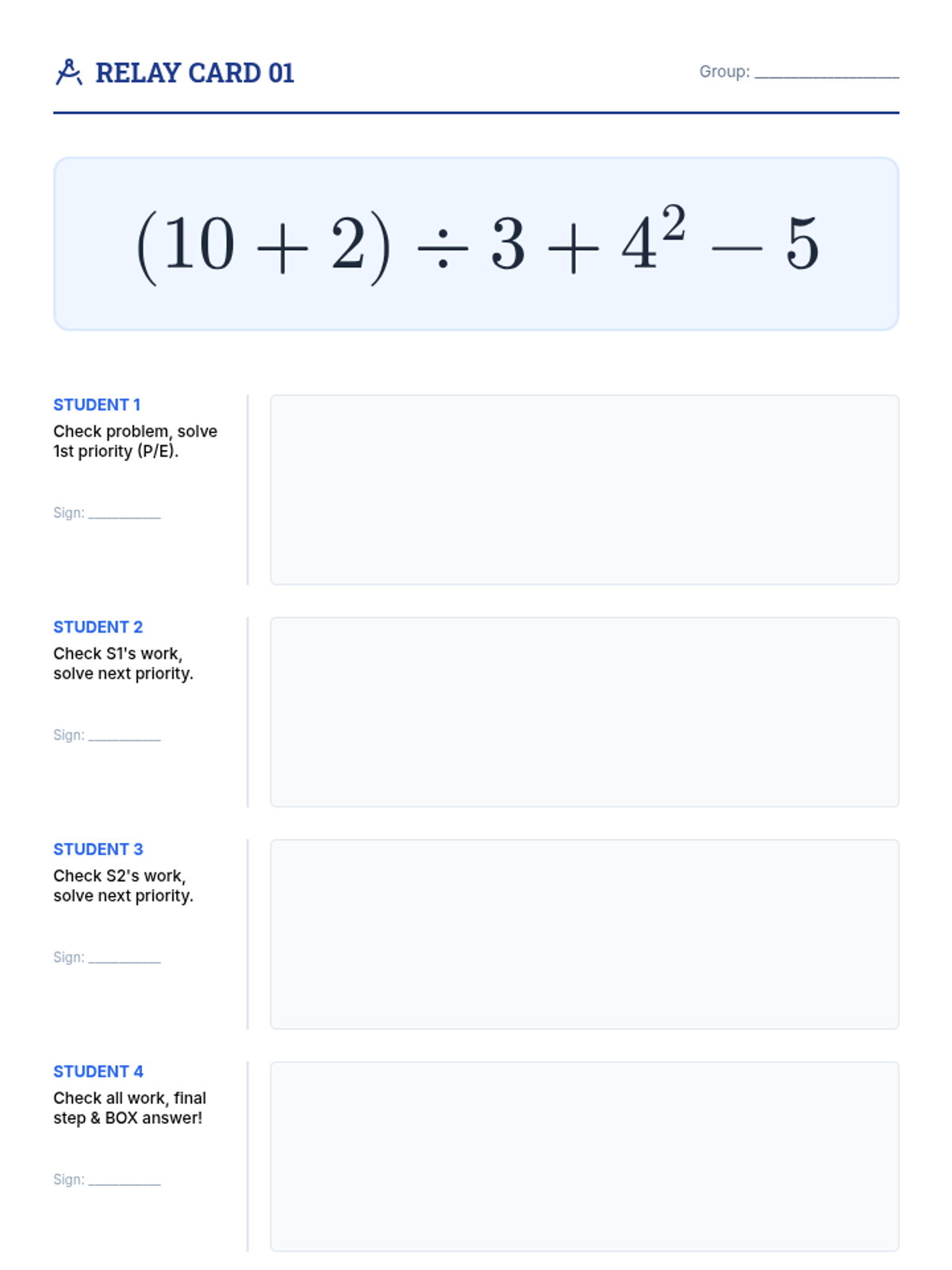 A 6th-grade math lesson focused on applying the order of operations (PEMDAS) through a collaborative relay activity, emphasizing vertical work structure and peer review.