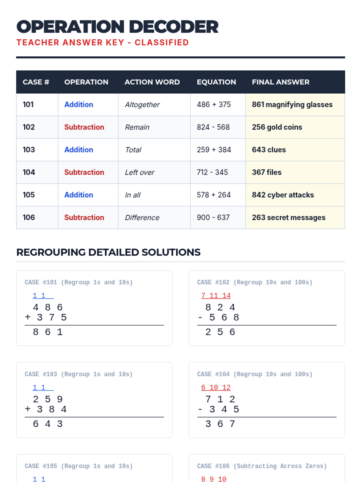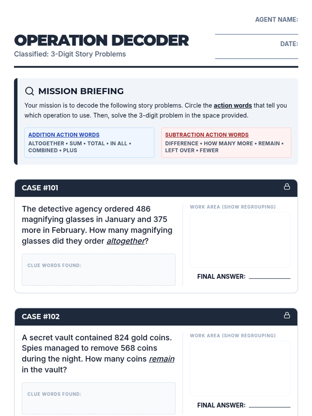 In this lesson, students become "Operation Decoders" to identify math action words that signal addition or subtraction in 3-digit story problems with regrouping.
