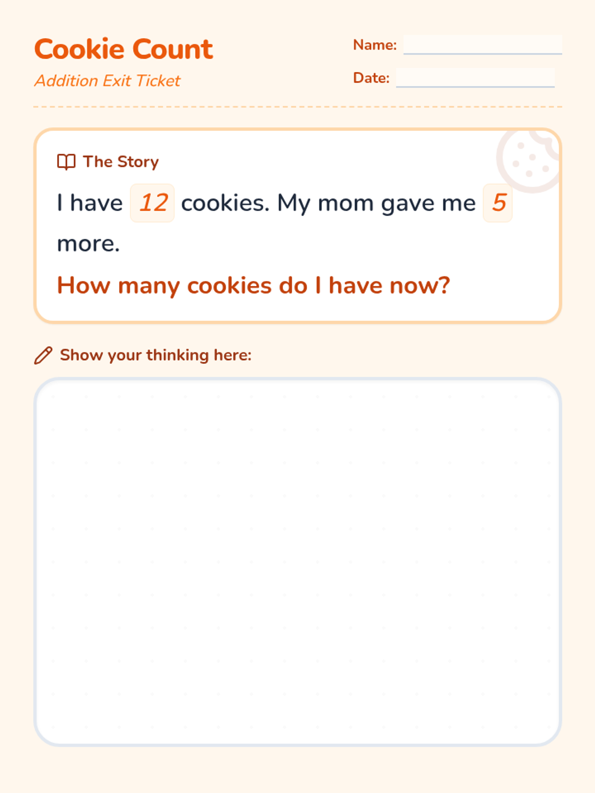 A foundational addition lesson for kindergarteners focused on word problems within 20, using a relatable cookie theme to build counting and modeling skills.