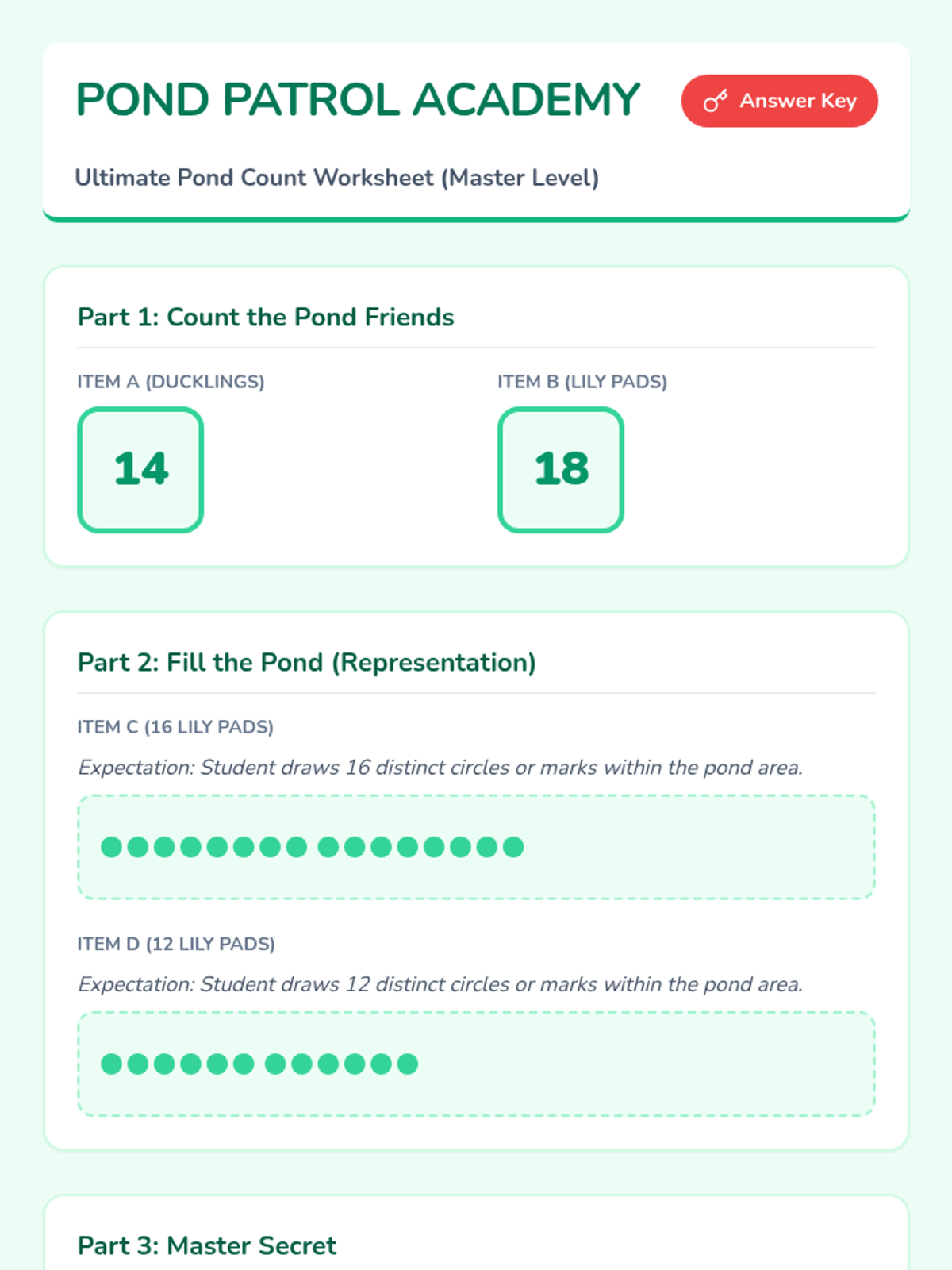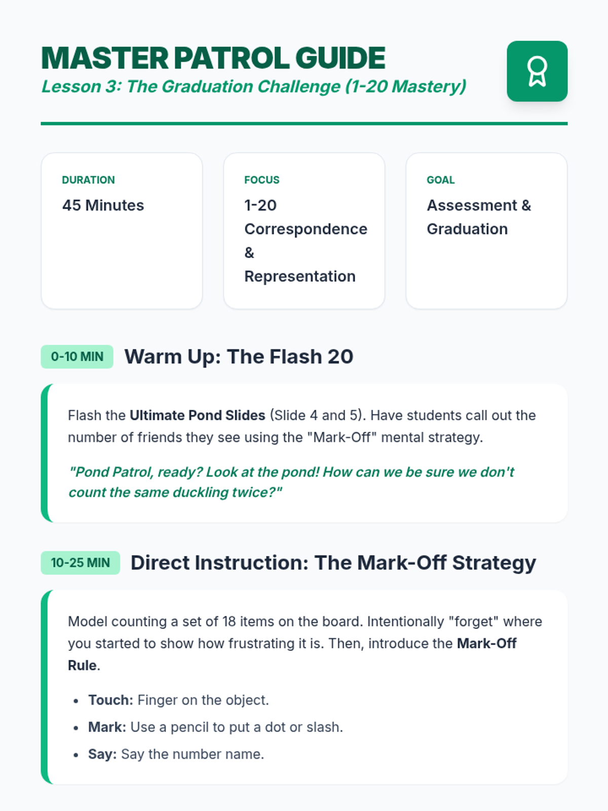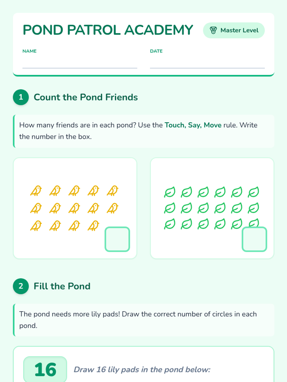 The final stage of the Pond Patrol Academy, where students demonstrate mastery of counting and representing numbers from 1 to 20. This lesson focuses on accuracy with larger sets and fluidly moving between numerals and quantities.