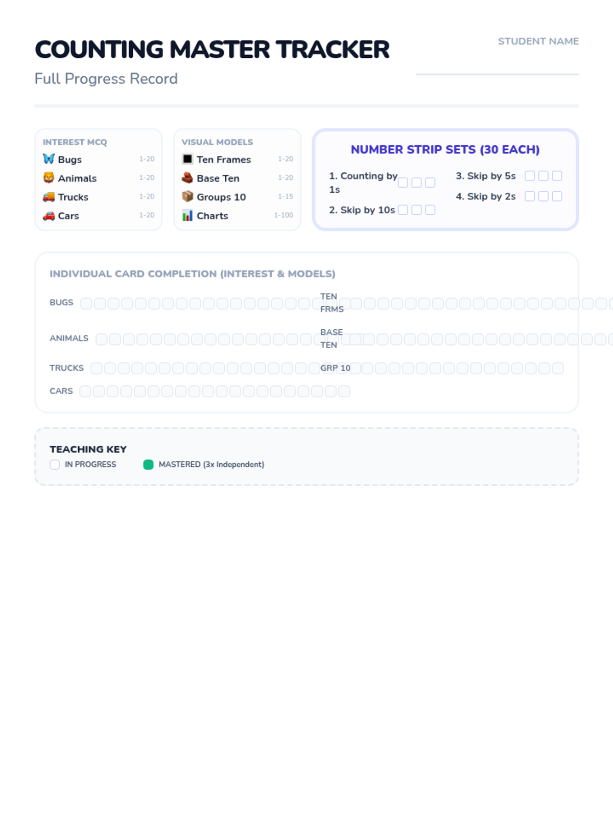 A comprehensive set of counting task cards focusing on identical items up to 20, designed for children with autism using clear visuals and predictable layouts across four high-interest themes: bugs, animals, trucks, and cars.