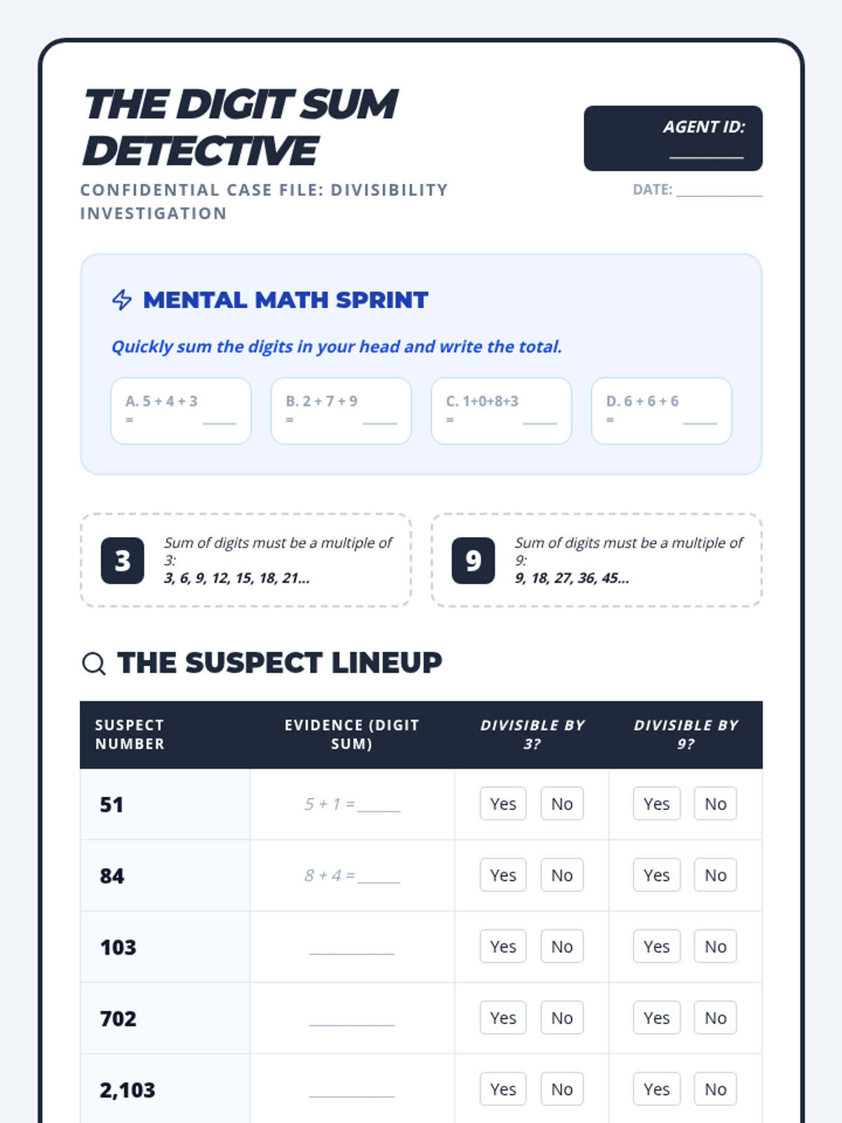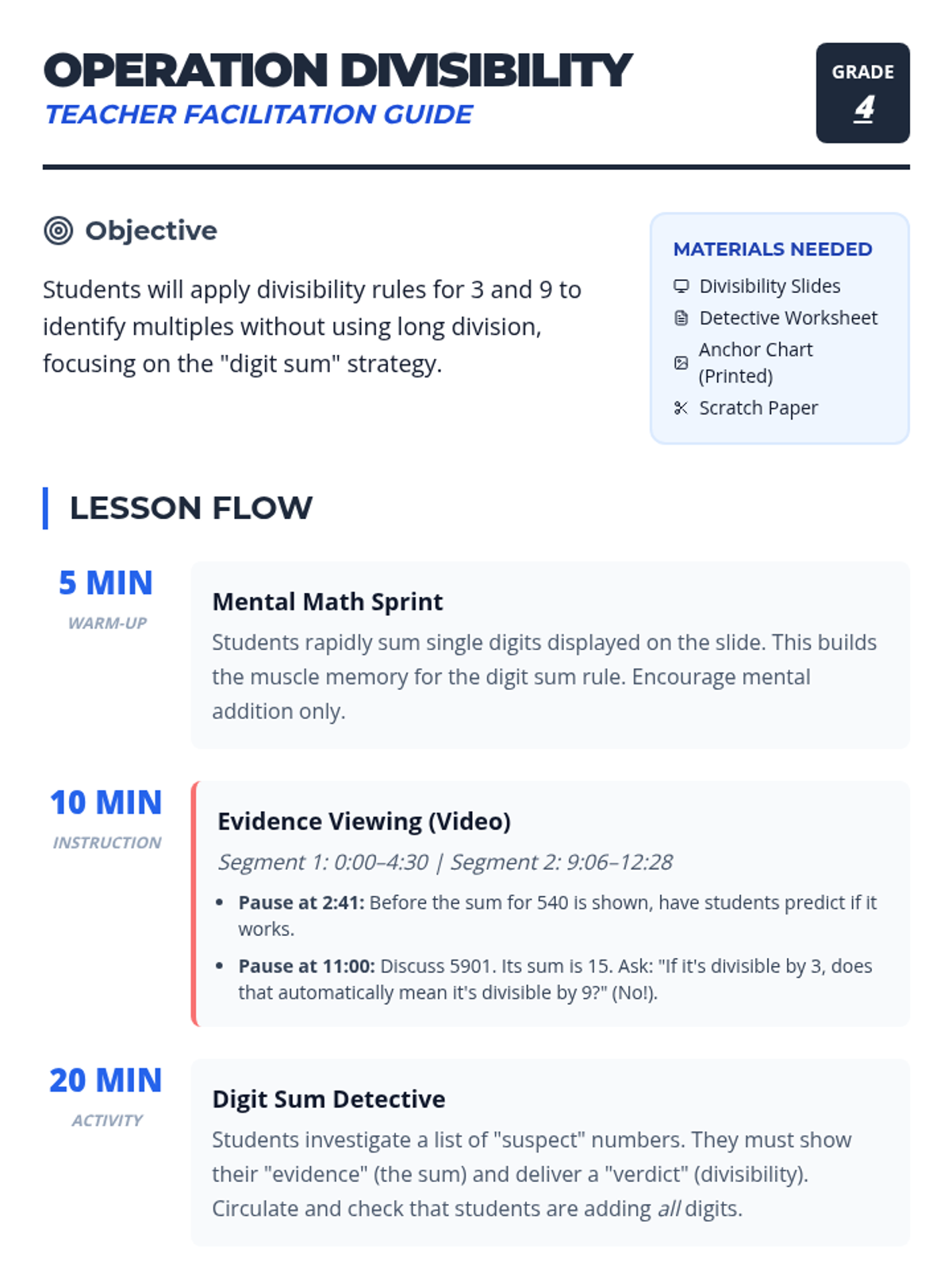 A detective-themed math lesson where 4th graders master divisibility rules for 3 and 9 using digit sums, featuring a visual presentation, a case-file worksheet, and an anchor chart.