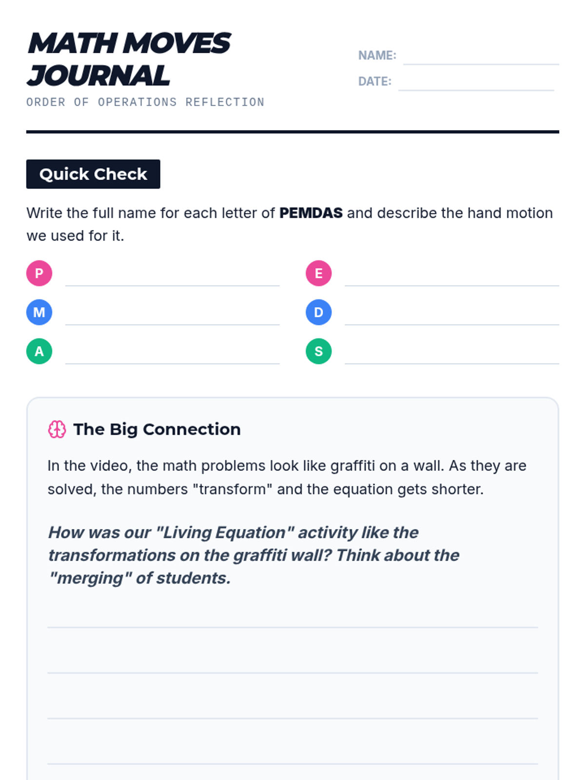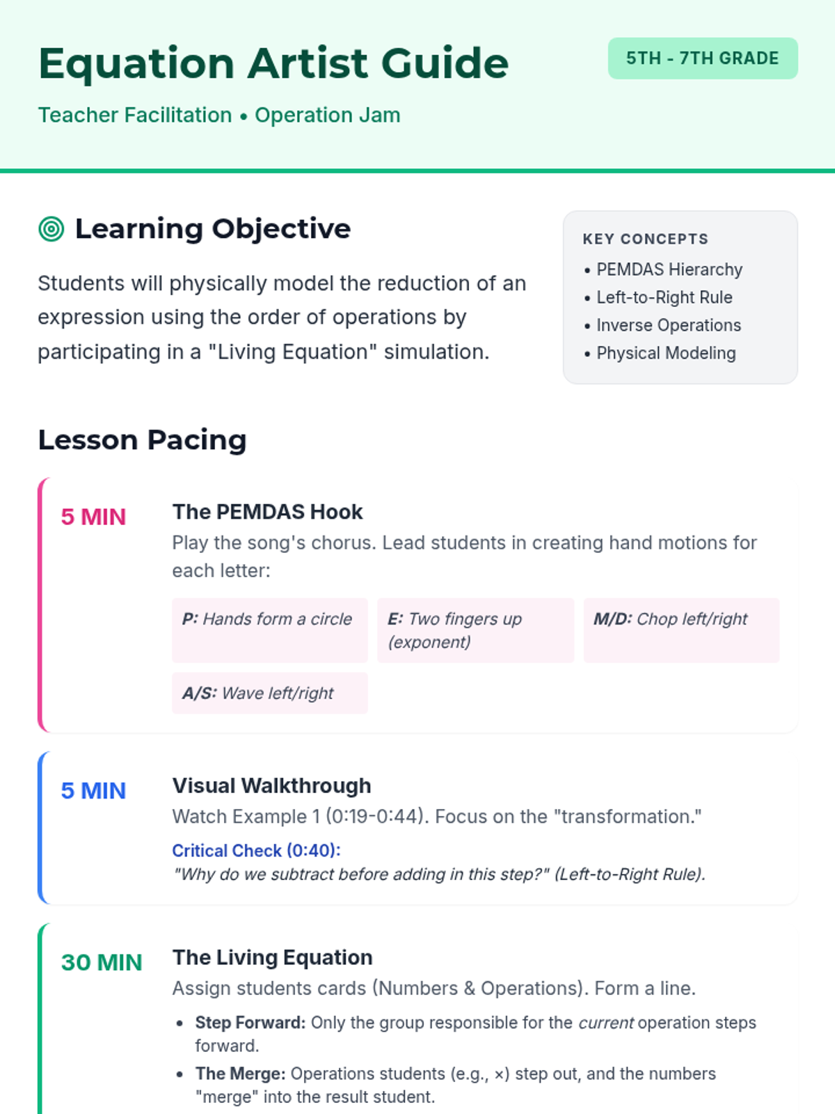 A kinesthetic lesson where students physically model the order of operations through hand motions and a "living equation" activity based on a math rap video.
