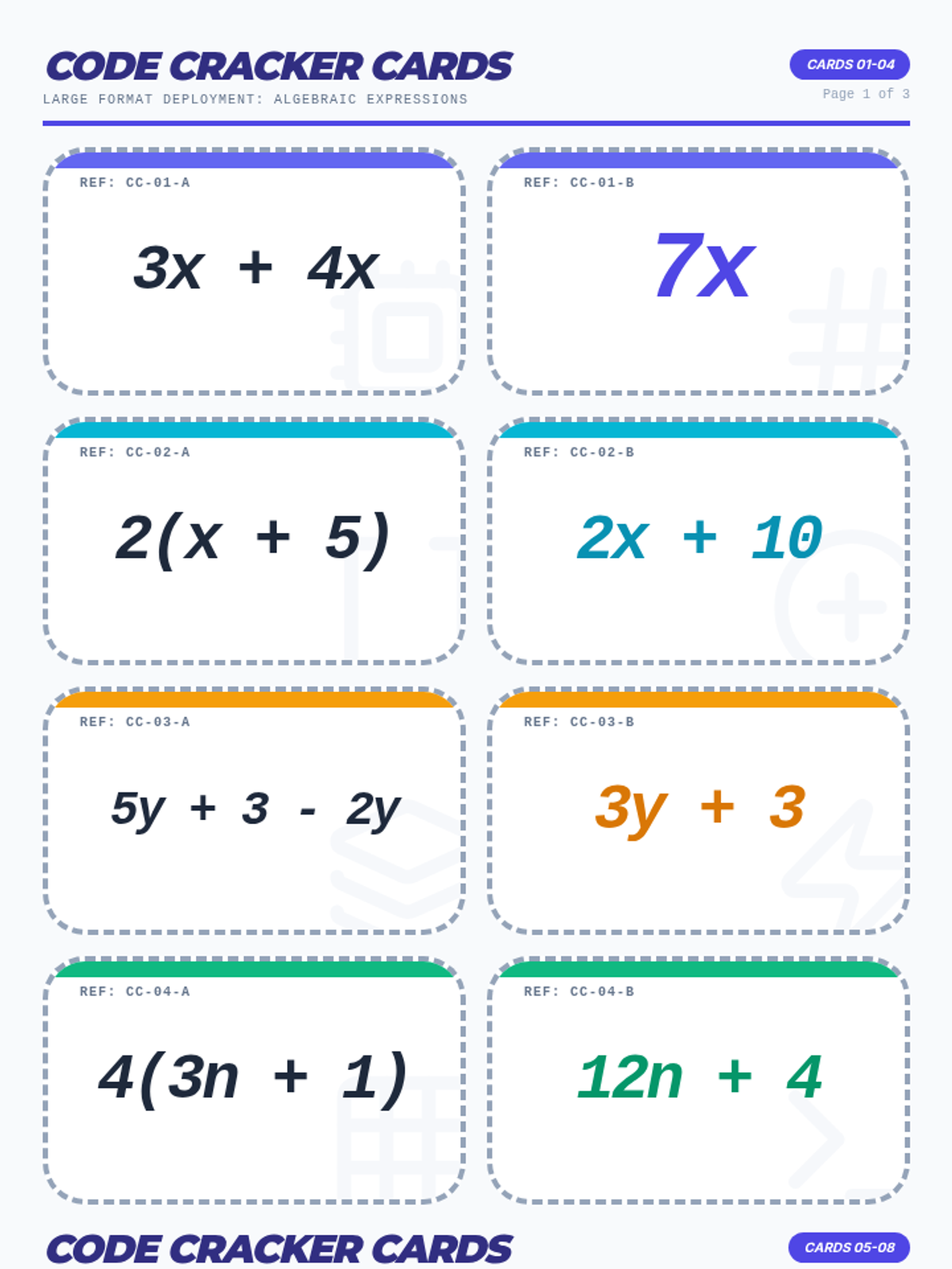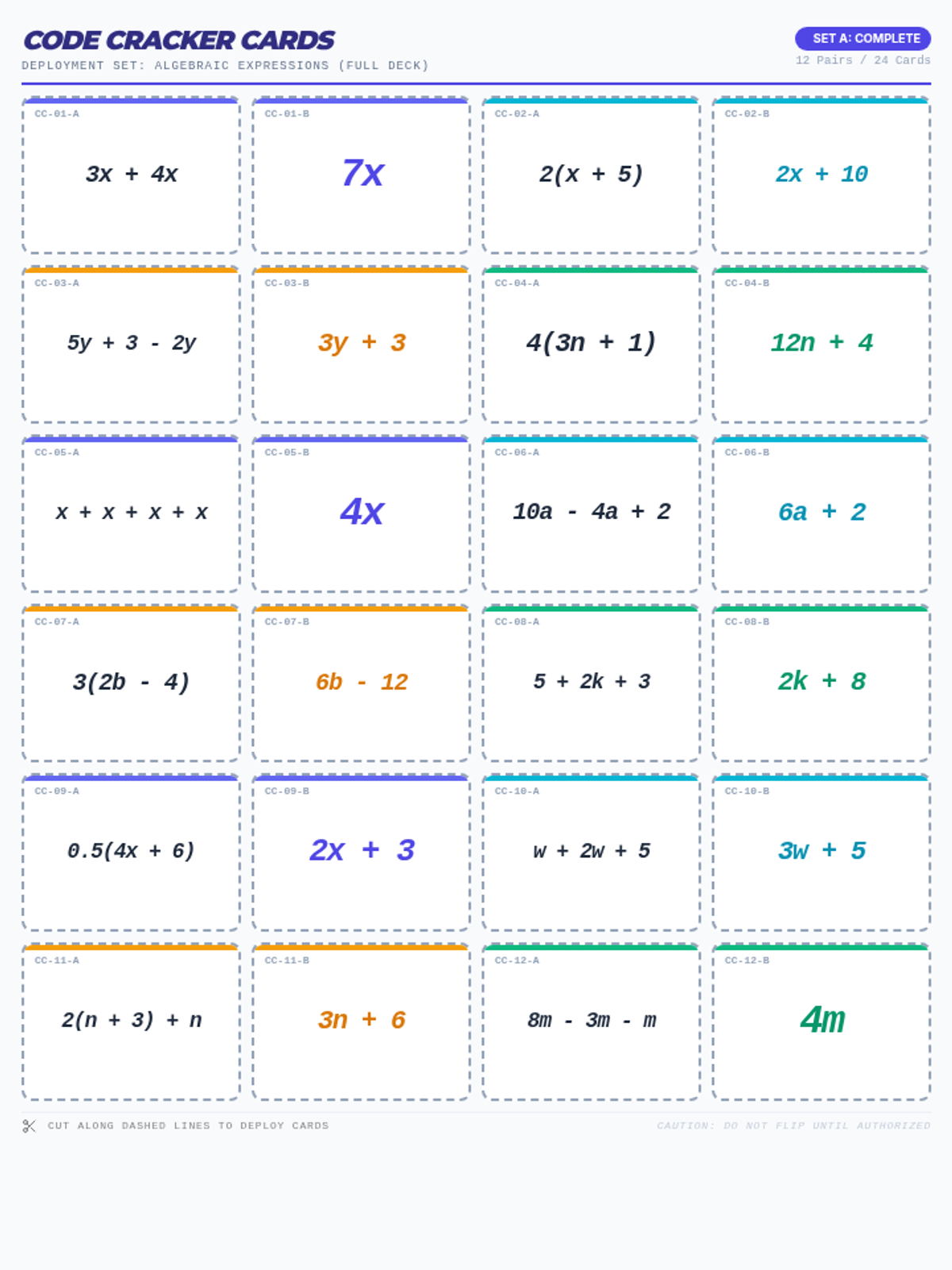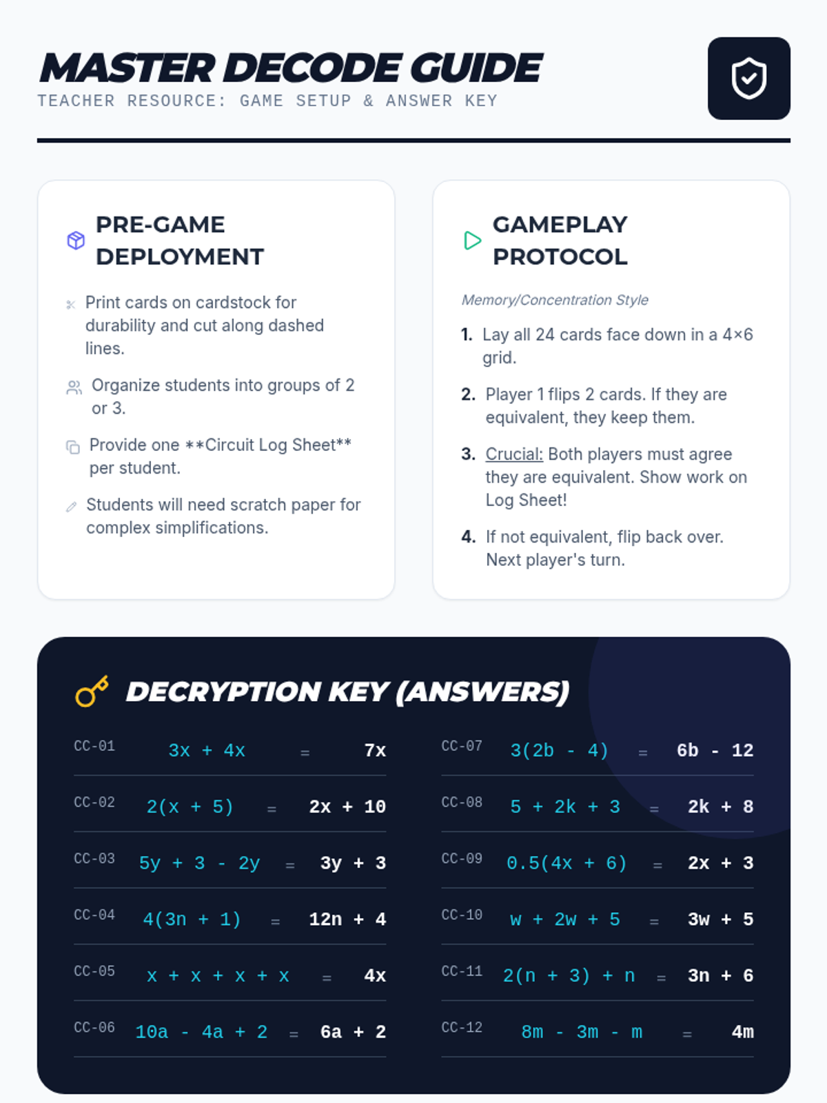 Students practice simplifying algebraic expressions and identifying equivalent expressions through a collaborative card-matching game. They will combine like terms and use the distributive property to 'decode' complex expressions into their simplest forms.