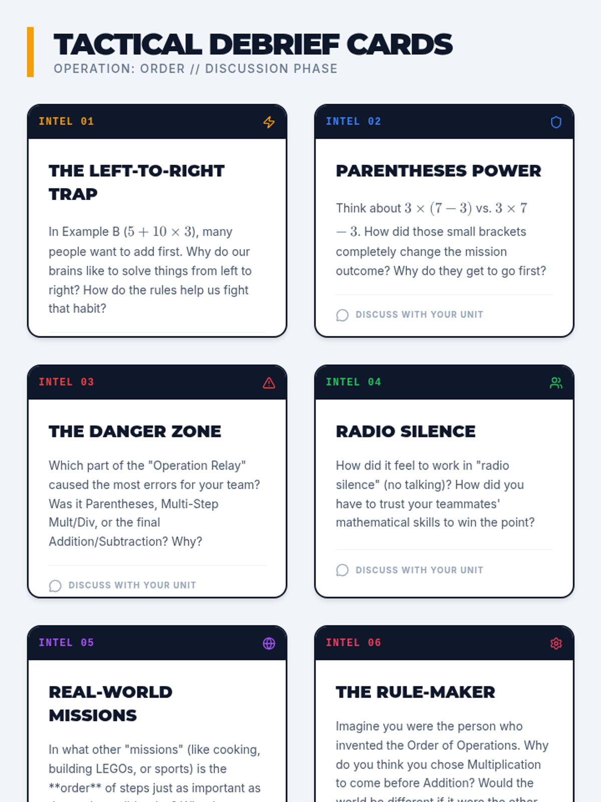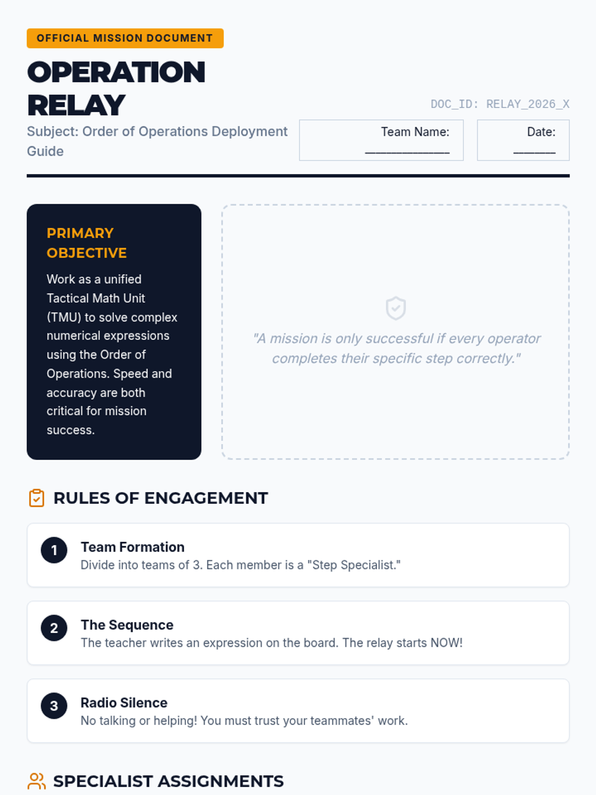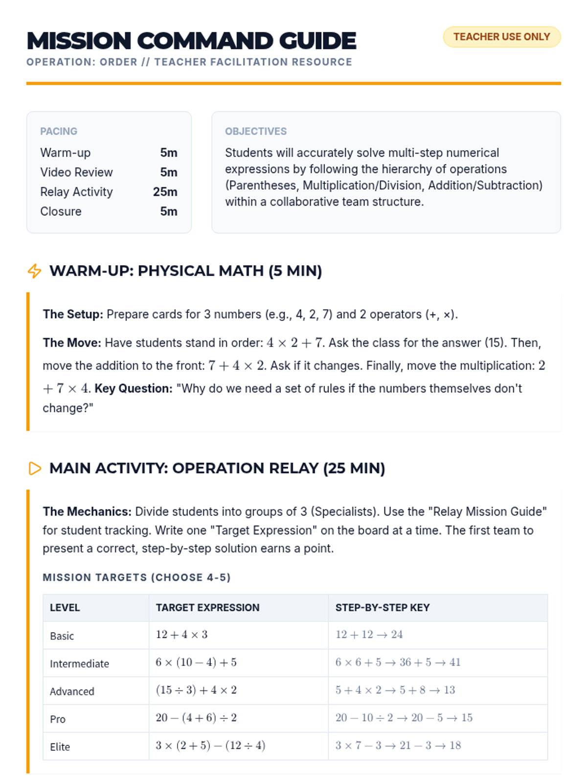 A collaborative lesson for 4th-6th graders to master the order of operations through a physical warm-up, video review, and a team-based relay activity. Students learn to navigate parentheses, multiplication/division, and addition/subtraction in the correct sequence.