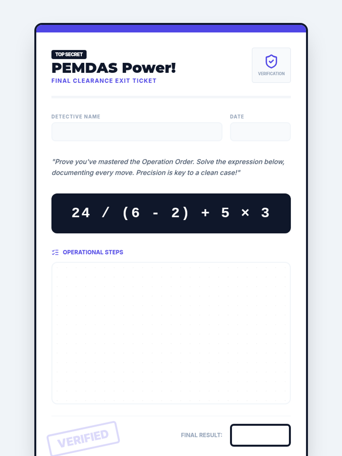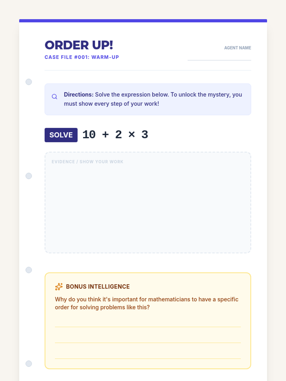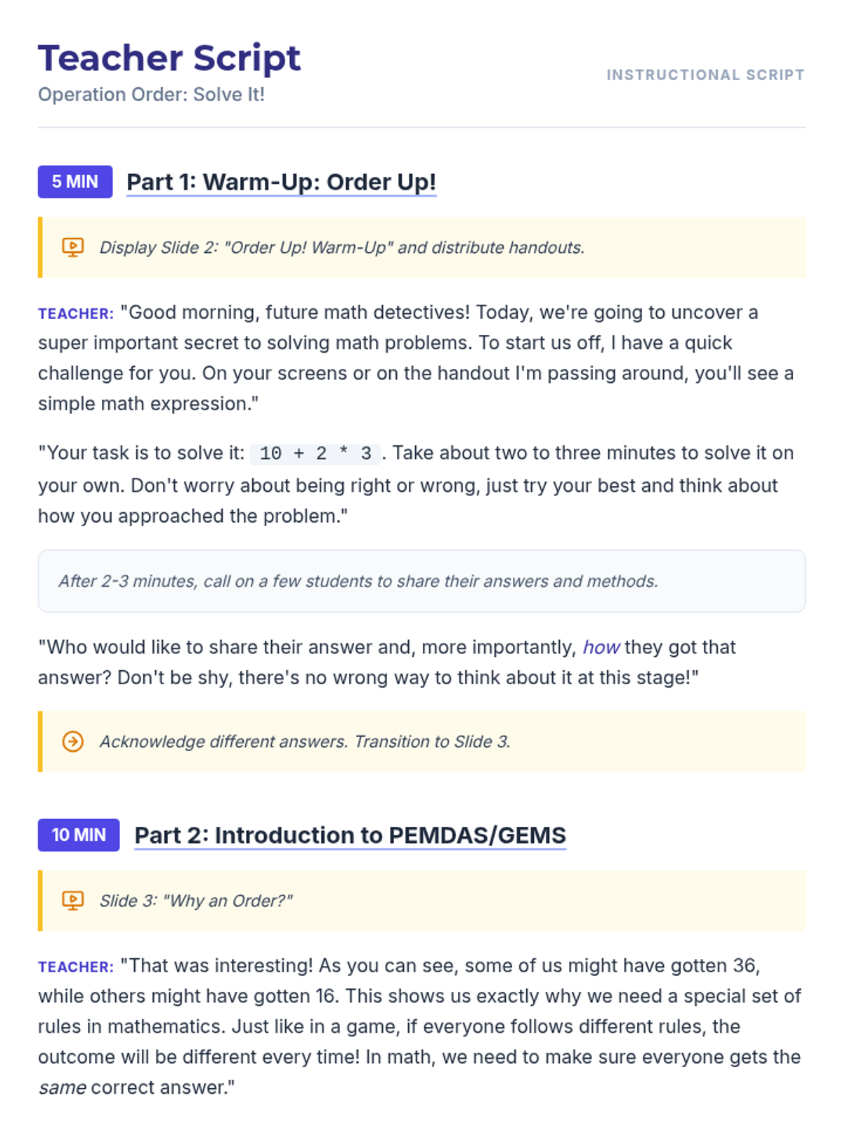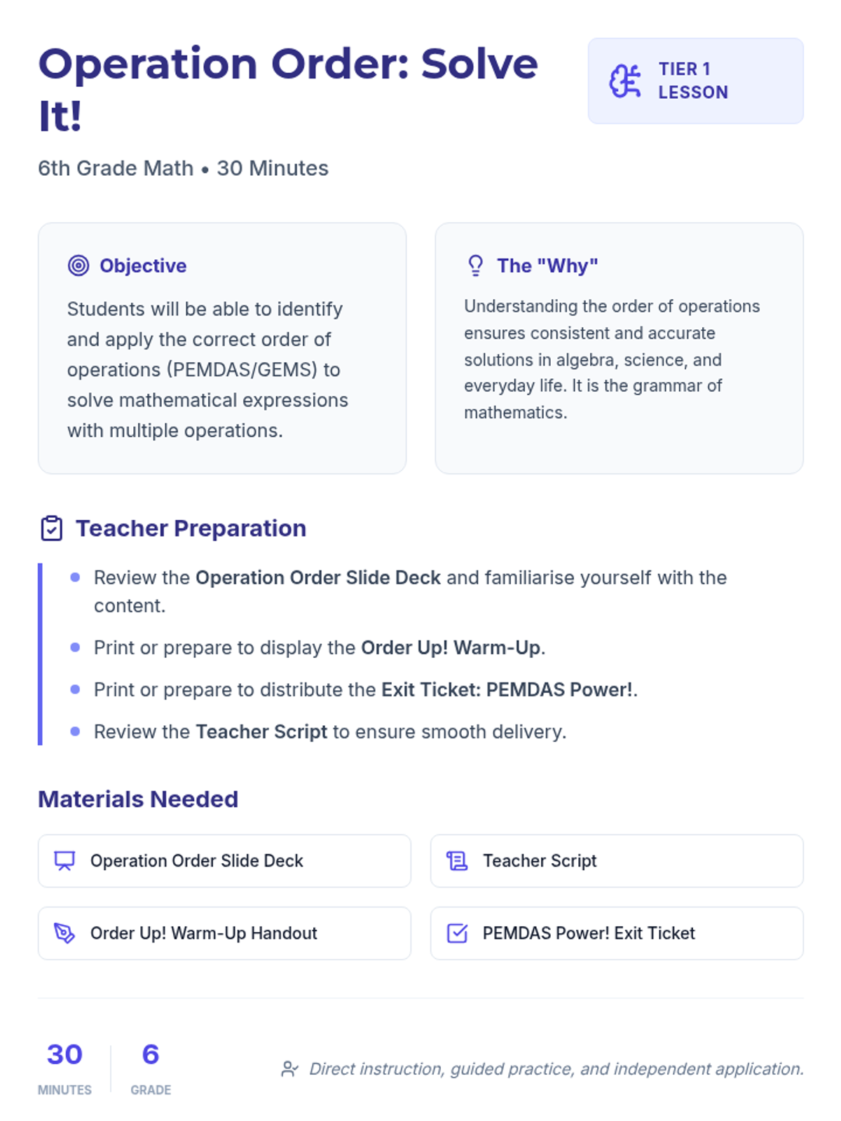 A 30-minute Tier 1 lesson for 6th-grade students to master the order of operations using PEMDAS/GEMS. Students will explore the necessity of a standard order and practice solving expressions through direct instruction and guided examples.