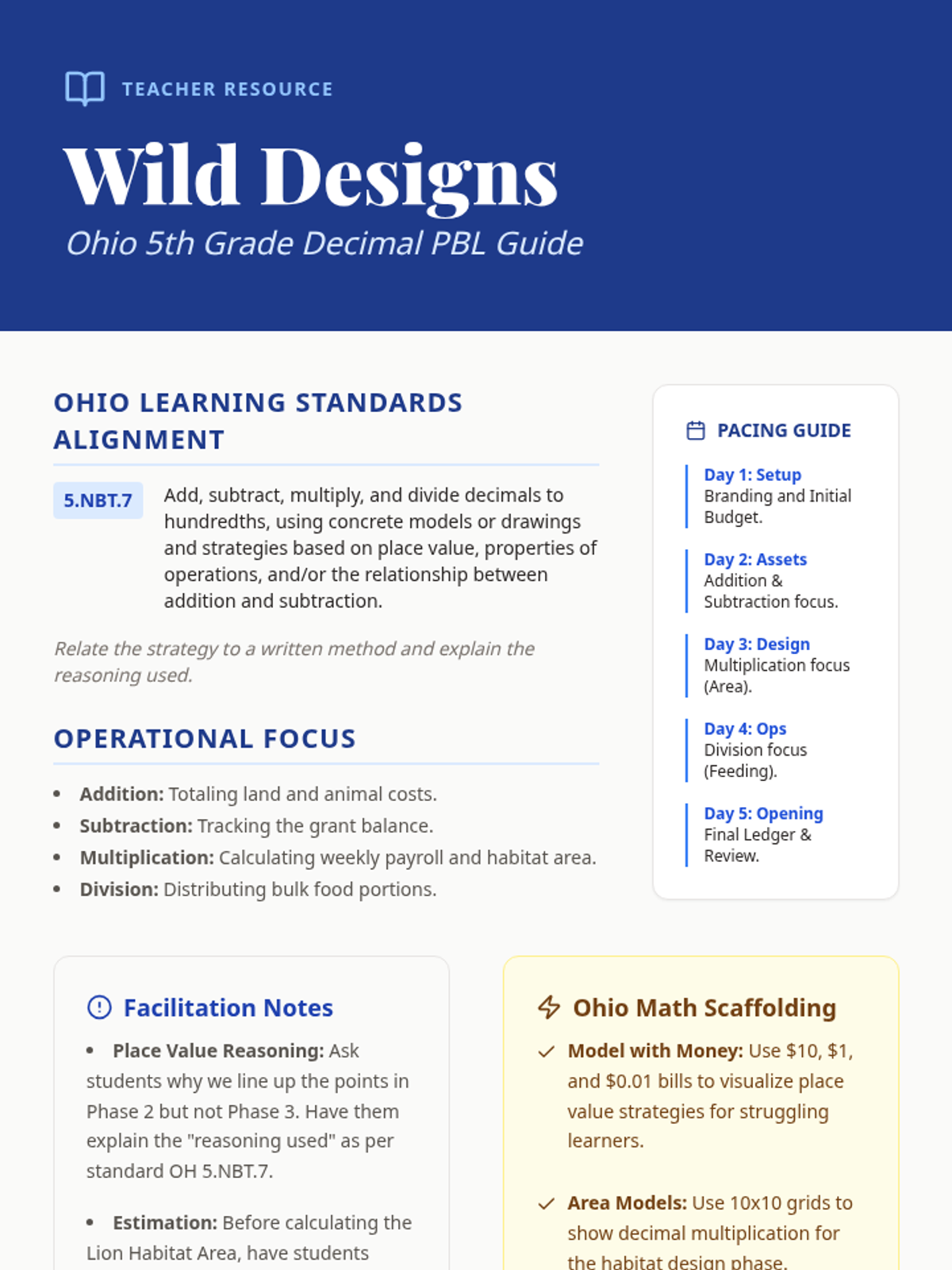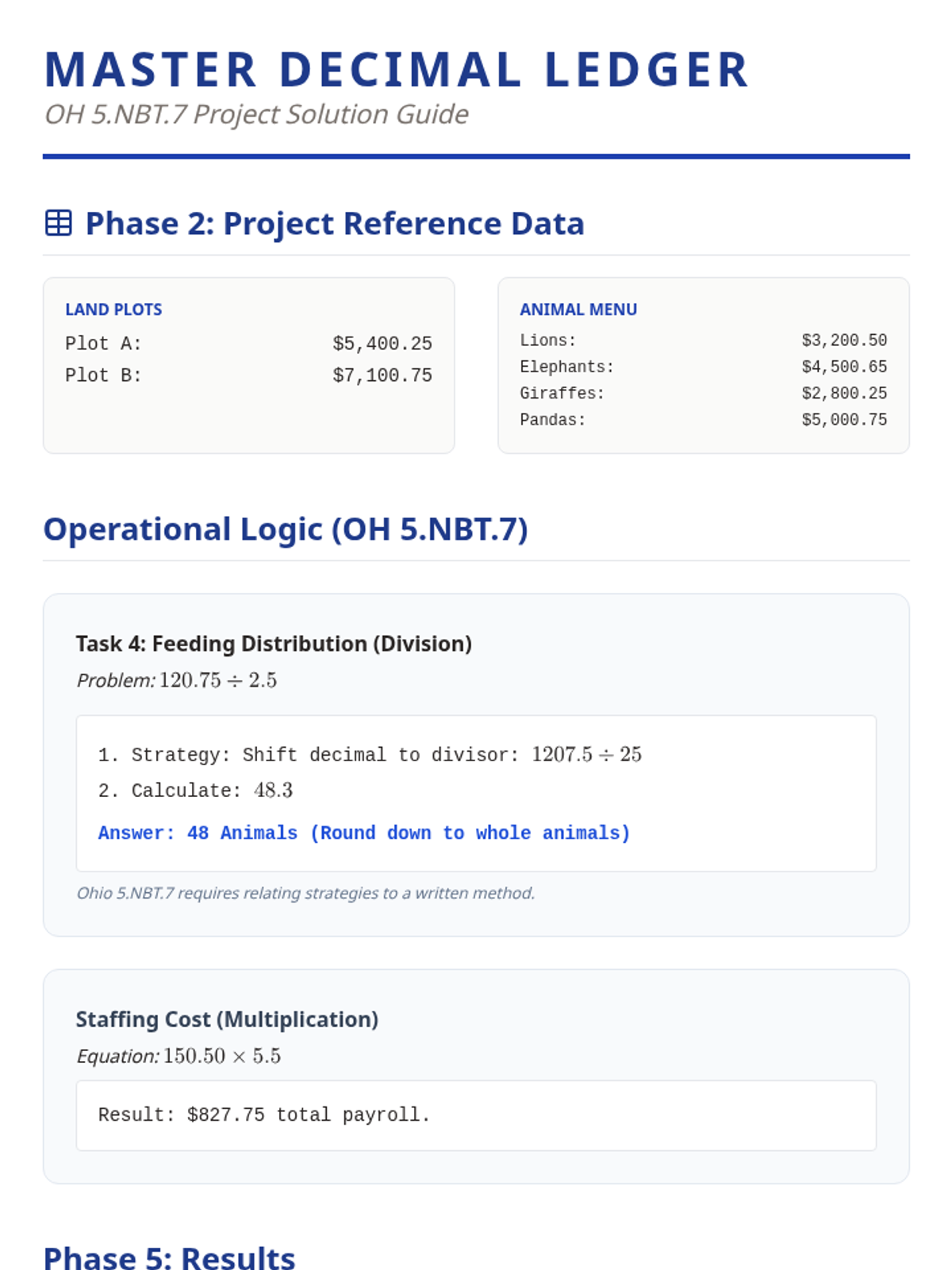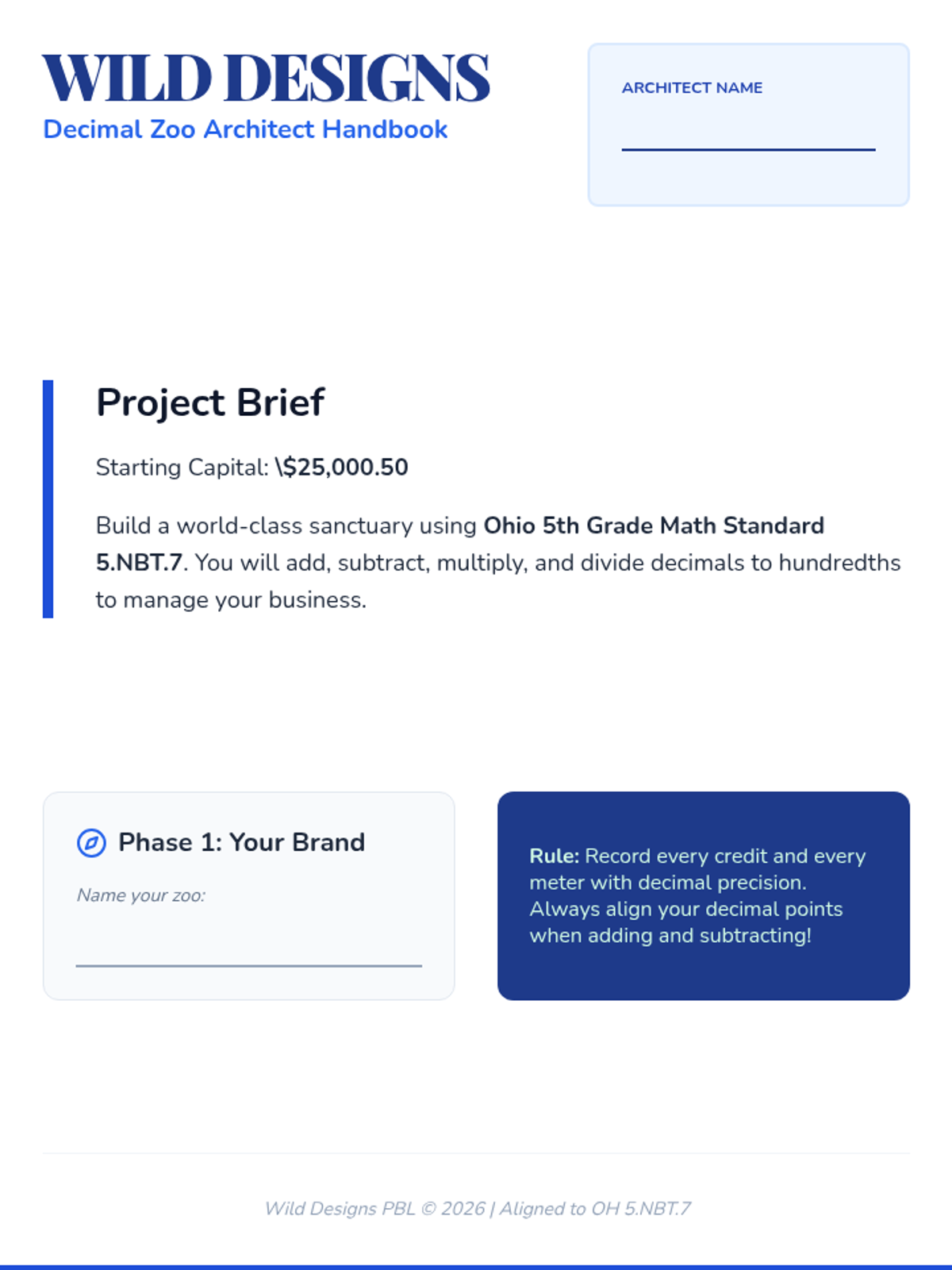 A project-based learning unit where students apply decimal operations (addition, subtraction, multiplication, and division to hundredths) to design, build, and manage their own zoo. Aligned to Ohio 5th Grade Standard 5.NBT.7.