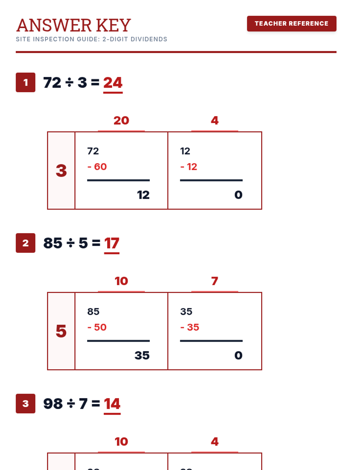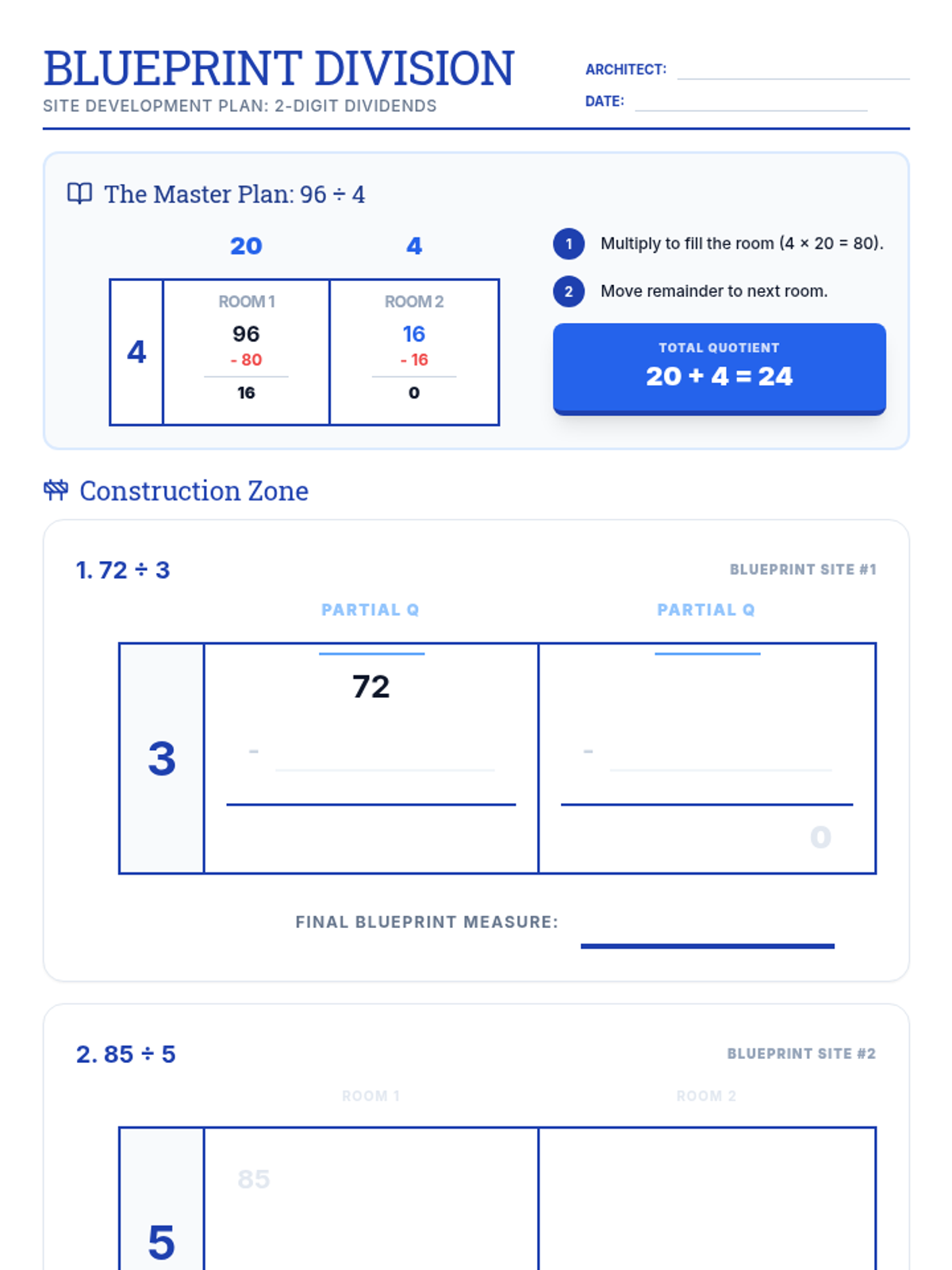 A step-by-step guide to mastering long division using the Area Model (Box Method), connecting multiplication and division through architectural blueprints. Students learn to deconstruct numbers into manageable parts to solve complex division problems without remainders.