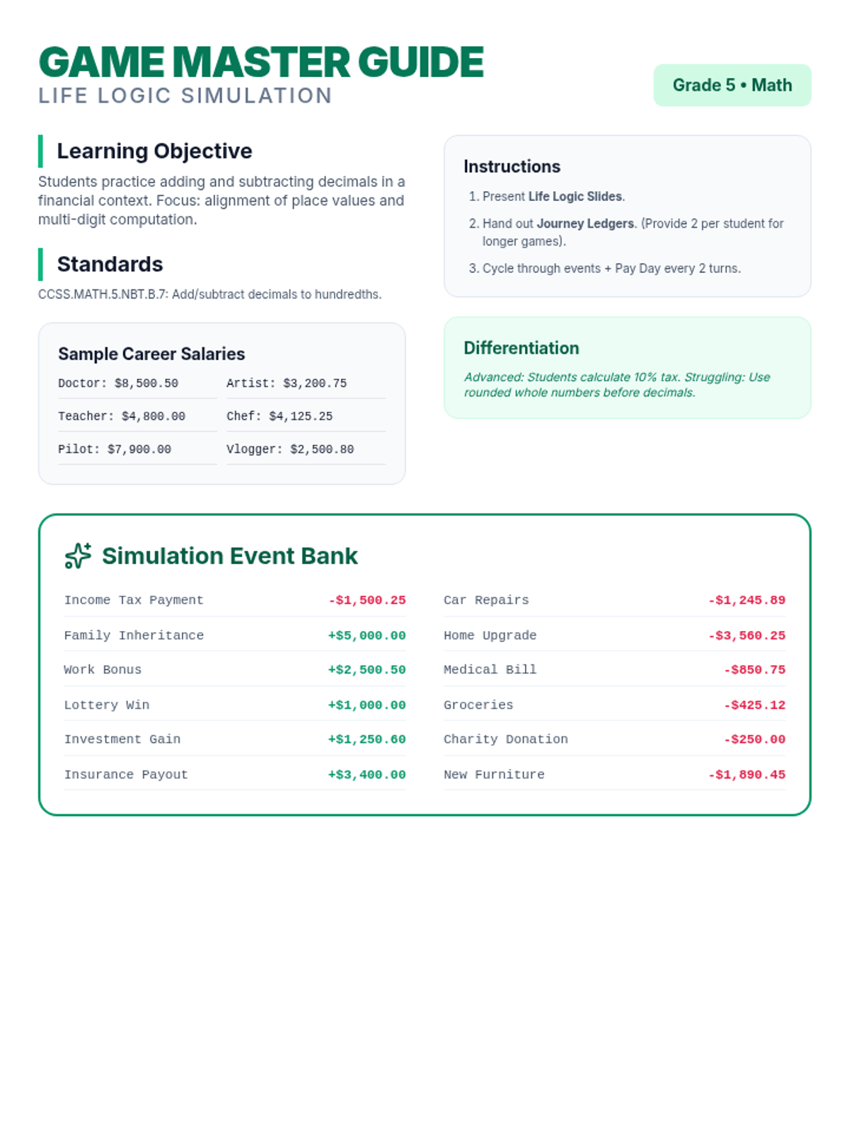 A comprehensive introduction to the classic board game 'Life', focusing on financial literacy and multi-digit decimal operations. Students learn the game mechanics and prepare for a project where they simulate their own financial journey.