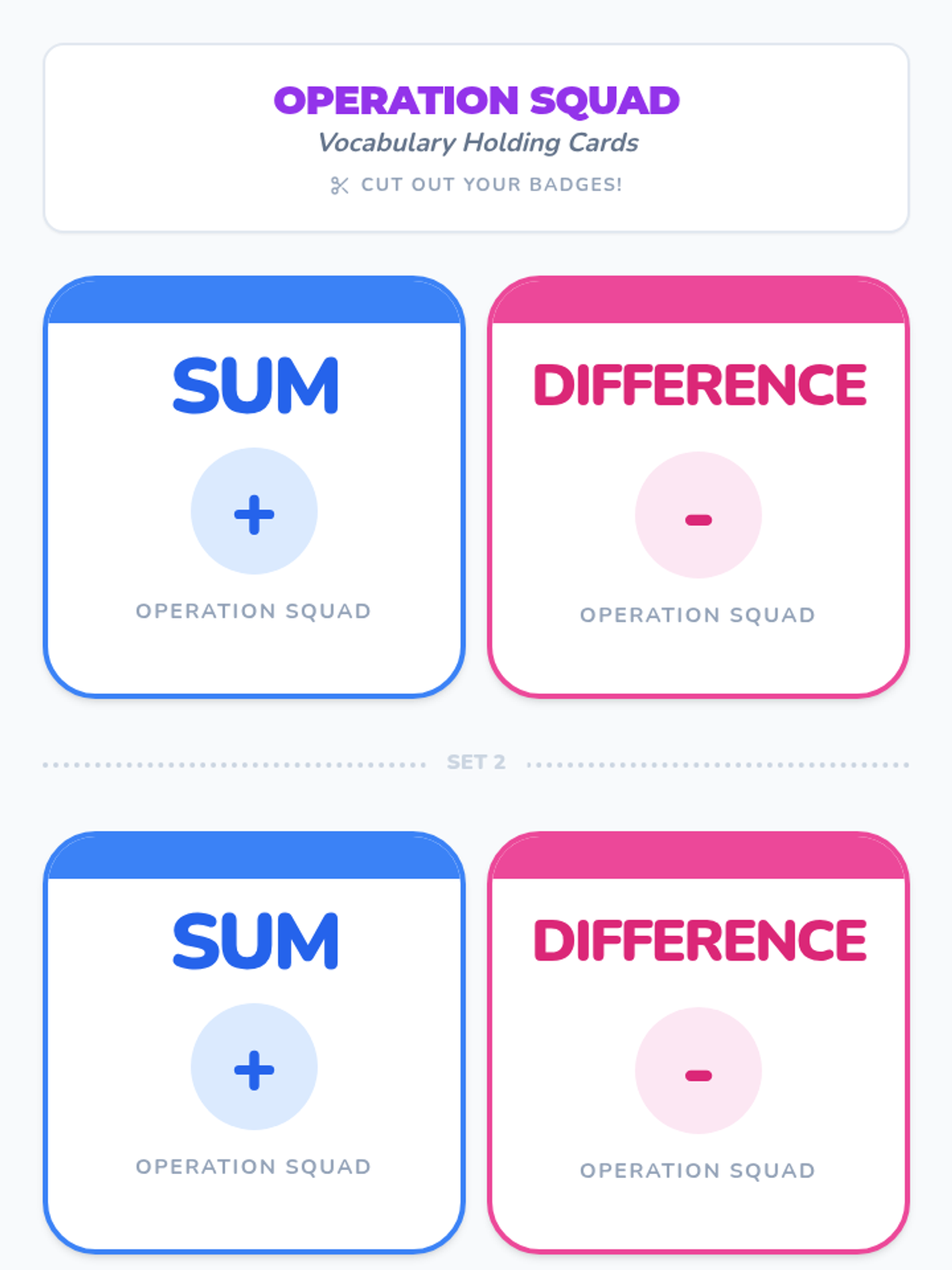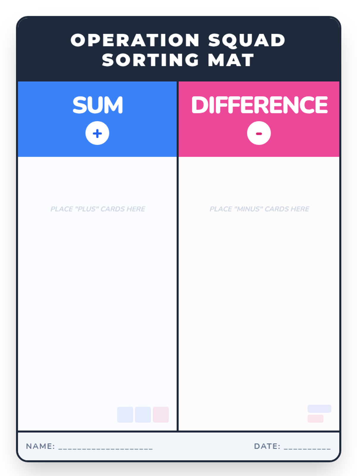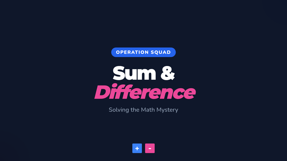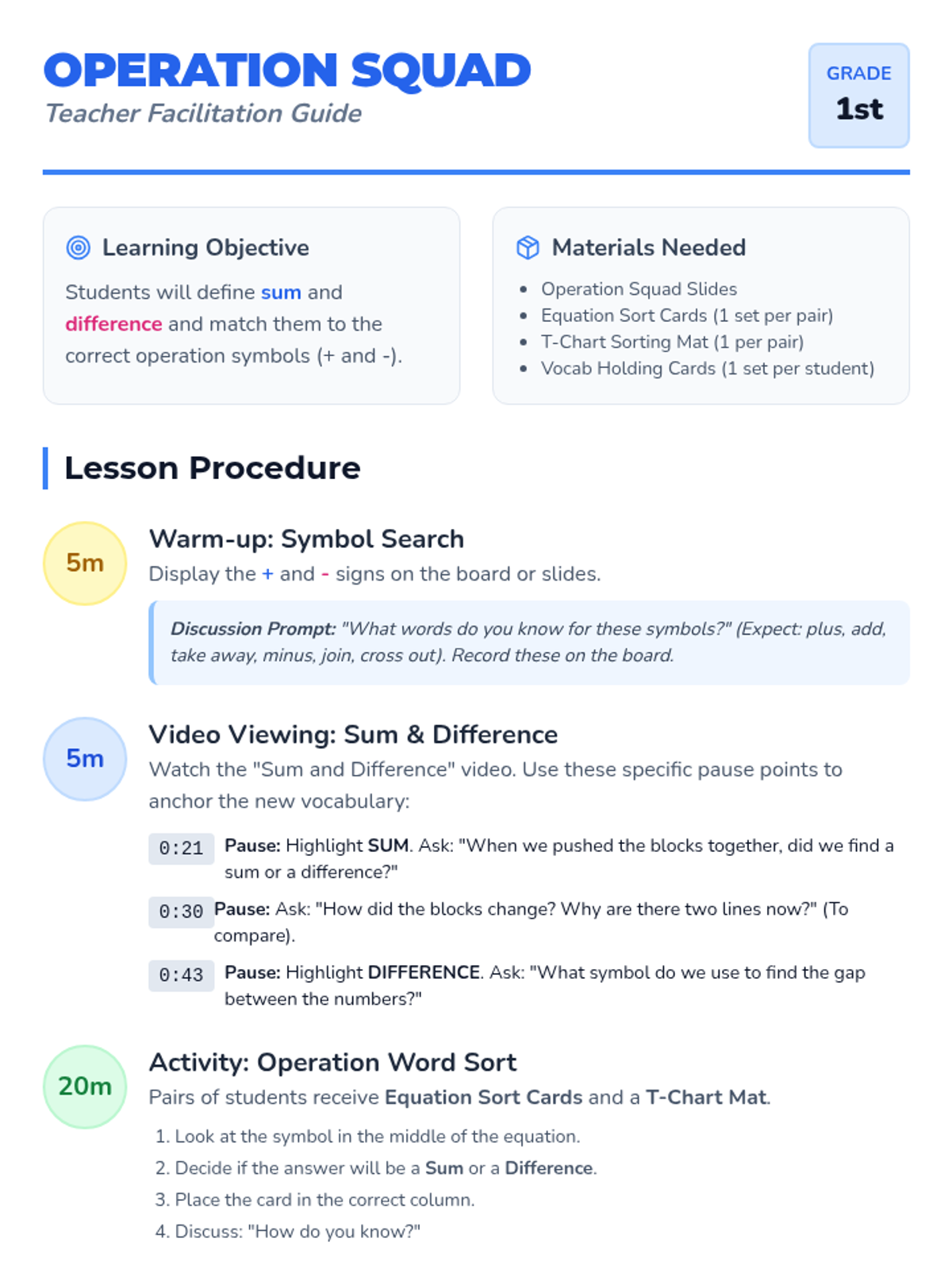 A 1st-grade introduction to addition and subtraction vocabulary, focusing on identifying 'sum' and 'difference' through visual models and hands-on sorting.