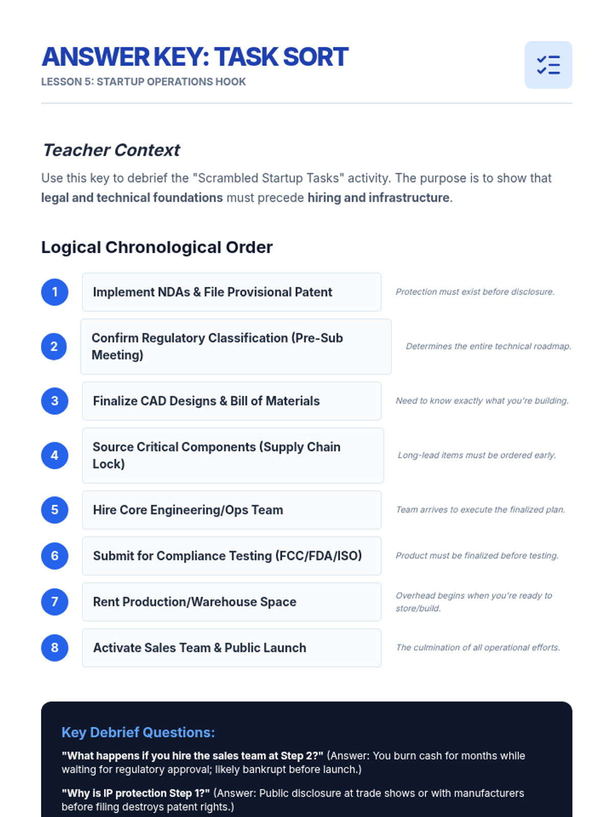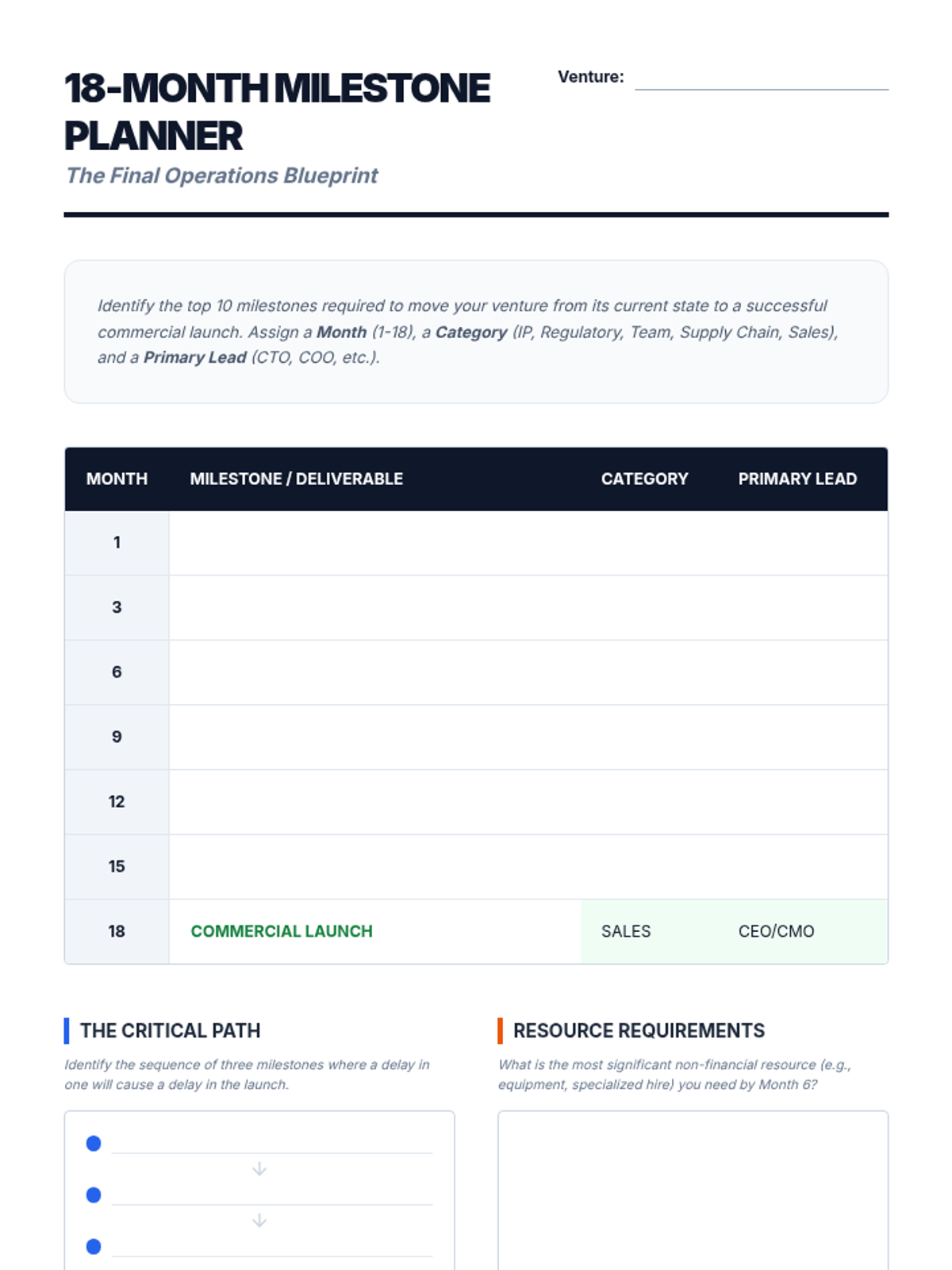 Students synthesize their operational findings into a 12-18 month timeline with key milestones, prioritizing activities and resource allocation.
