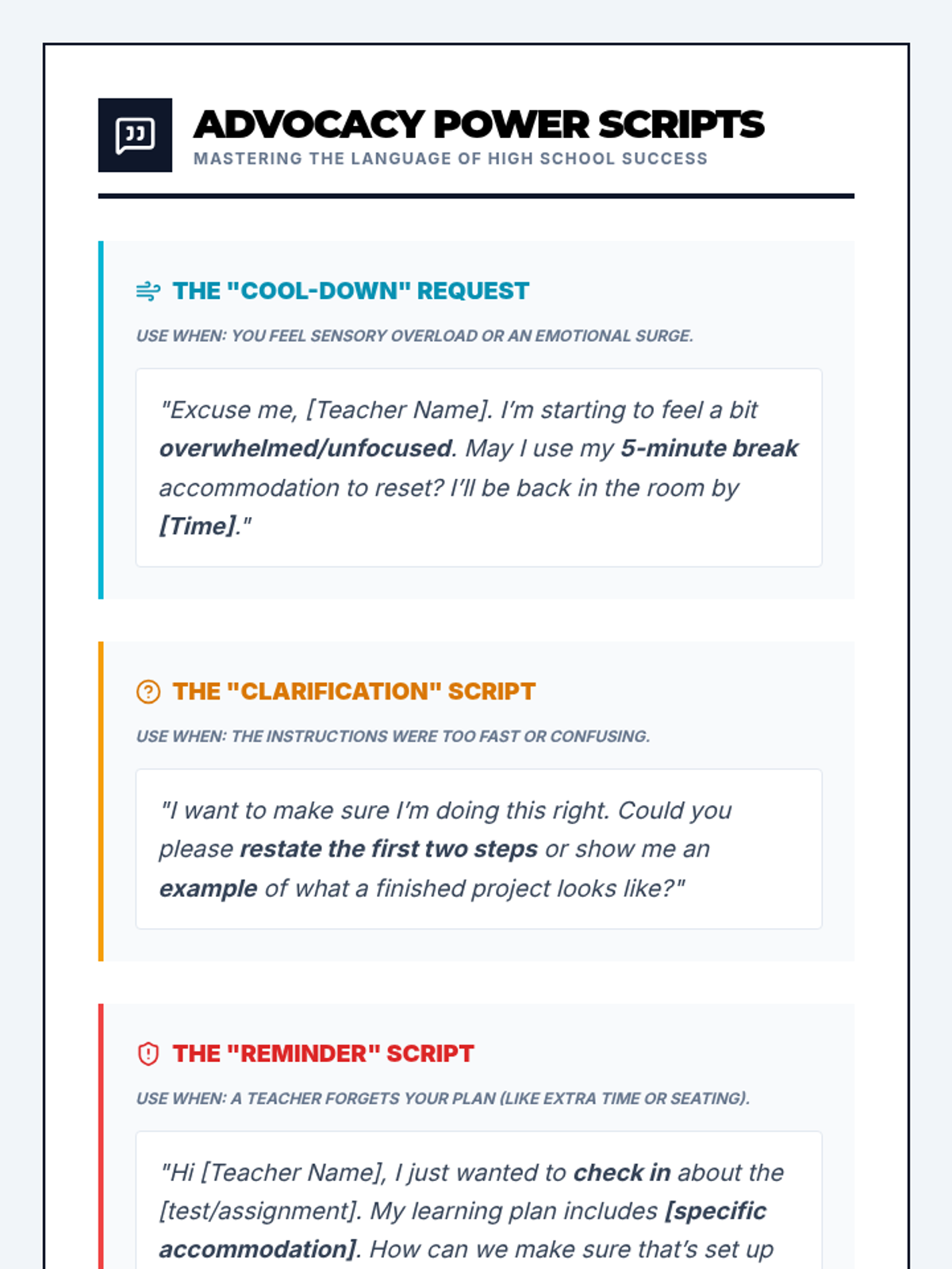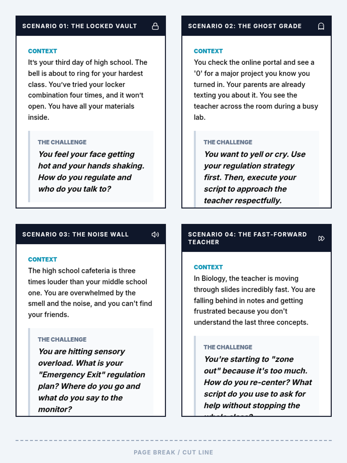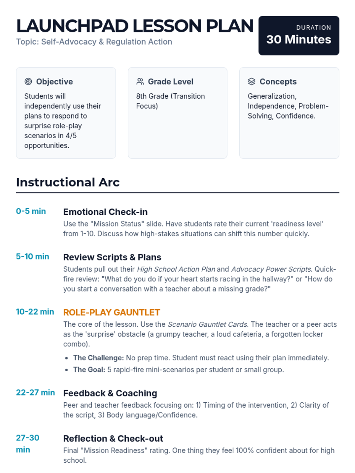 A high-energy, 30-minute lesson designed to help 8th-grade students generalize their self-regulation and advocacy skills through high-stakes role-play scenarios in preparation for high school. Students practice using their personalized plans and scripts to navigate 'surprise' challenges independently.