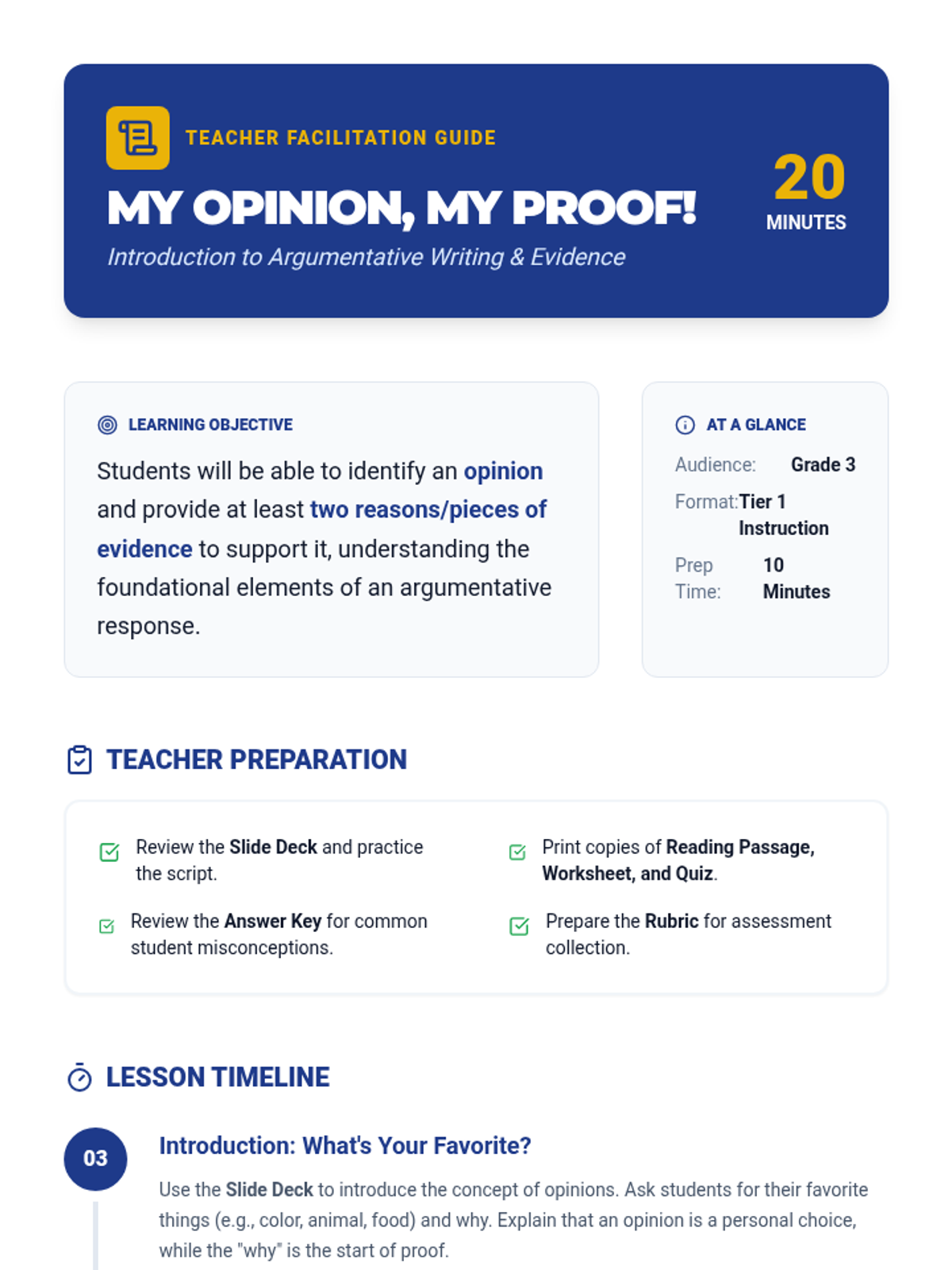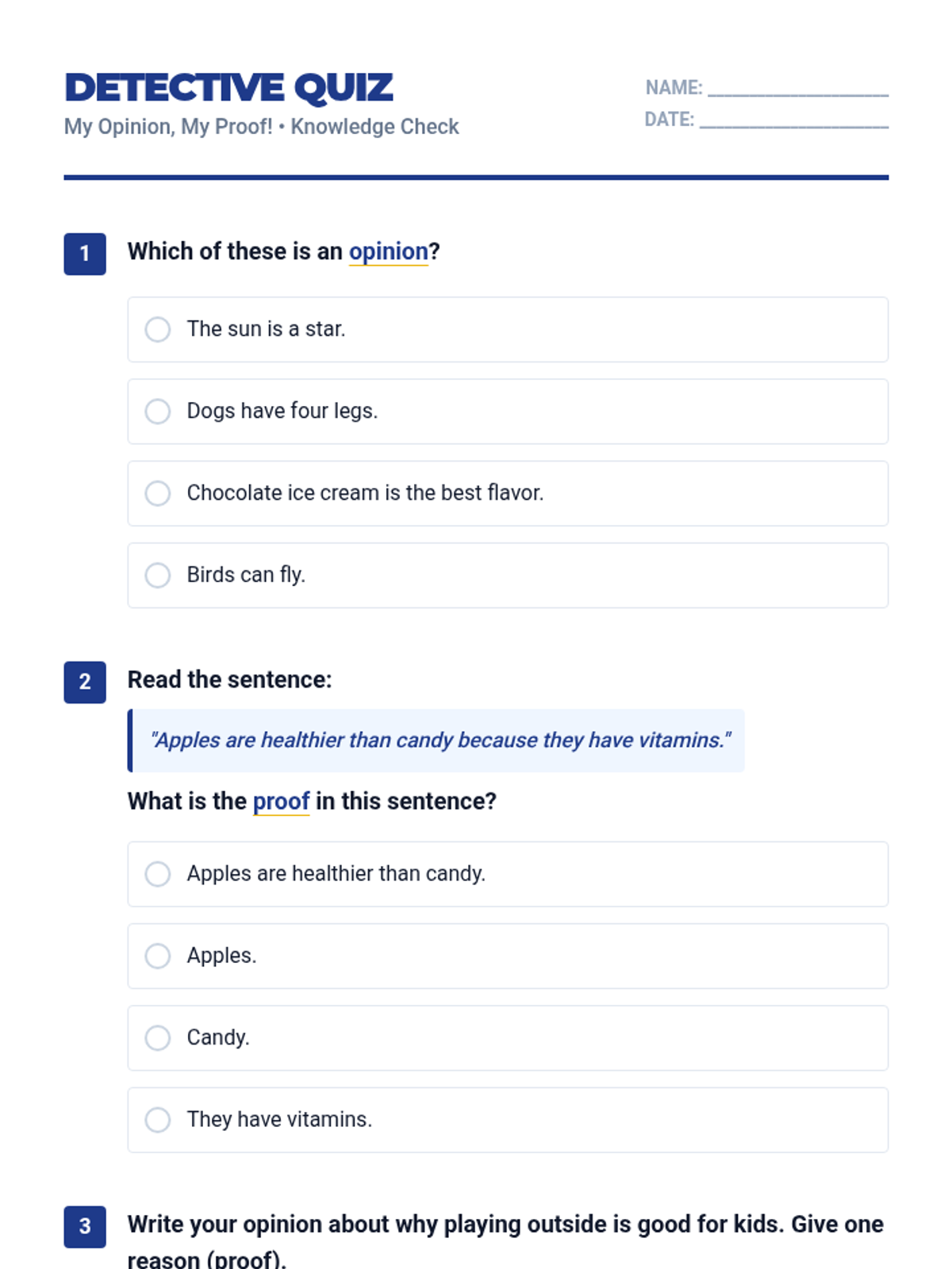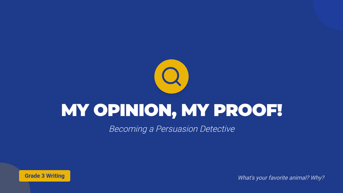 A 20-minute introductory lesson for 3rd graders on forming arguments by stating opinions and supporting them with evidence. Students practice identifying opinions and providing 'proof' through reading, worksheets, and a quiz.