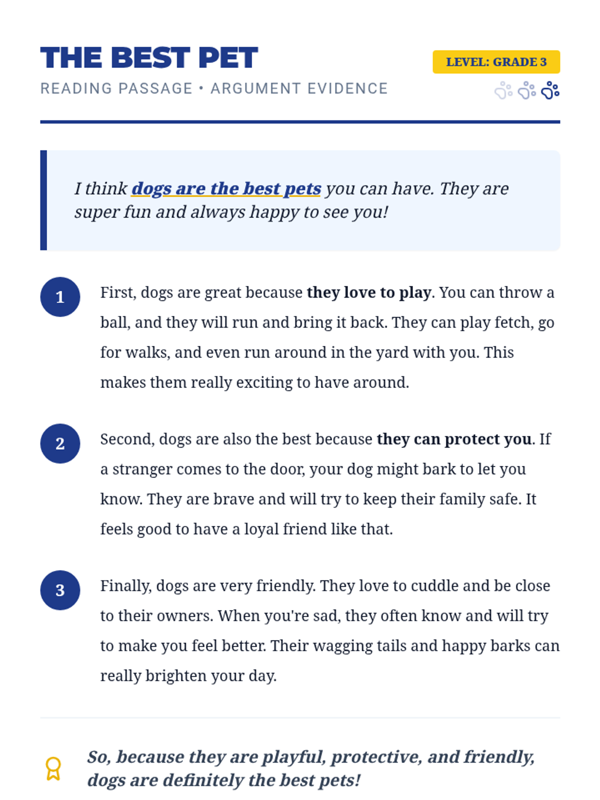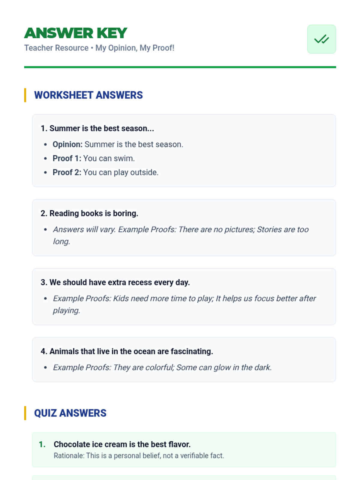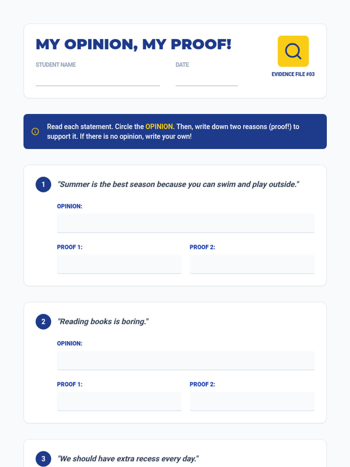 A 20-minute introductory lesson for 3rd graders on forming arguments by stating opinions and supporting them with evidence. Students practice identifying opinions and providing 'proof' through reading, worksheets, and a quiz.