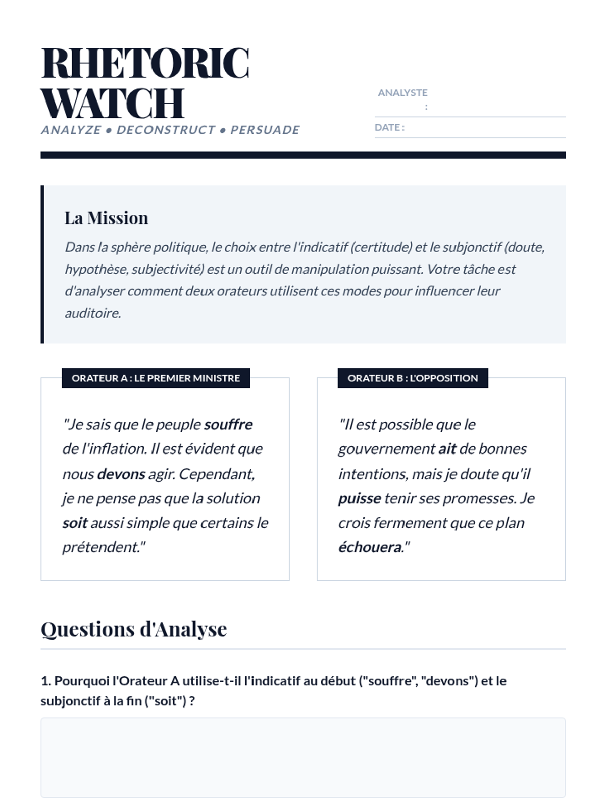Students explore the gray areas where usage depends on the speaker's certainty (penser, croire, espérer). Through contrasting examples, they learn to manipulate mood to signal doubt or conviction.