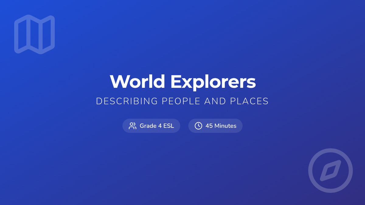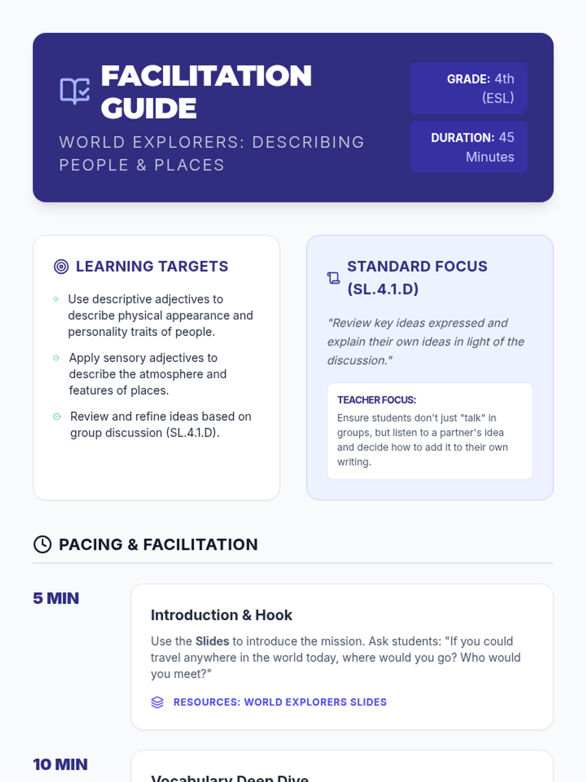 A 30-45 minute ESL lesson for Grade 4 focused on using descriptive language for people and places, emphasizing collaborative discussion and individual presentation skills. Students will learn to refine their own ideas based on peer feedback, meeting standard SL.4.1.D.