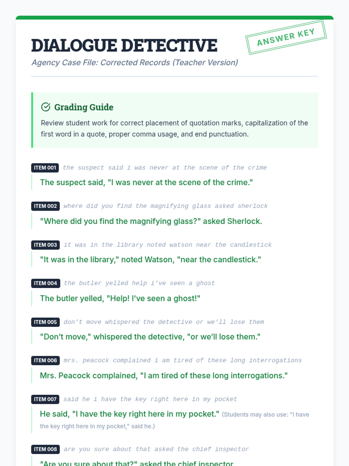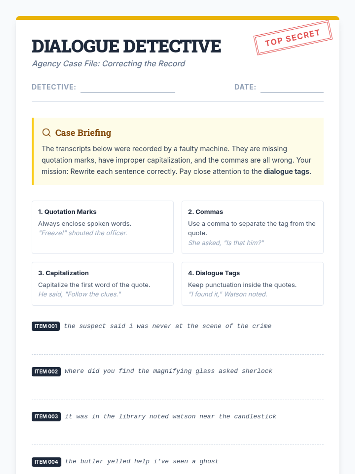 A comprehensive lesson on identifying and correcting common dialogue errors, including punctuation, capitalization, and formatting of dialogue tags.