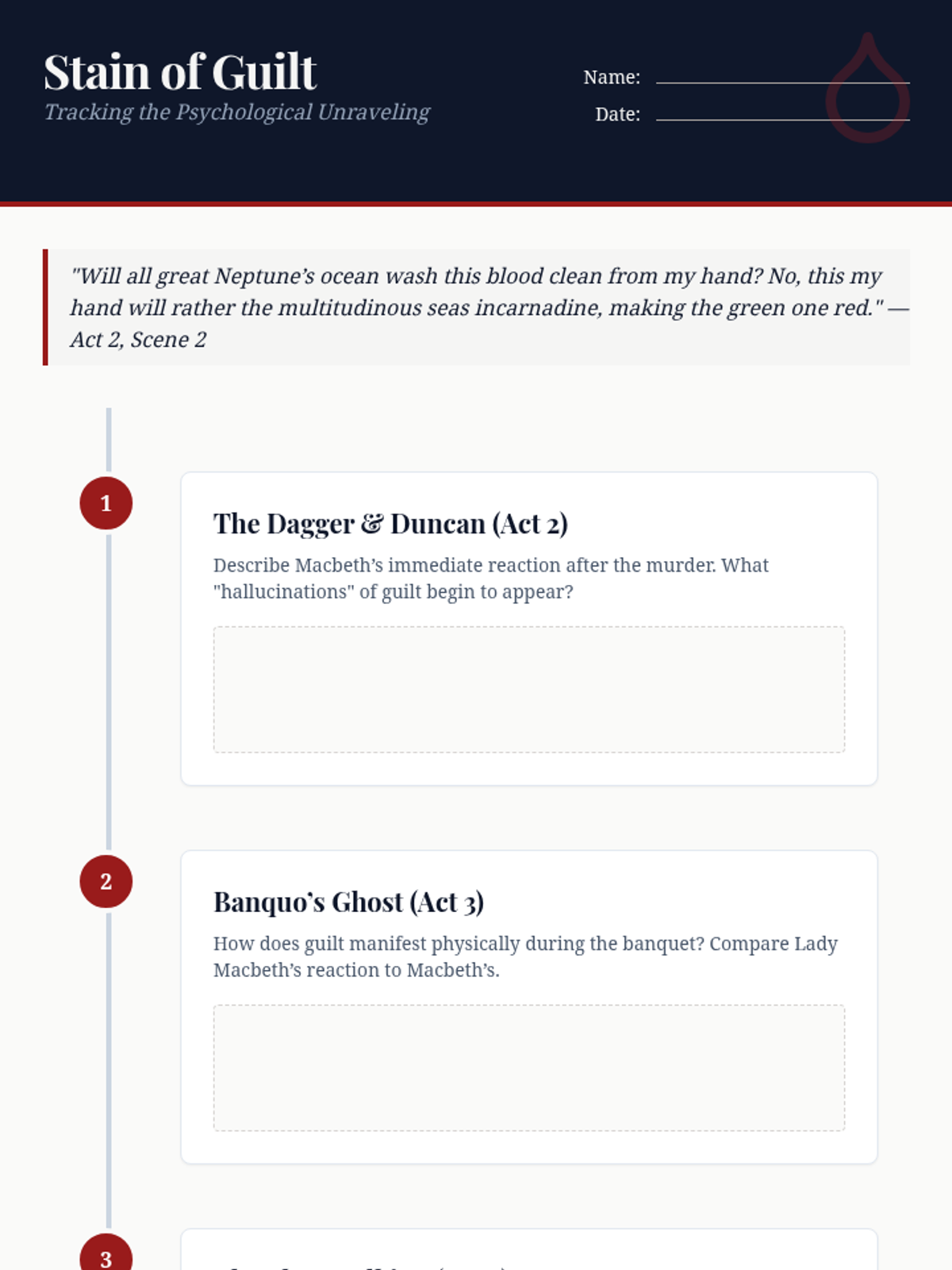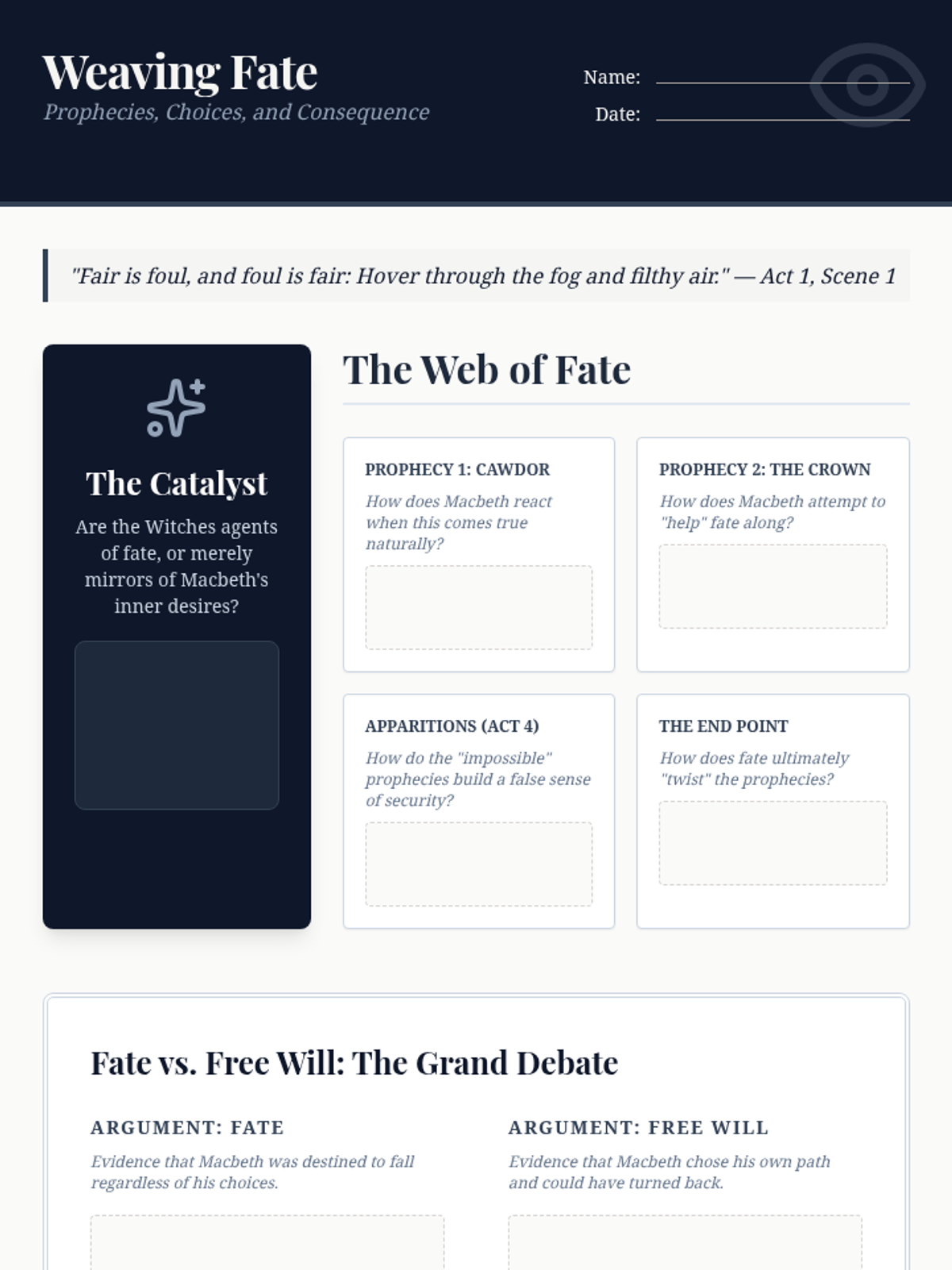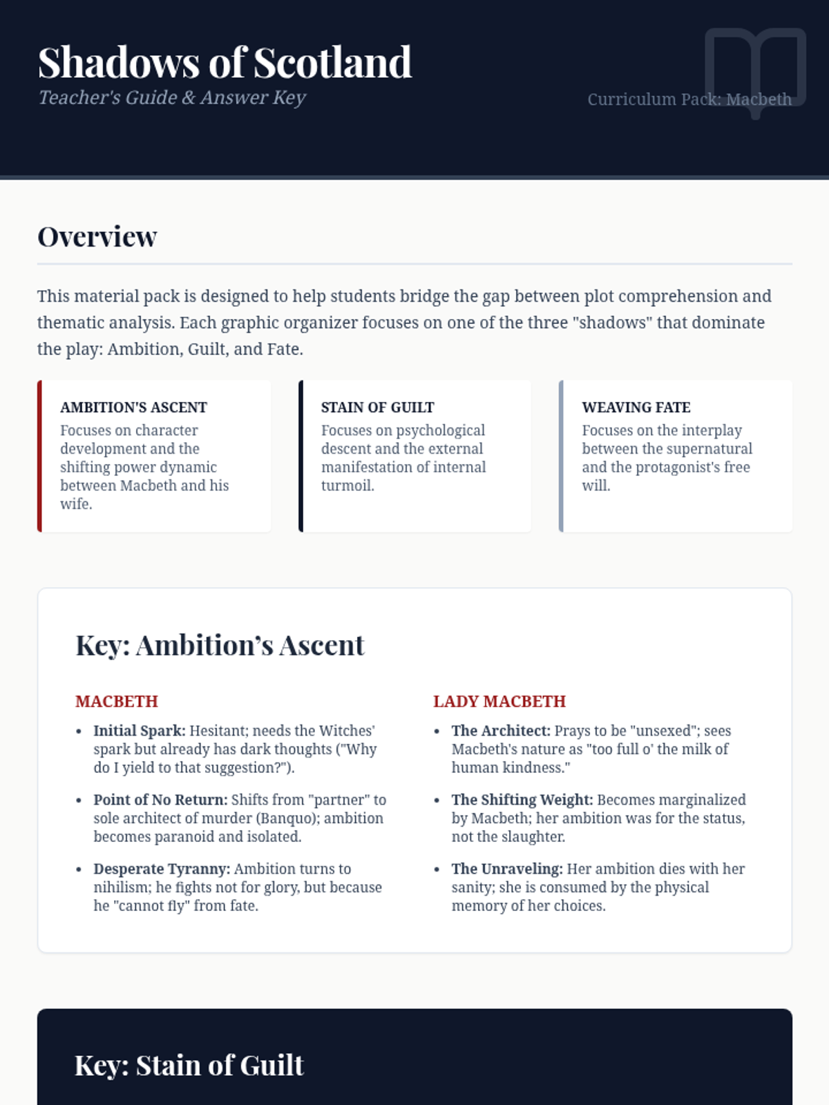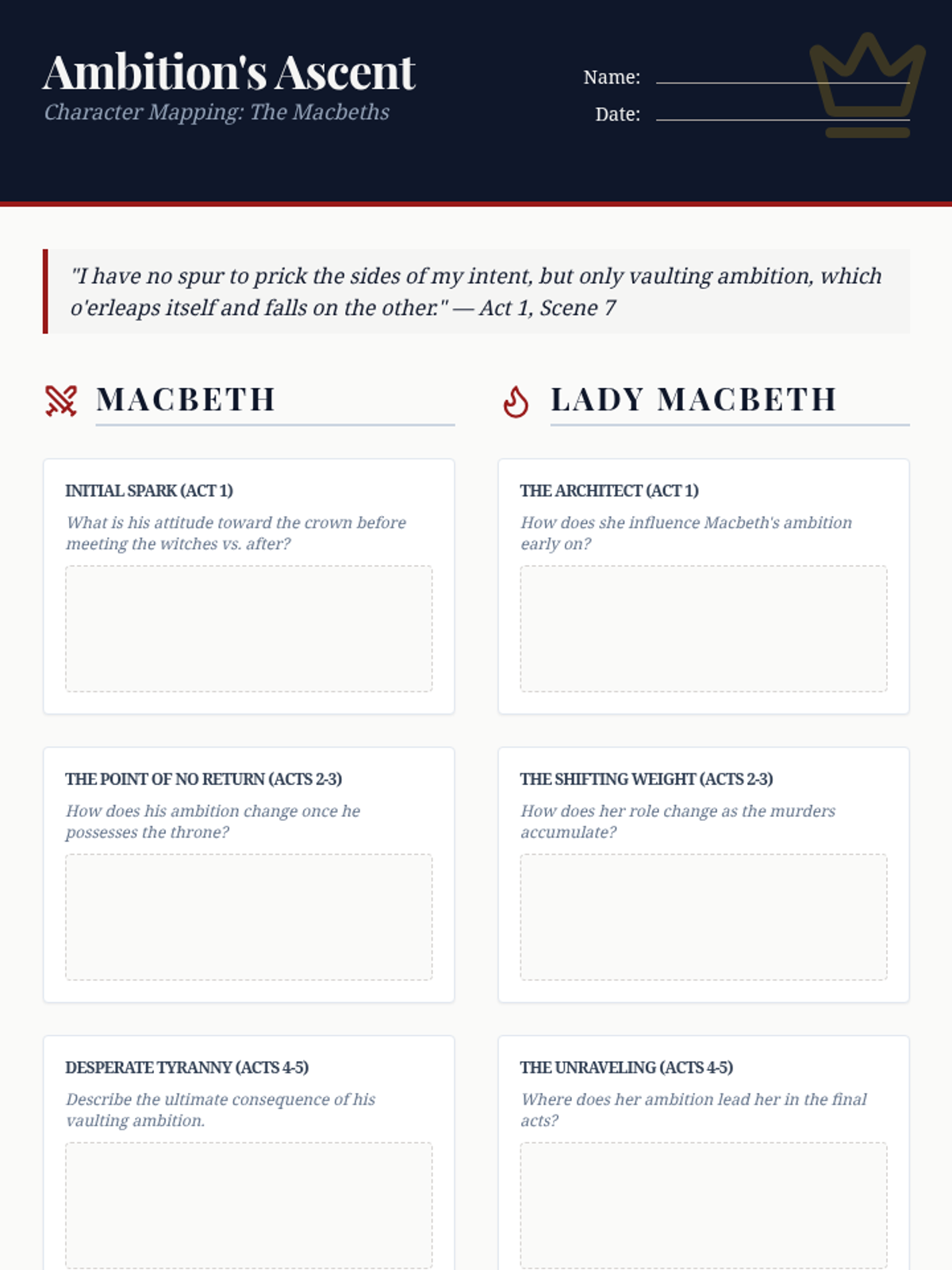A collection of graphic organizers and analysis tools focused on the central themes of ambition, guilt, and fate in Shakespeare's Macbeth. Students track character development and plot progression through visual mapping and evidence-based analysis.