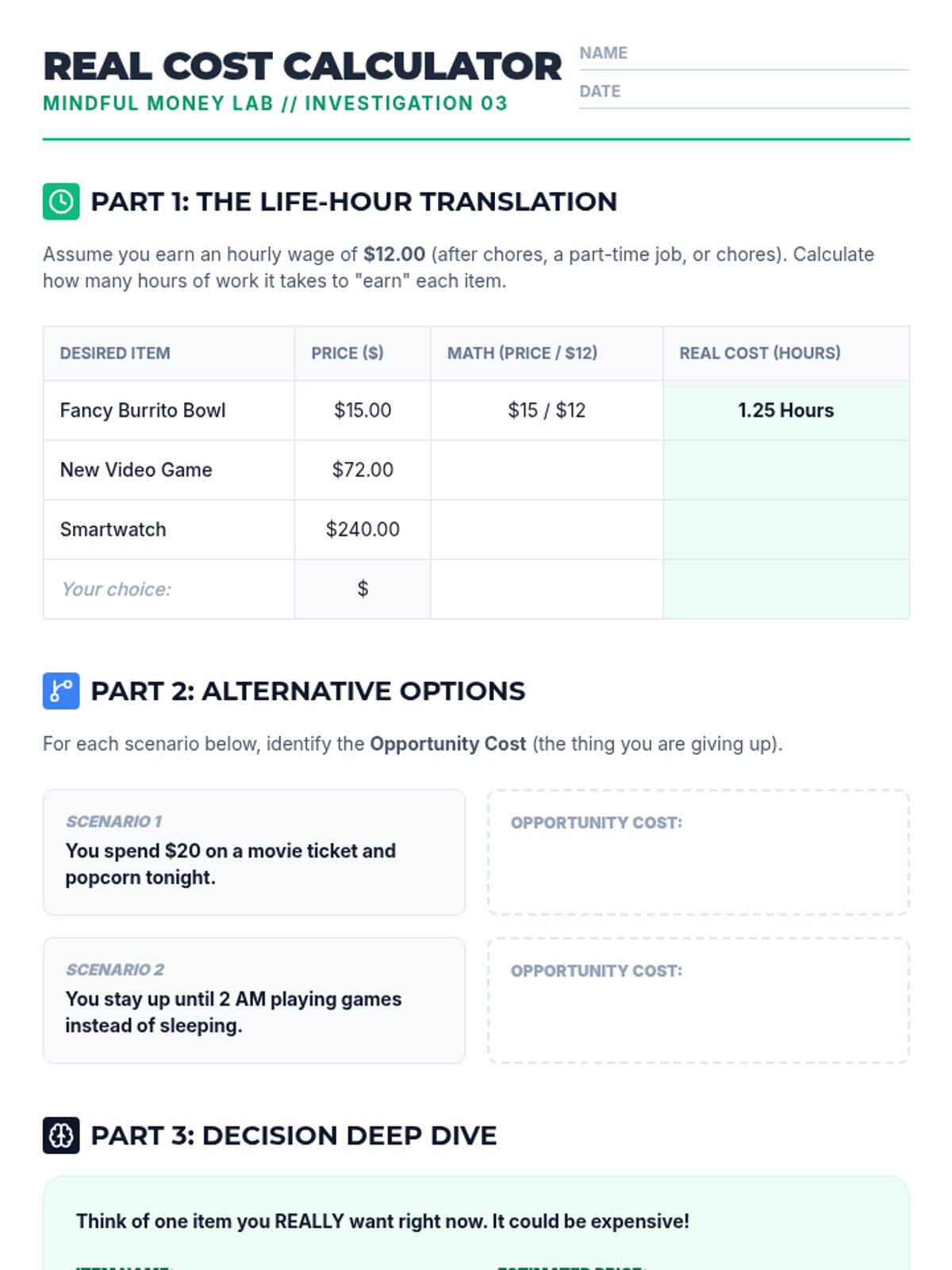 Introduces the economic concept of opportunity cost. Students practice calculating the 'real cost' of items in terms of hours worked or other items foregone.