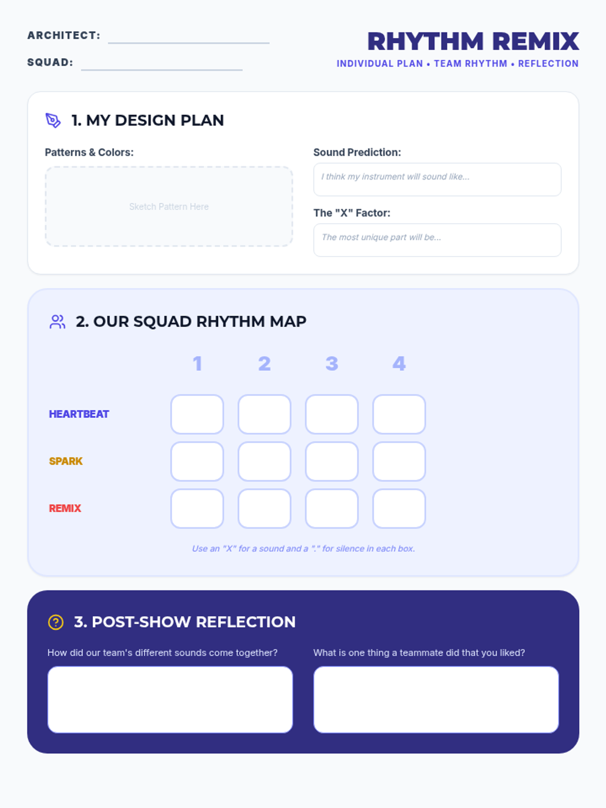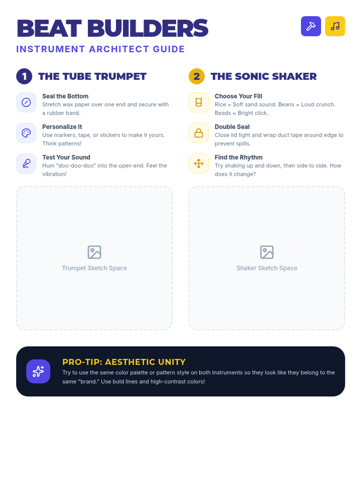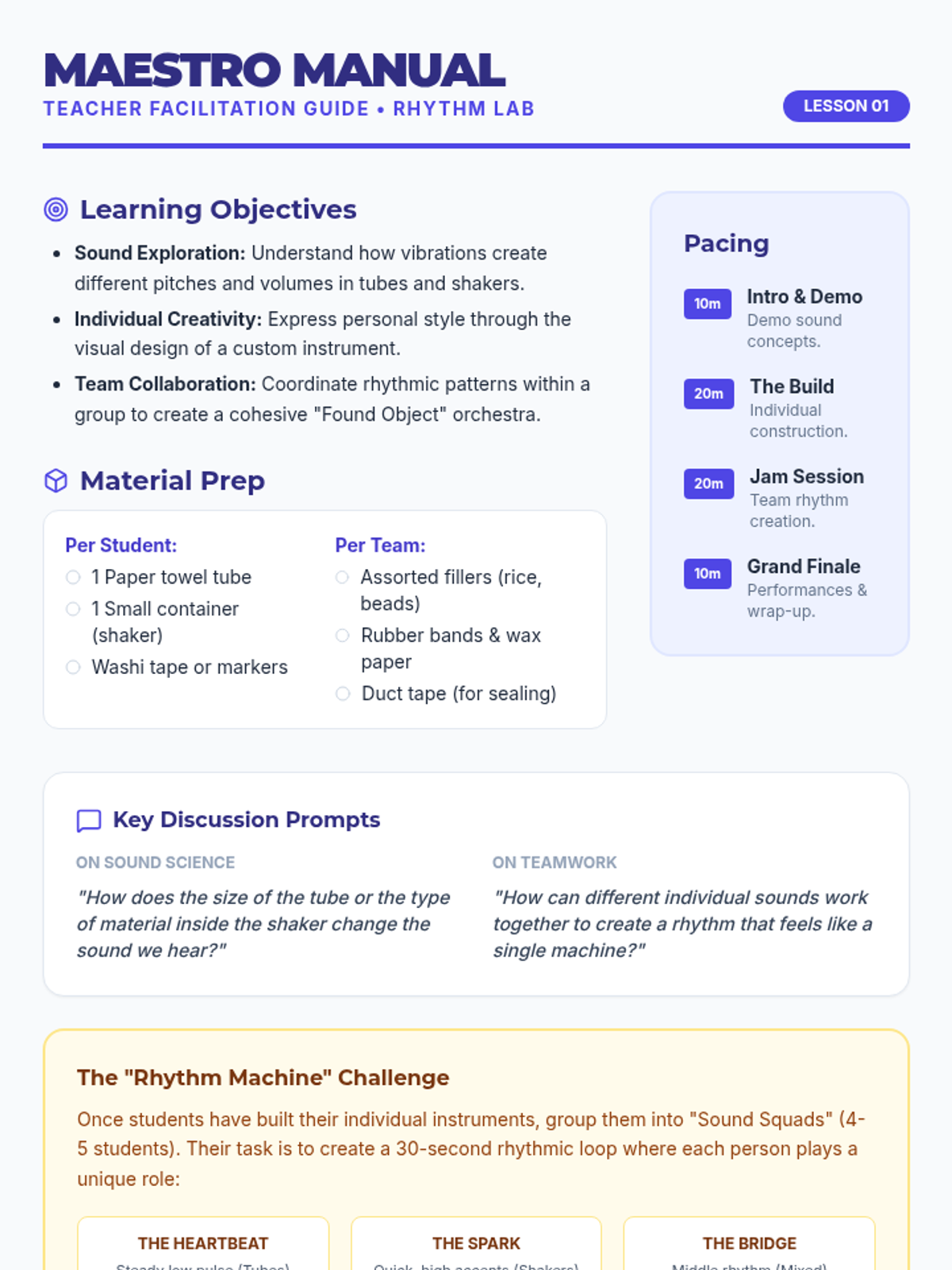 Students explore the science and art of sound by constructing DIY instruments from recycled materials. The lesson emphasizes individual creative design followed by a collaborative team performance.