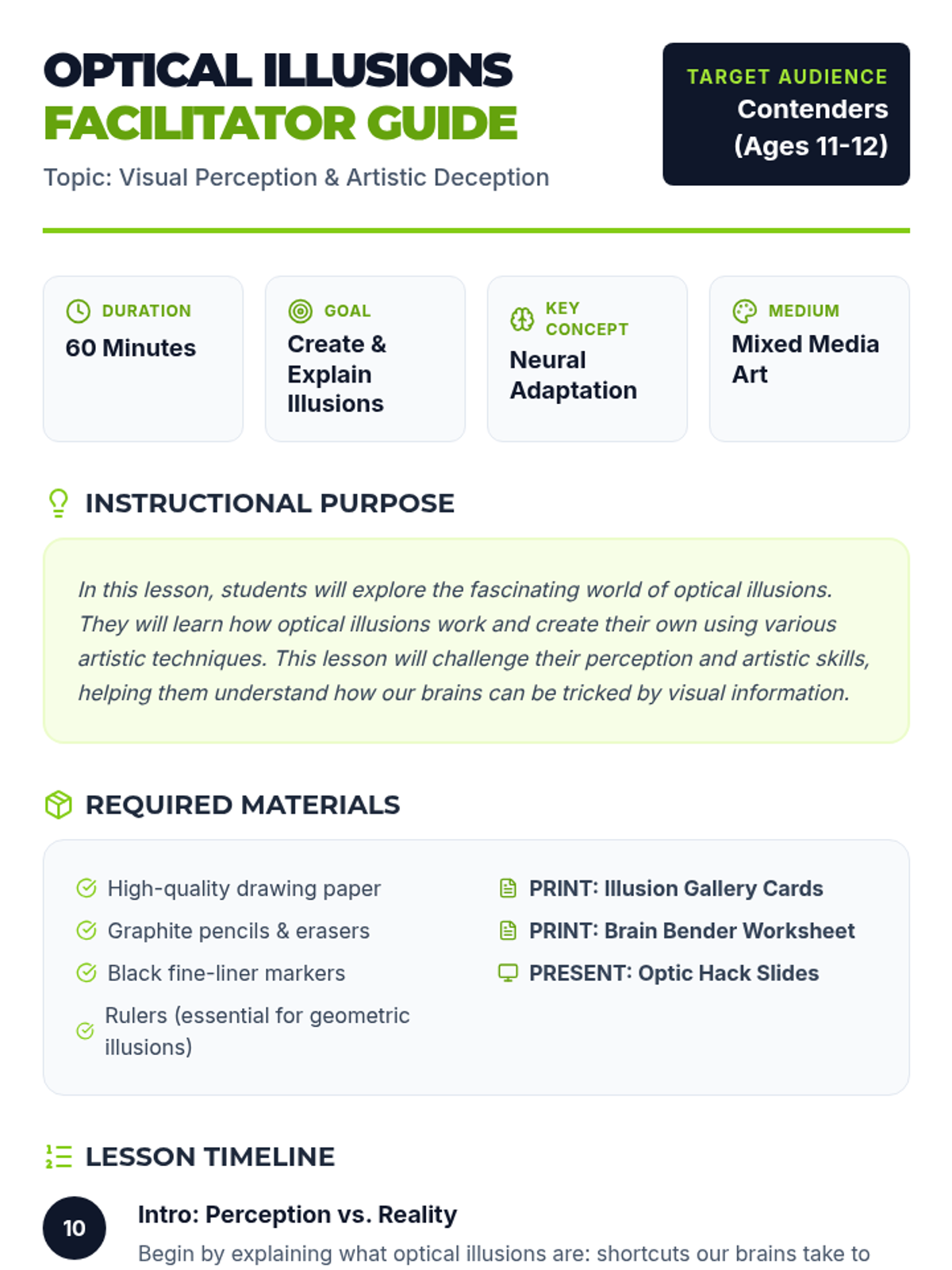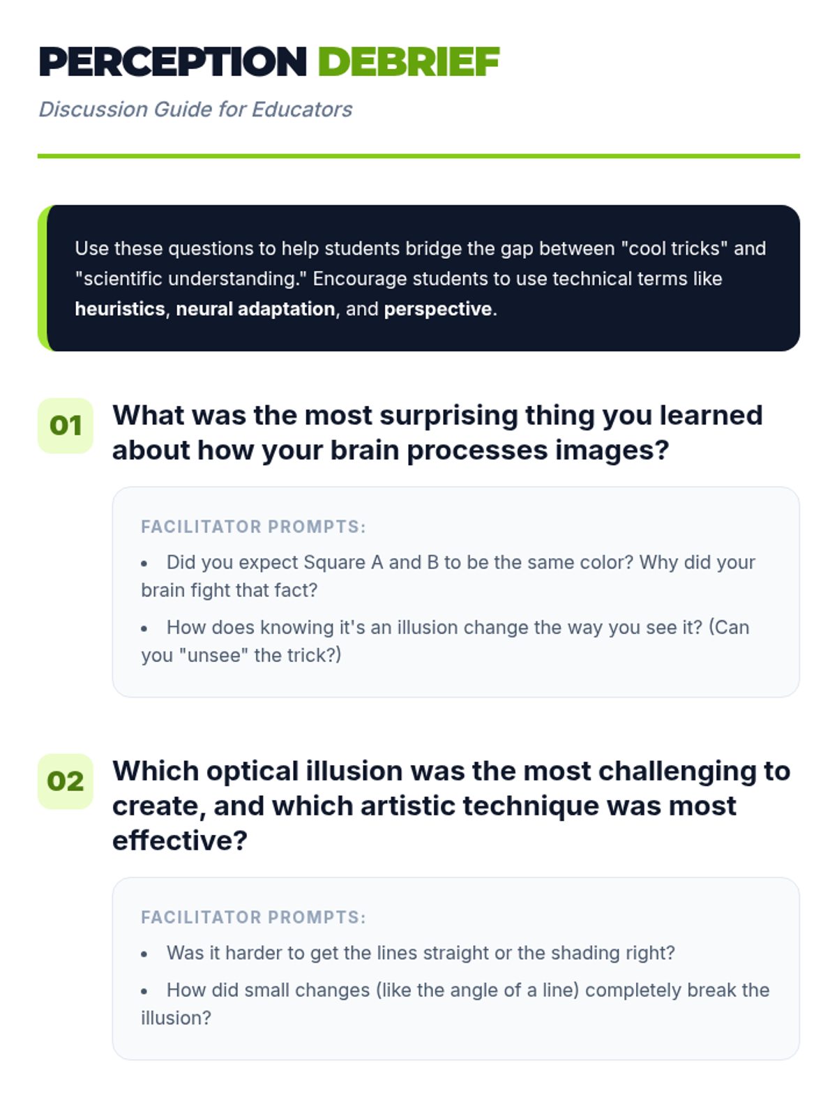 A hands-on exploration of how visual information can trick the brain, culminating in students creating their own mind-bending optical illusions.