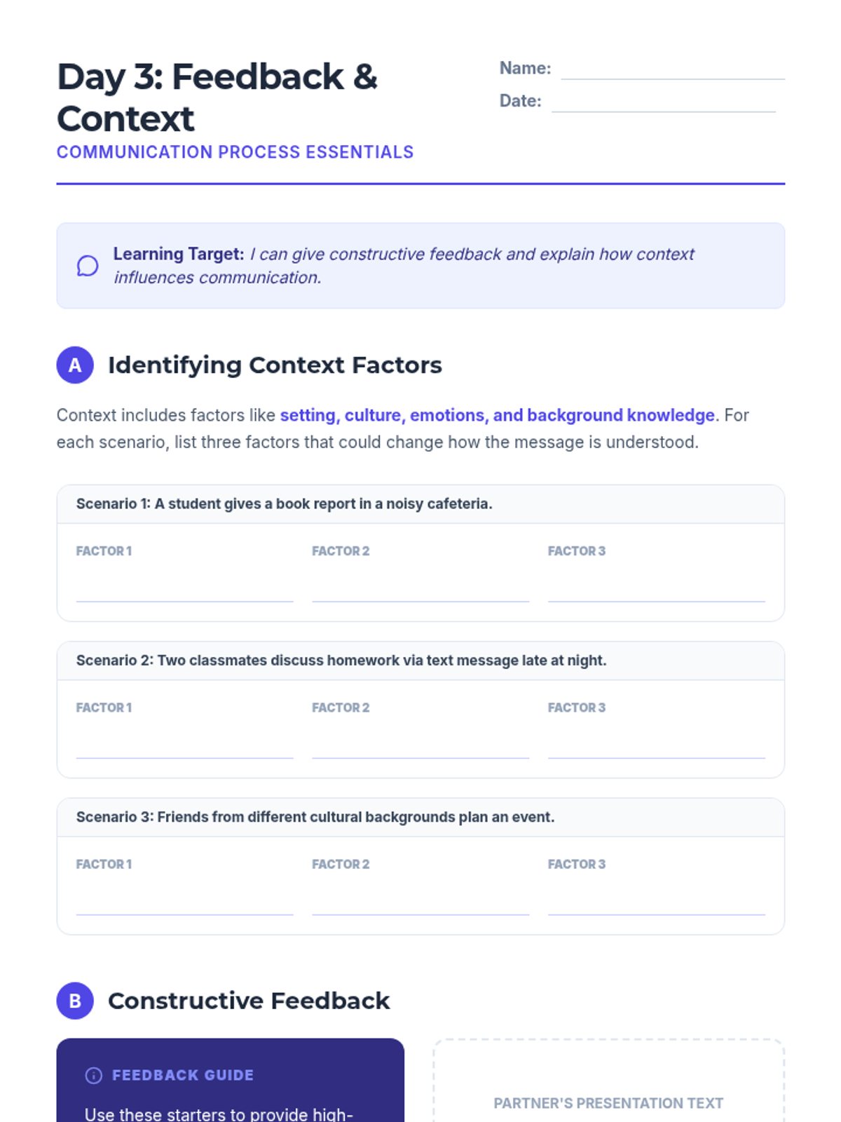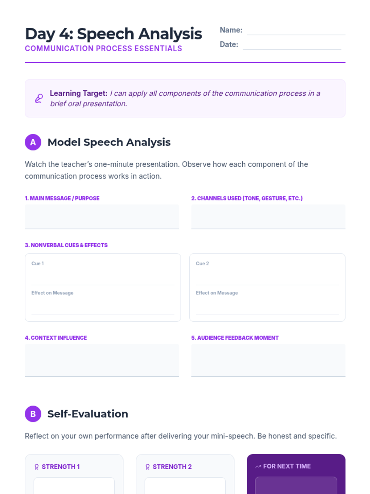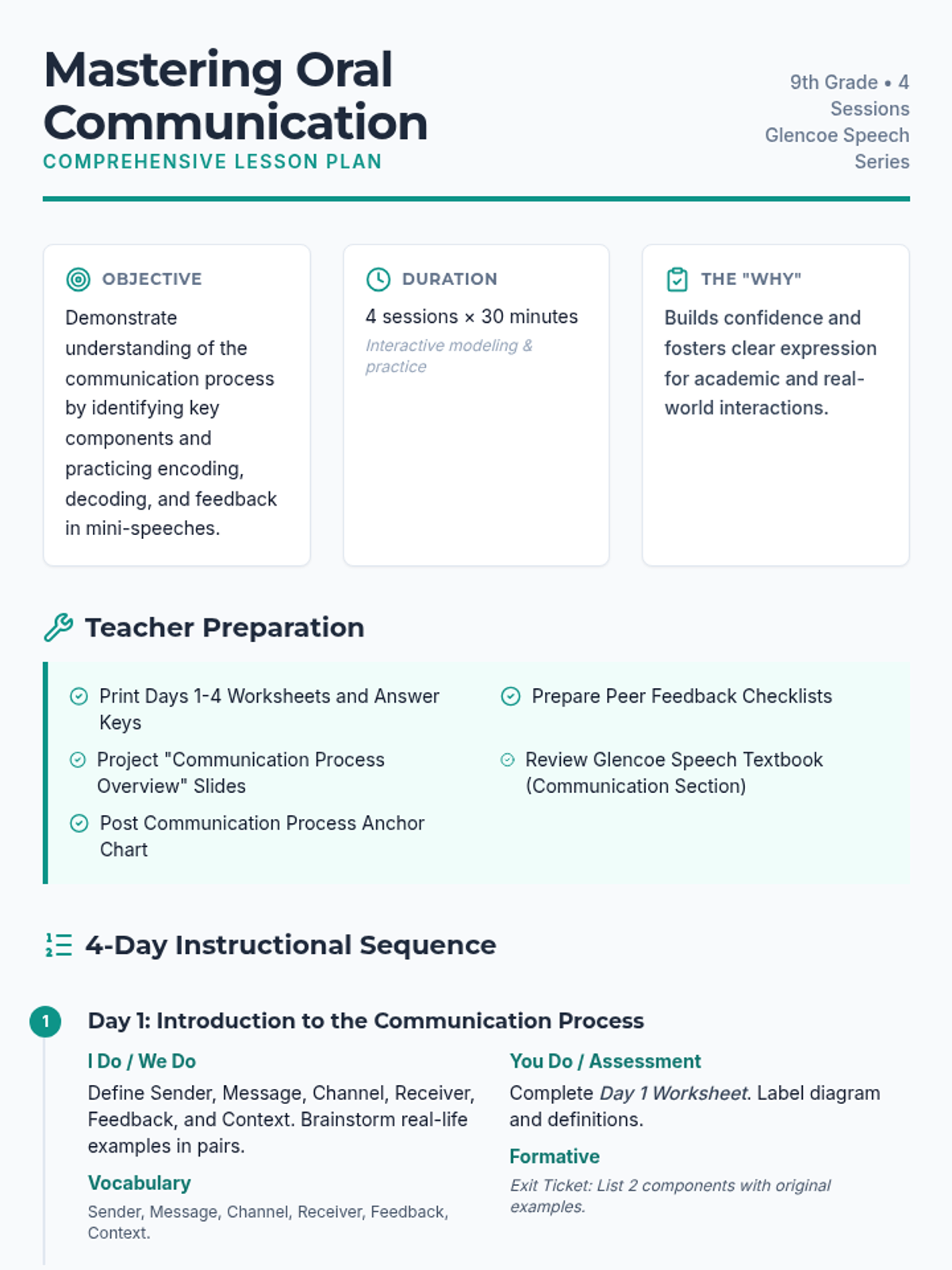 A four-day, 30-minute-per-session high school lesson series where 9th graders will demonstrate the communication process through interactive activities based on Glencoe’s Speech textbook. Students will build skills in encoding, decoding, feedback, and context while practicing effective speaking and listening.
