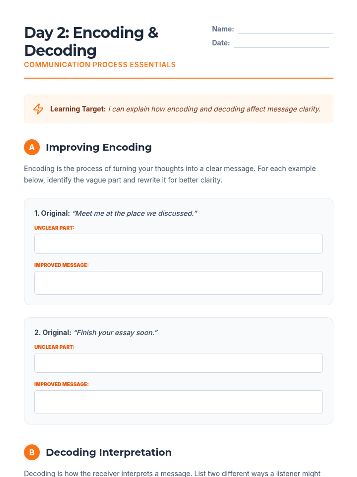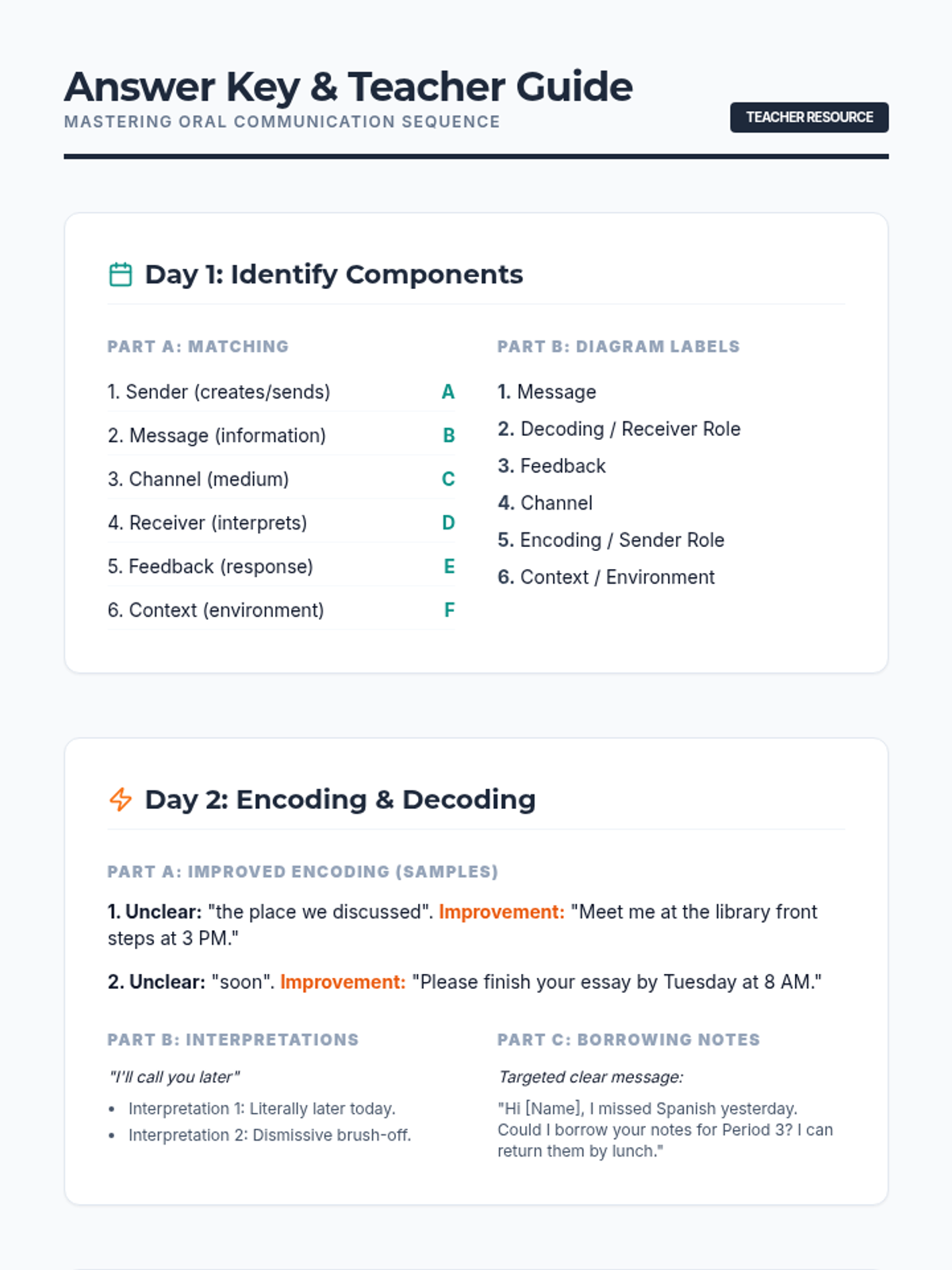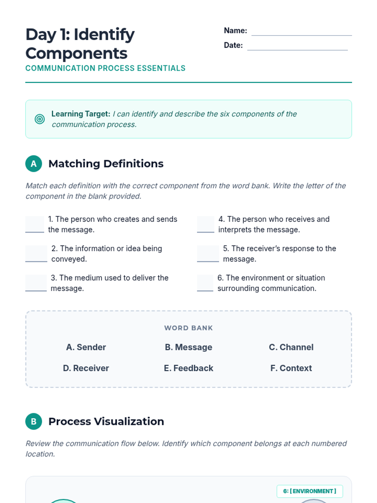 A four-day, 30-minute-per-session high school lesson series where 9th graders will demonstrate the communication process through interactive activities based on Glencoe’s Speech textbook. Students will build skills in encoding, decoding, feedback, and context while practicing effective speaking and listening.