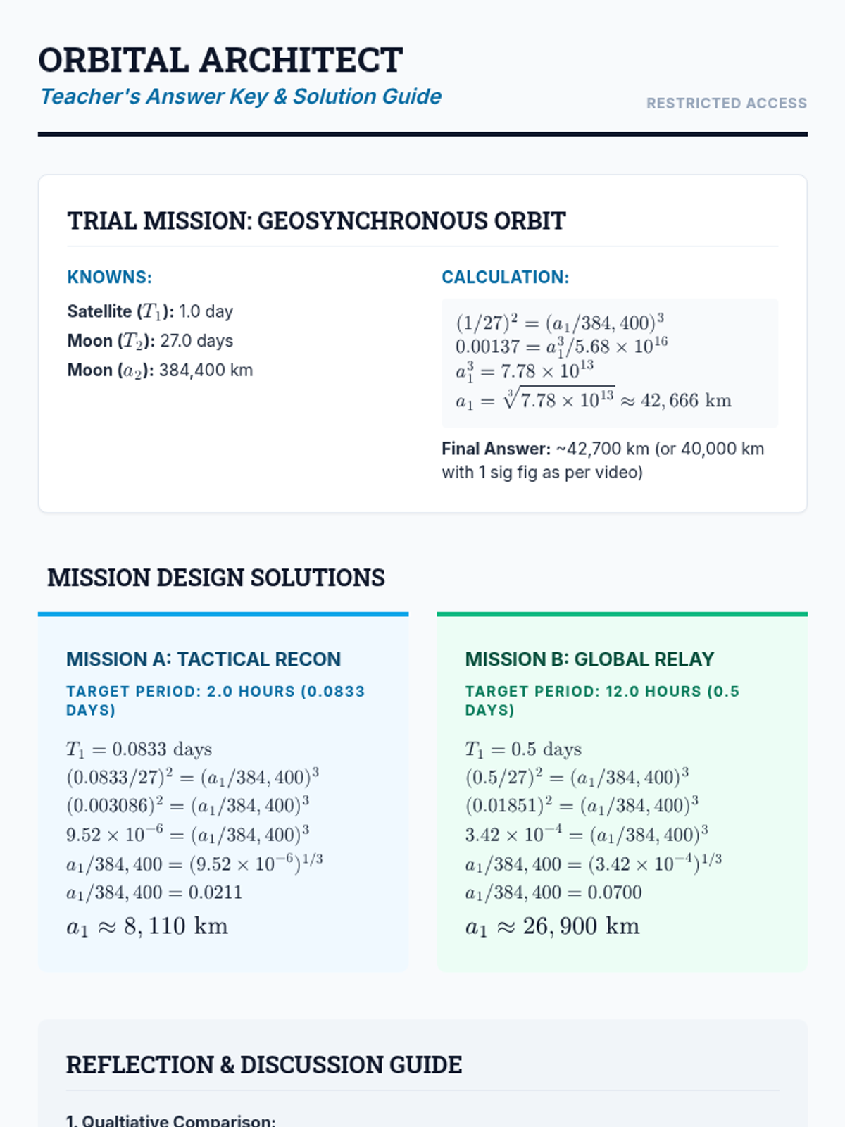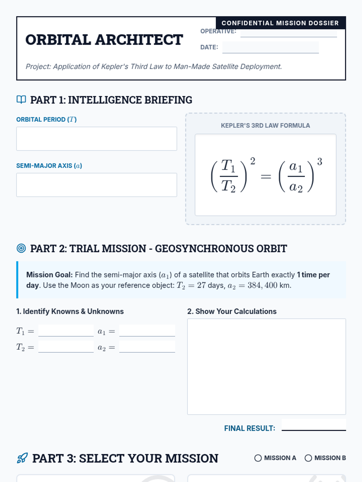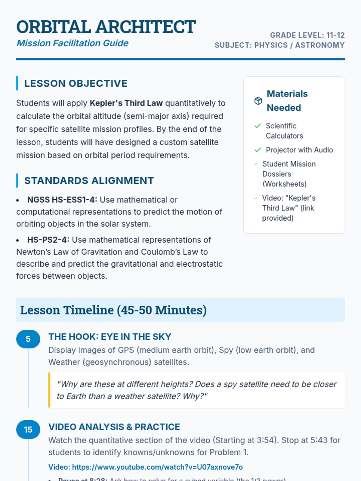 An advanced physics and astronomy lesson where students apply Kepler's Third Law to calculate the orbital parameters of various satellite missions. The lesson includes a video-guided practice session followed by a creative design challenge.