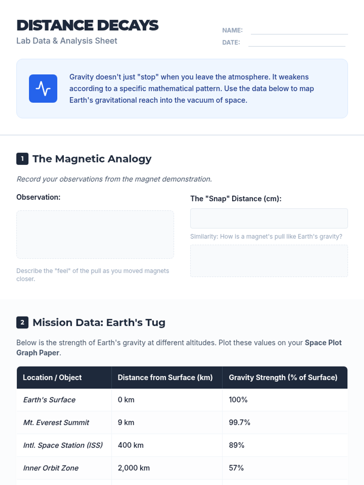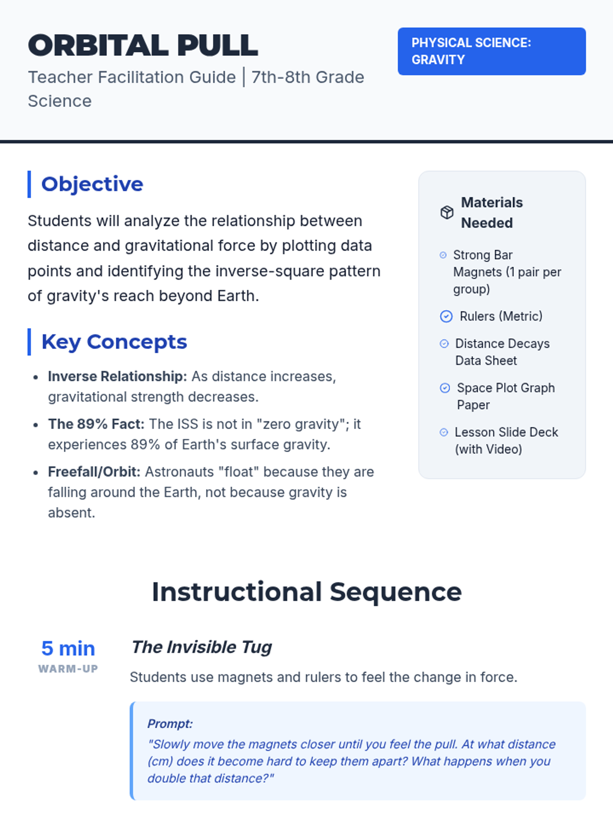 A middle school science lesson investigating the inverse relationship between distance and gravitational force. Students use magnet analogies and data plotting to debunk the "zero gravity" misconception in space.
