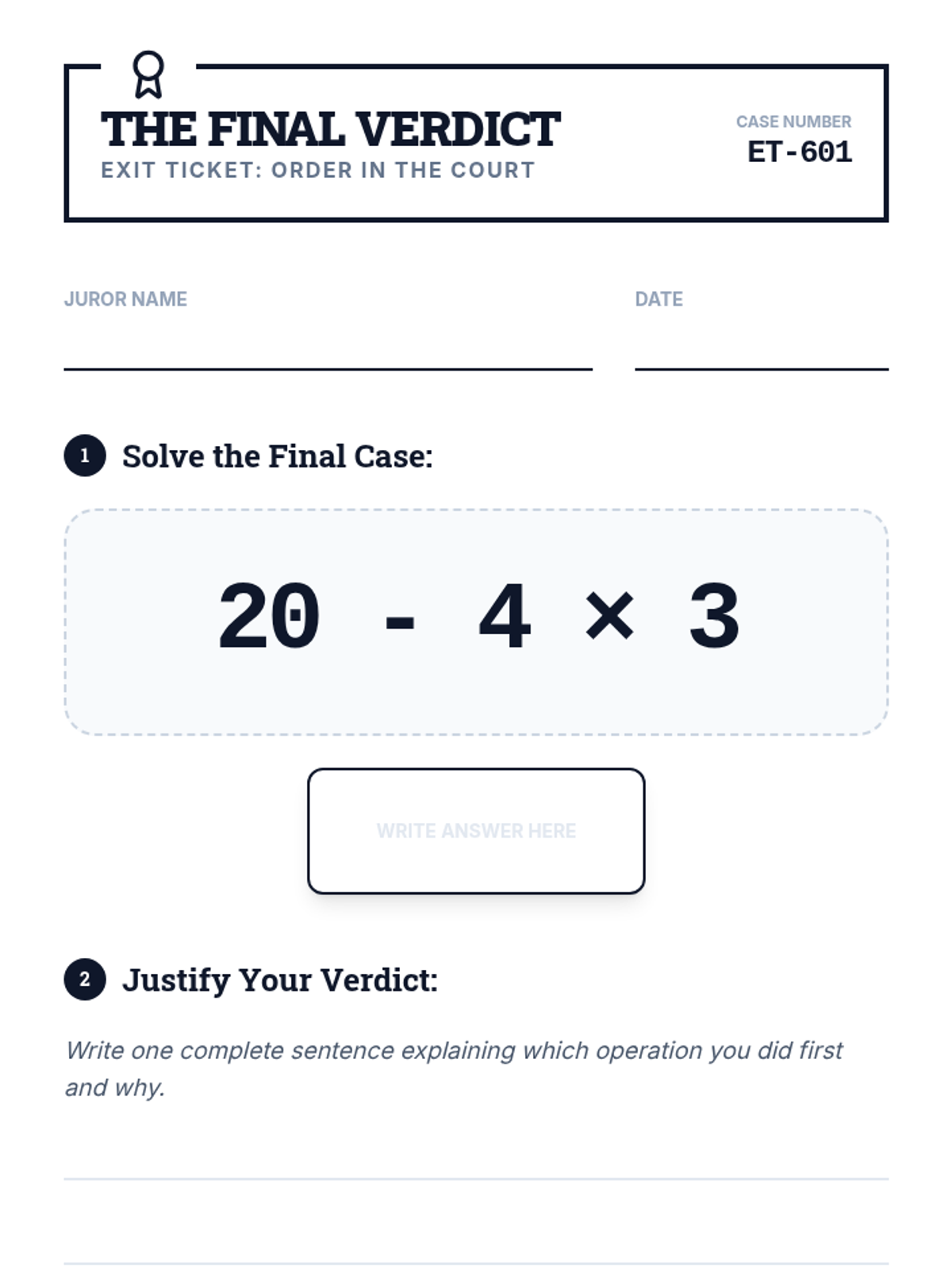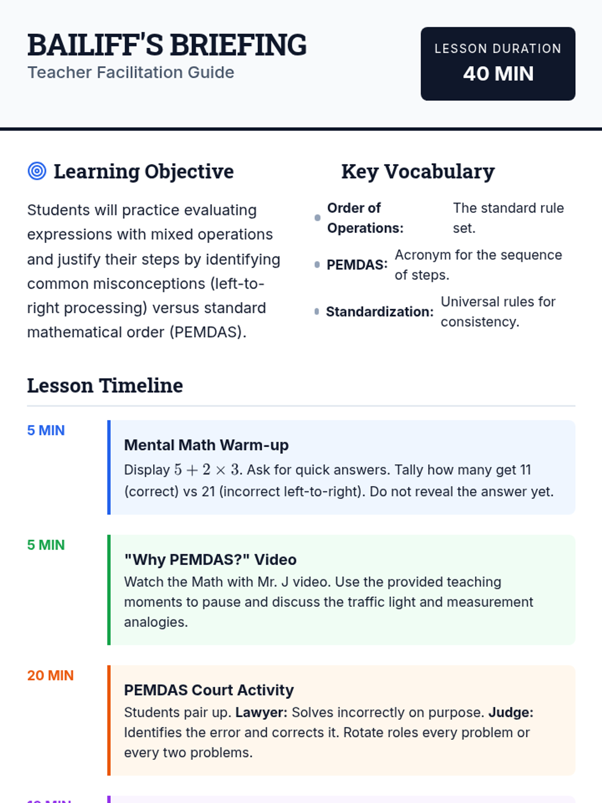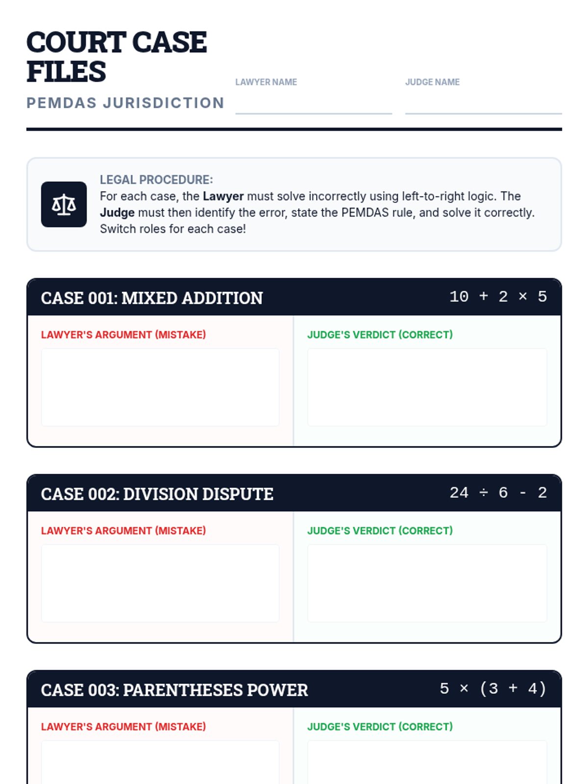 A 6th-grade math lesson that uses a courtroom role-play theme to help students understand and justify the Order of Operations (PEMDAS). Students act as 'Lawyers' arguing incorrect left-to-right logic and 'Judges' correcting them based on mathematical standards.