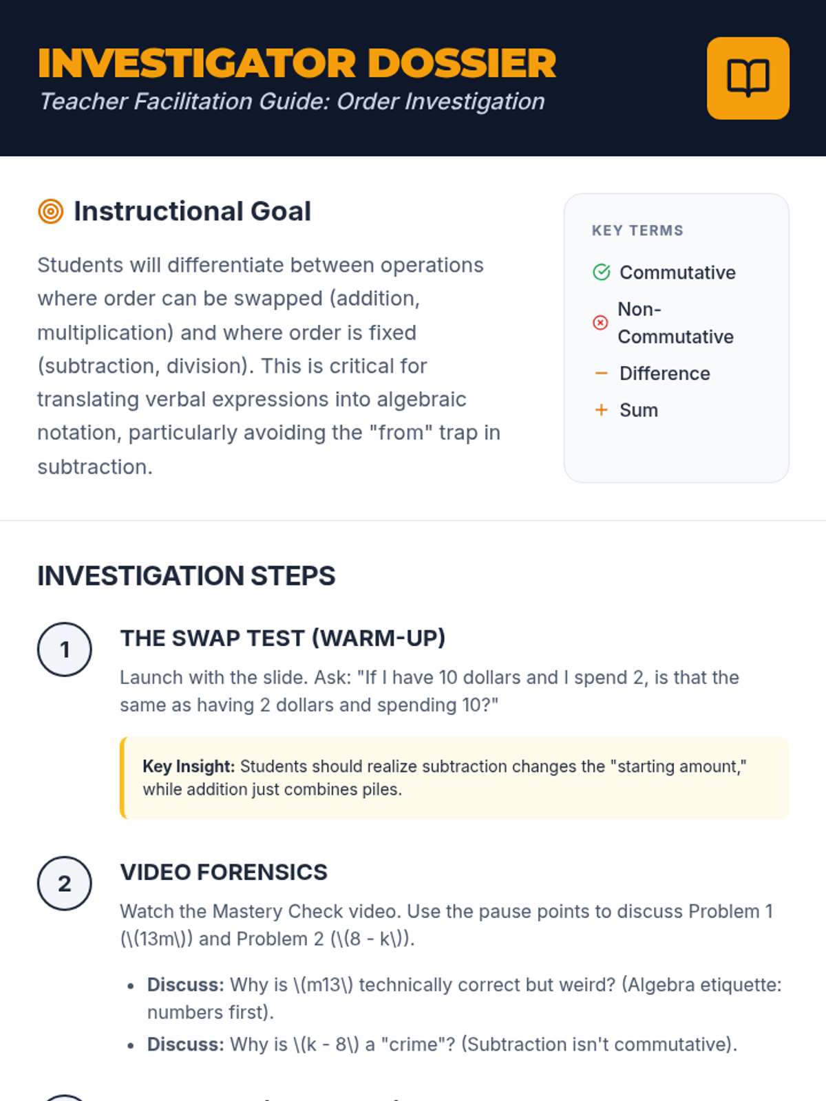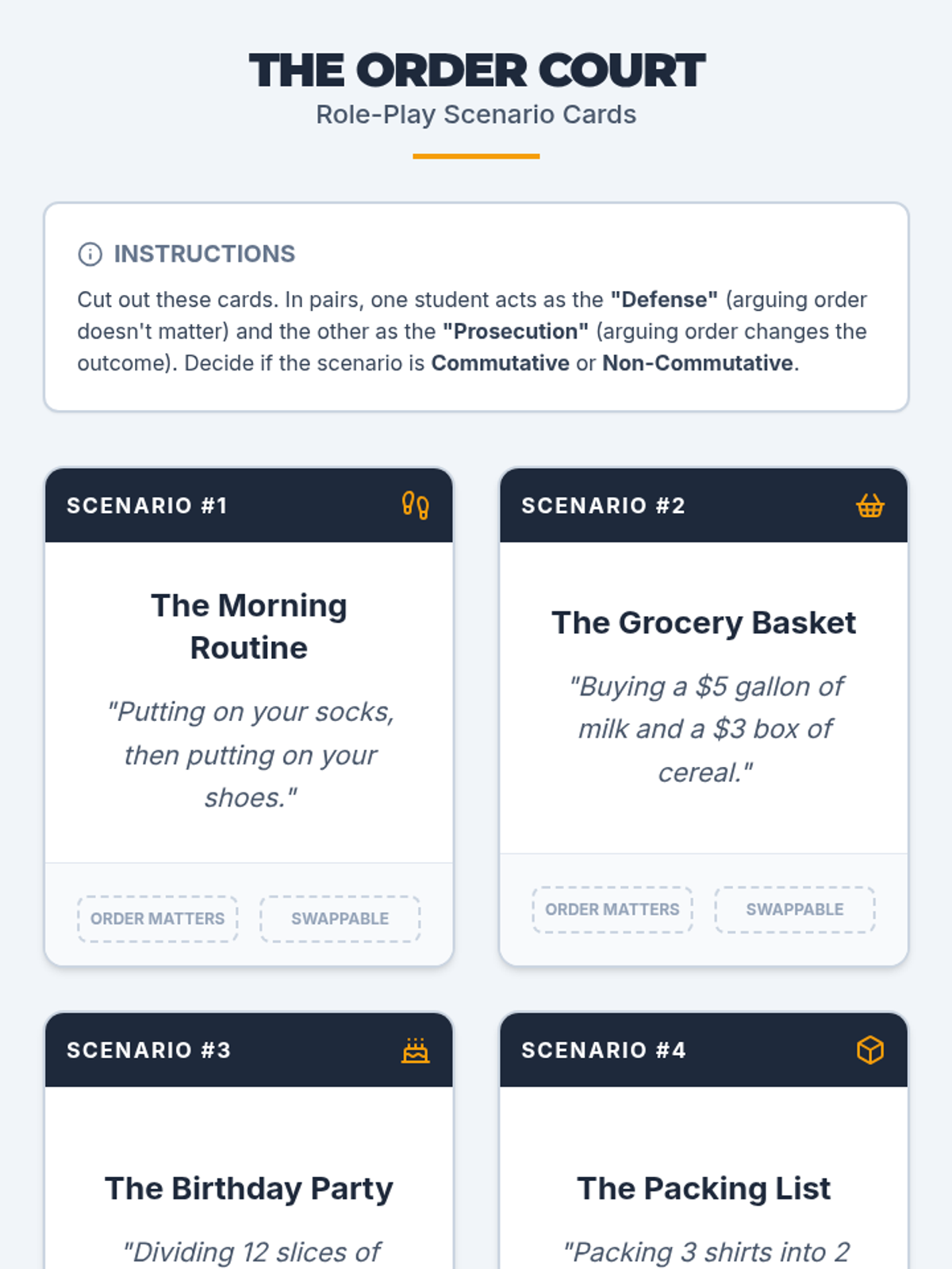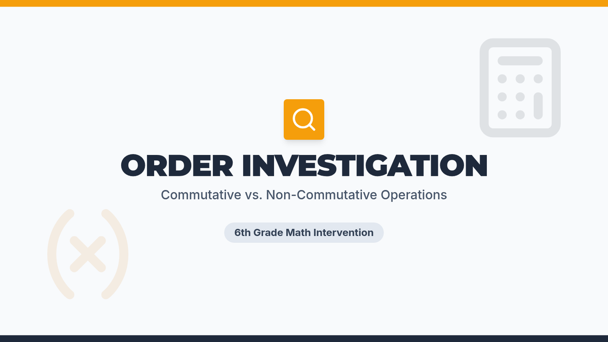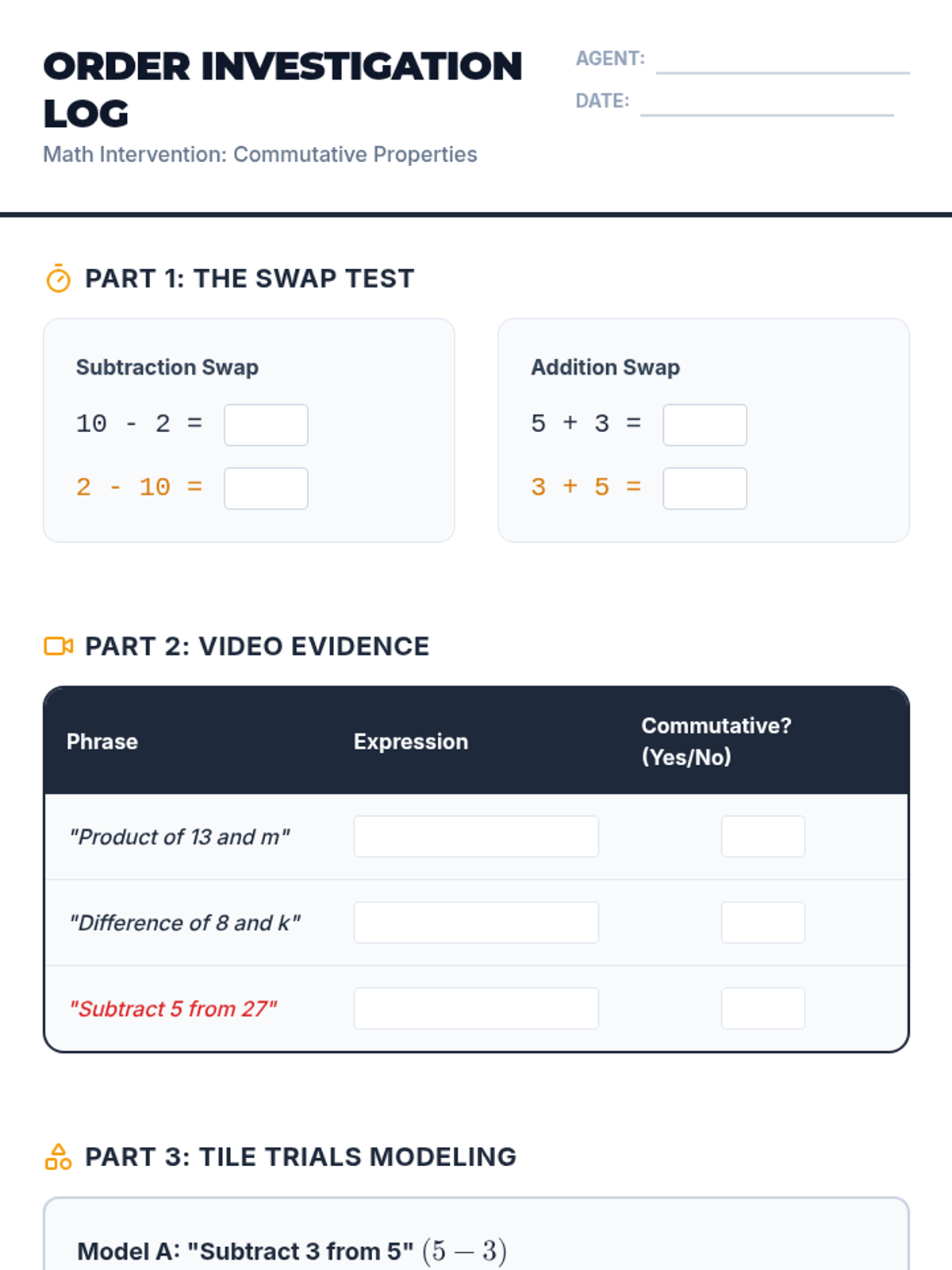 A math intervention lesson focused on the commutative property, helping students differentiate between operations where order matters (subtraction/division) and where it doesn't (addition/multiplication). Students use physical modeling and real-world scenarios to anchor their understanding.