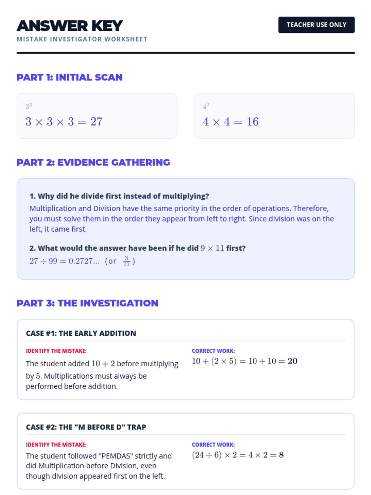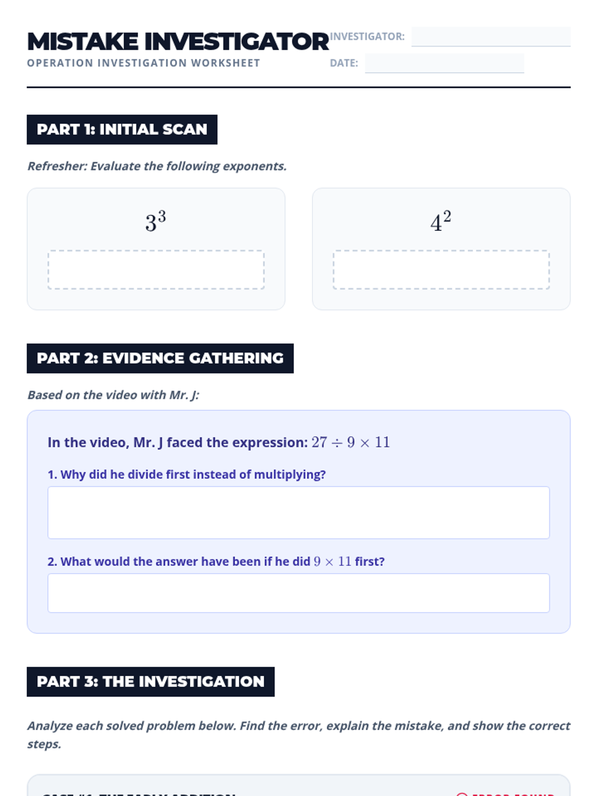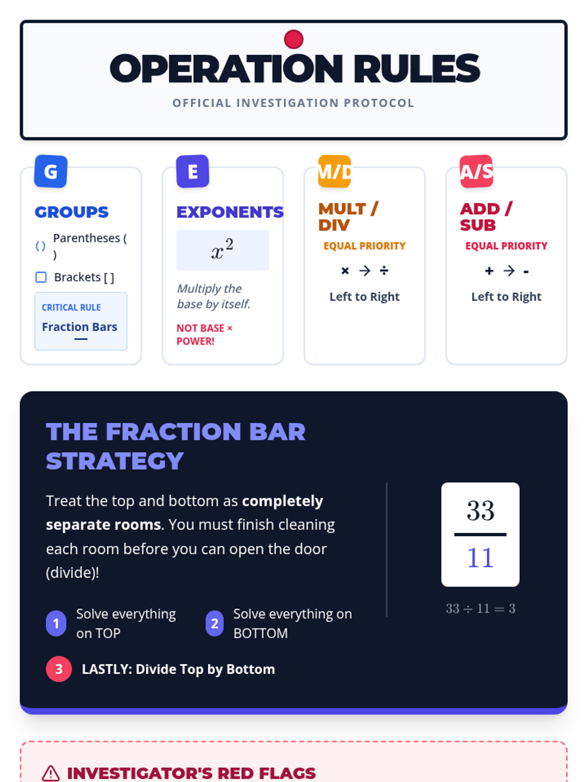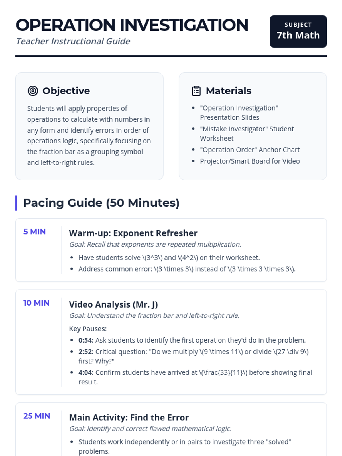 A 7th-grade math lesson focused on evaluating complex expressions with the order of operations, specifically addressing fraction bars as grouping symbols and the left-to-right rule for multiplication and division. Students analyze common errors to deepen their conceptual understanding.