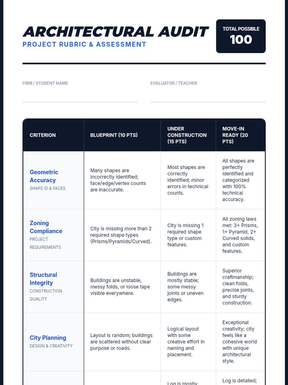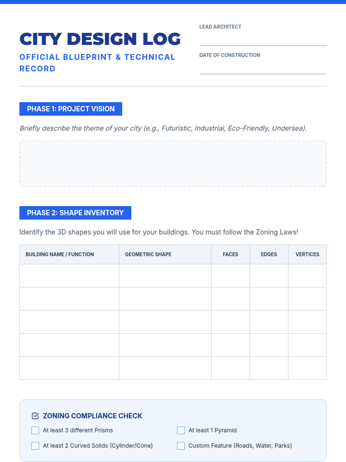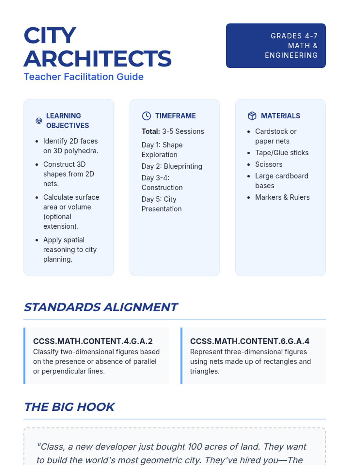 A project-based lesson where students apply geometry skills to design and build a 3D miniature city, focusing on polyhedra, volume, and spatial reasoning.