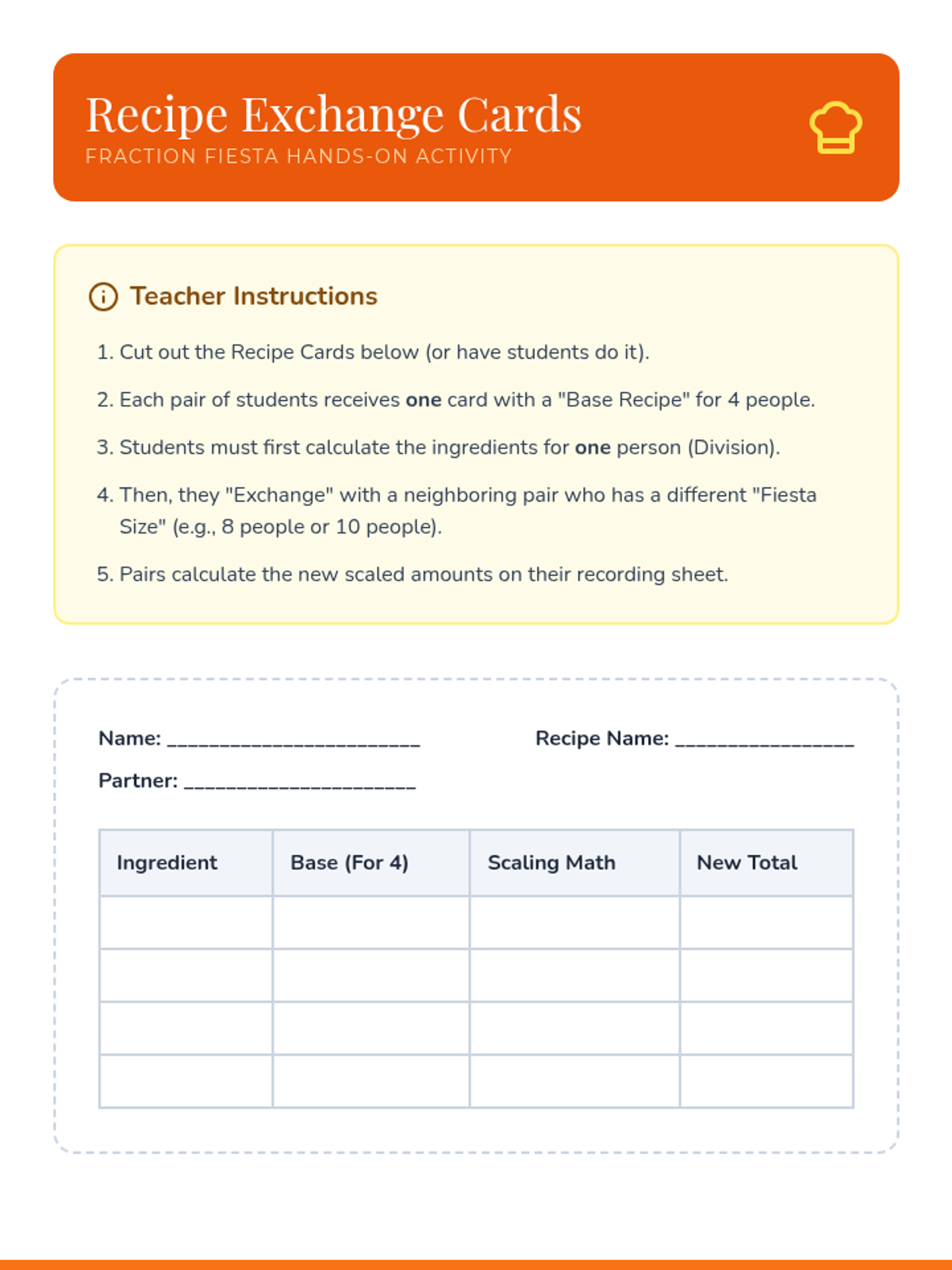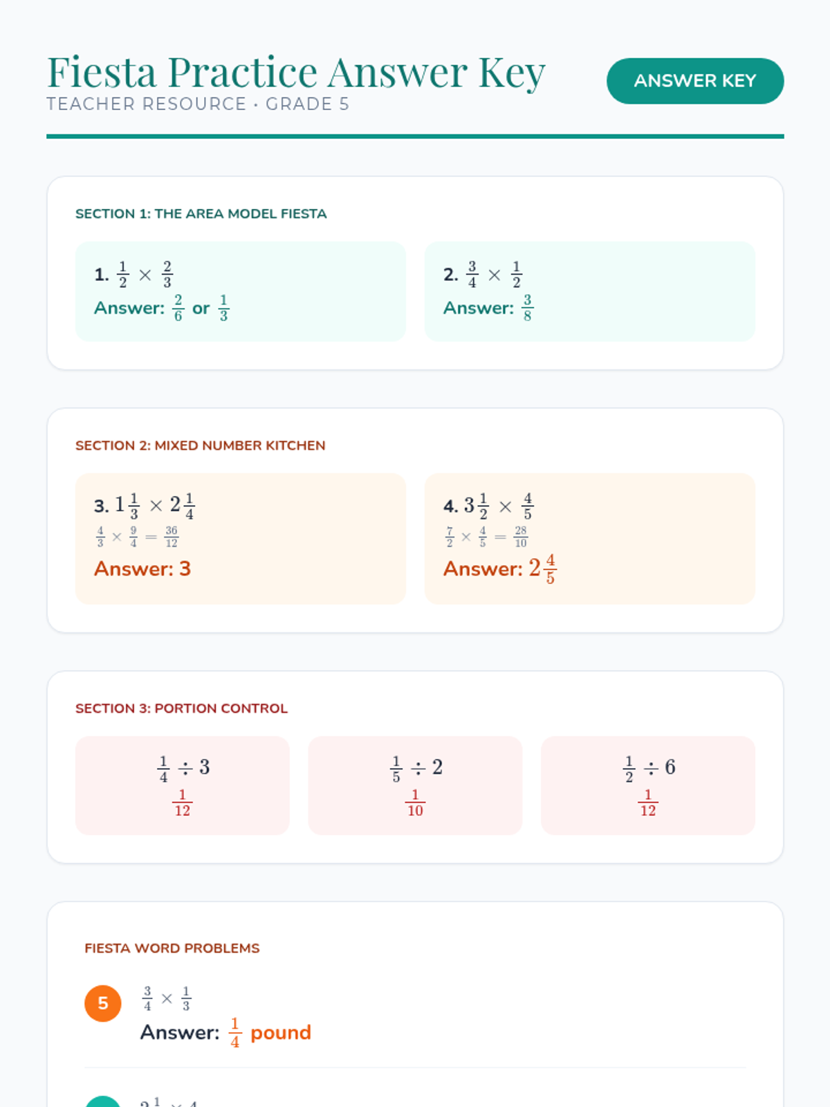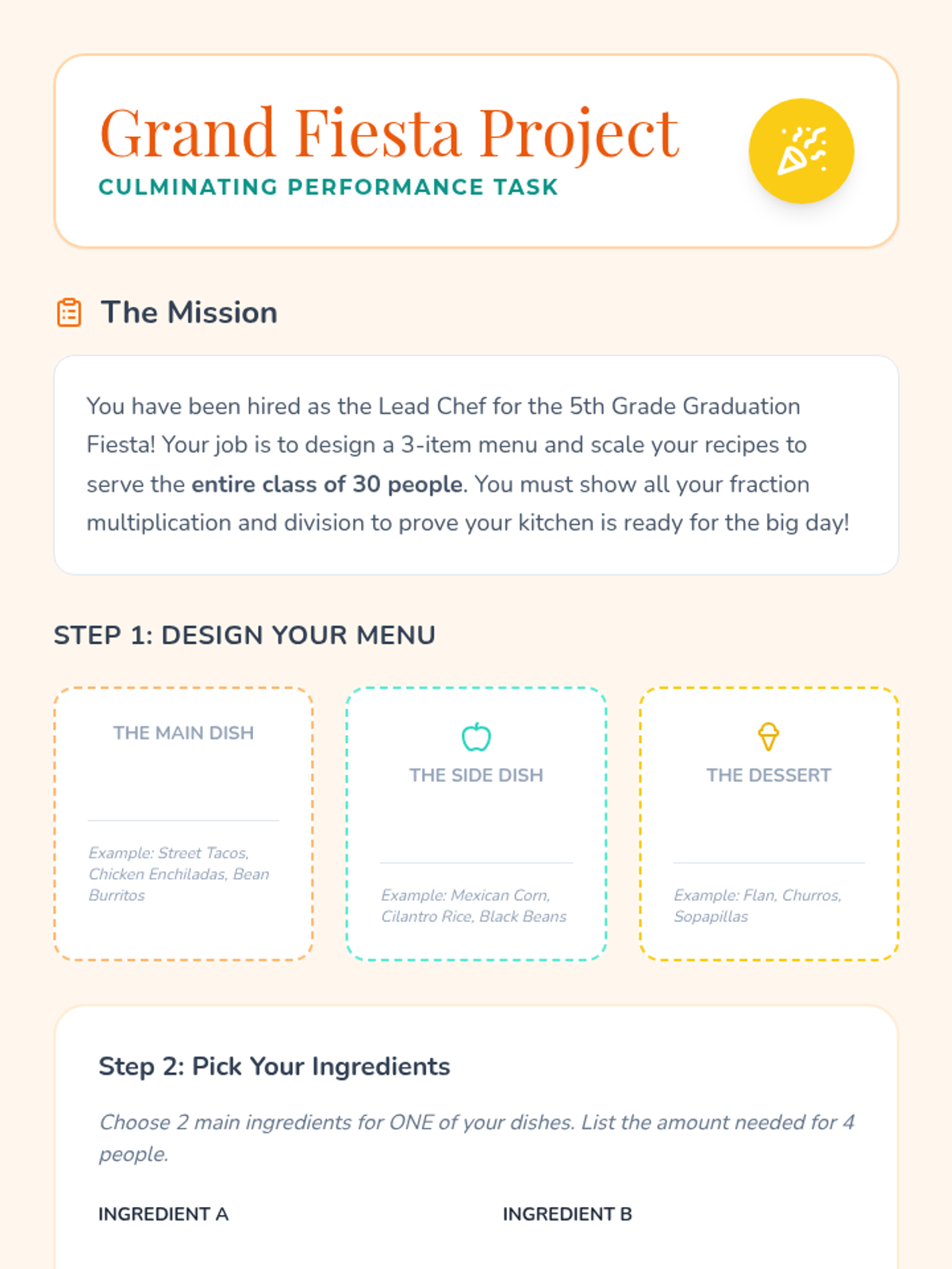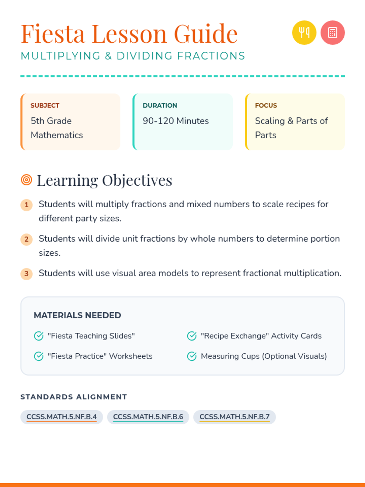 A festive, high-energy math lesson where 5th graders master multiplying and dividing fractions through visual models and a real-world 'Recipe Exchange' activity. Students scale ingredients for a fiesta and solve practical problems involving mixed numbers.
