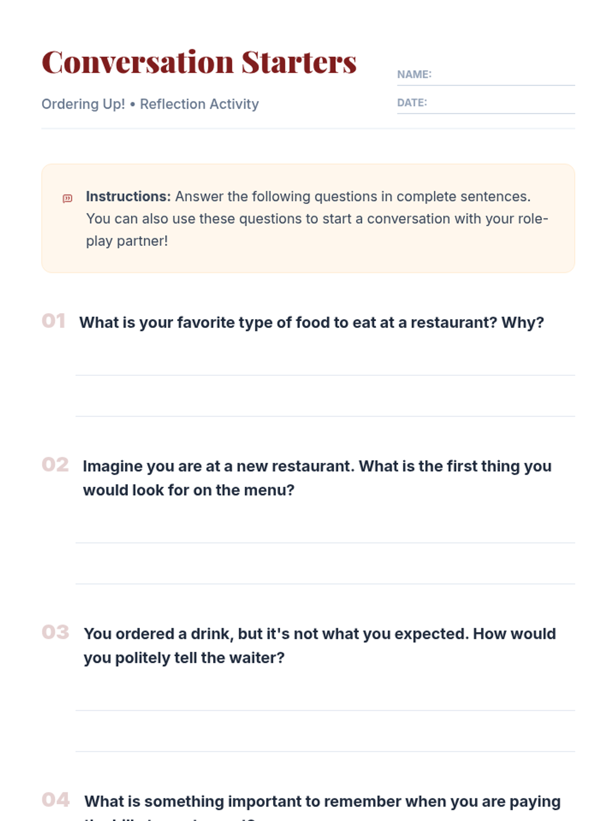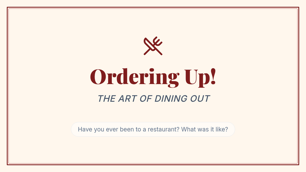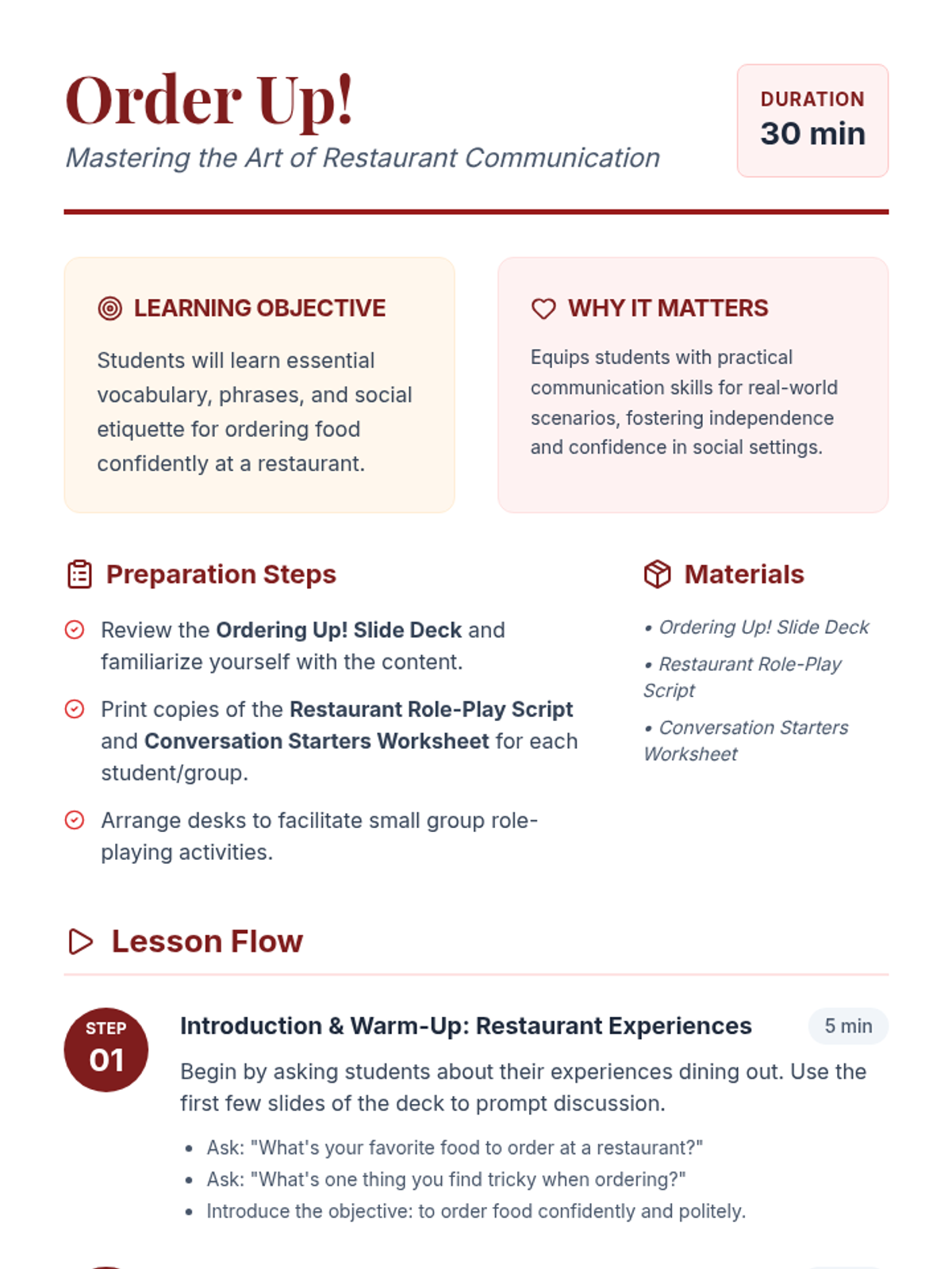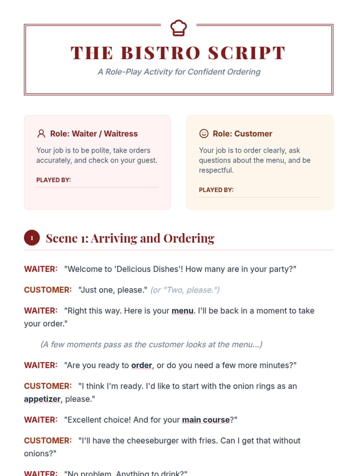 A practical 30-minute lesson for teenagers focused on mastering the vocabulary and etiquette of ordering food at a restaurant through role-play and interactive activities.