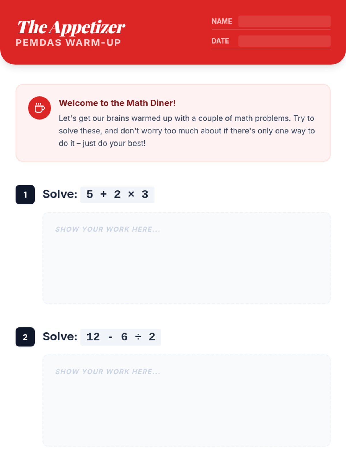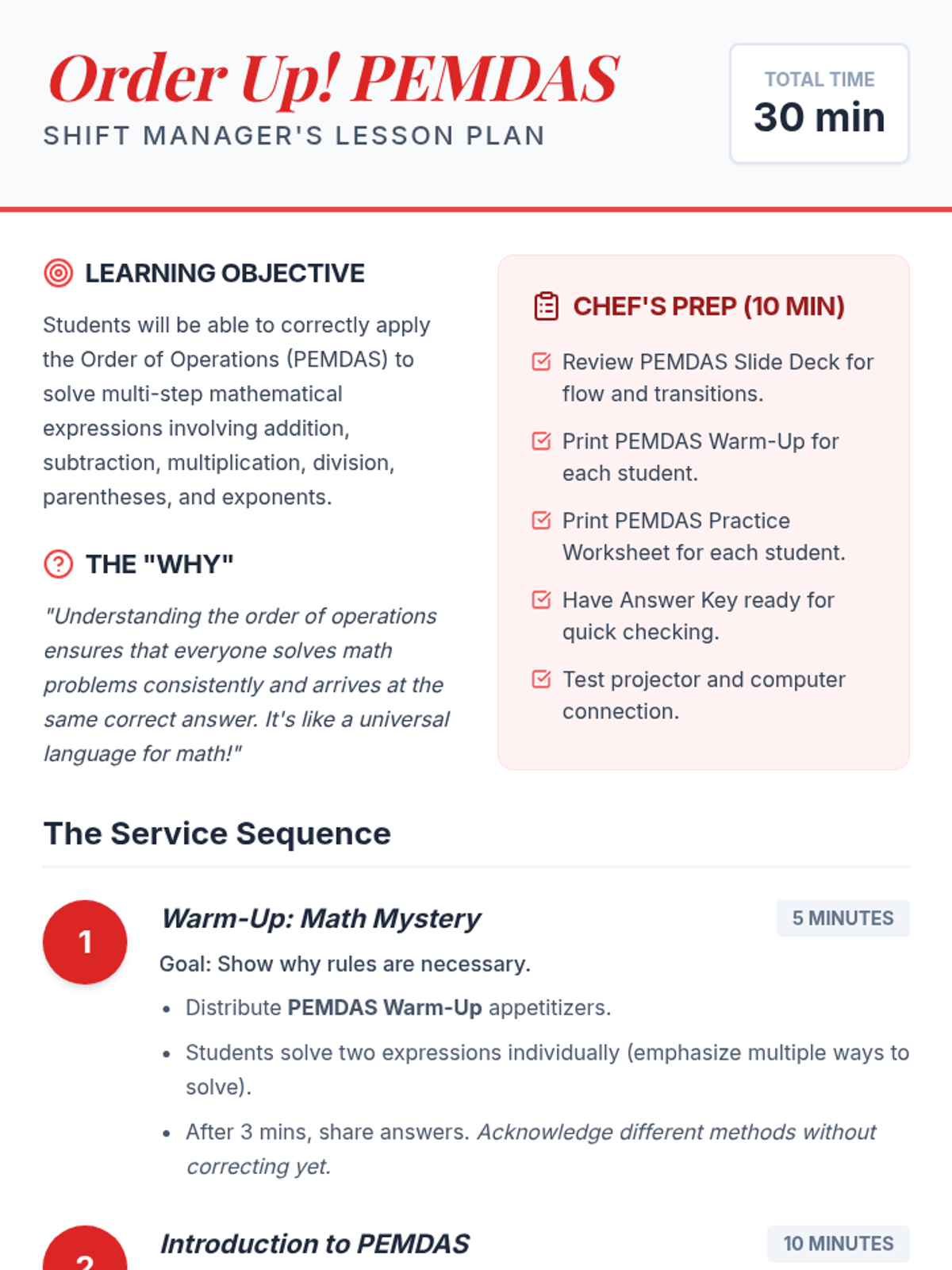 This lesson introduces 5th-grade students to the Order of Operations (PEMDAS) to solve mathematical expressions using a fun diner-themed approach. Understanding PEMDAS ensures consistent mathematical results and builds a foundation for algebra.