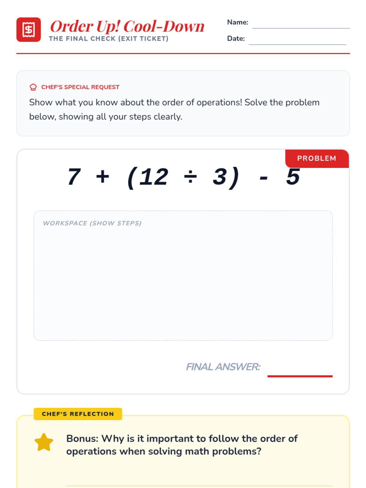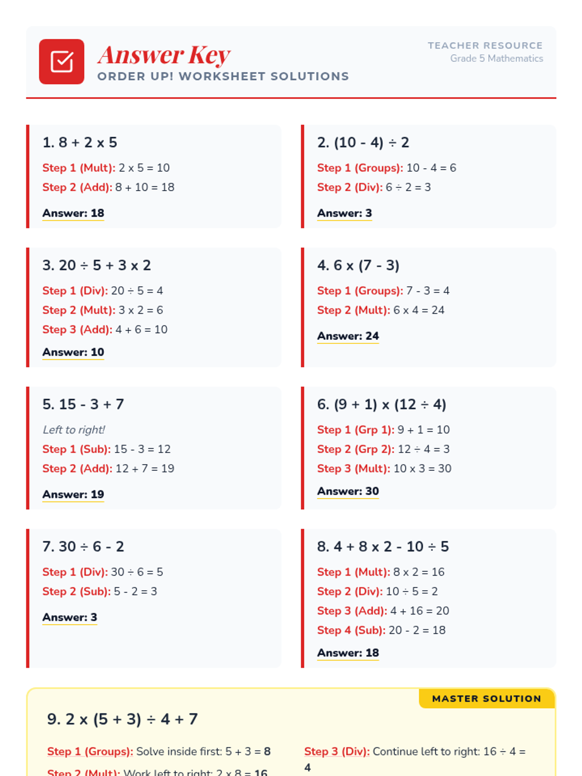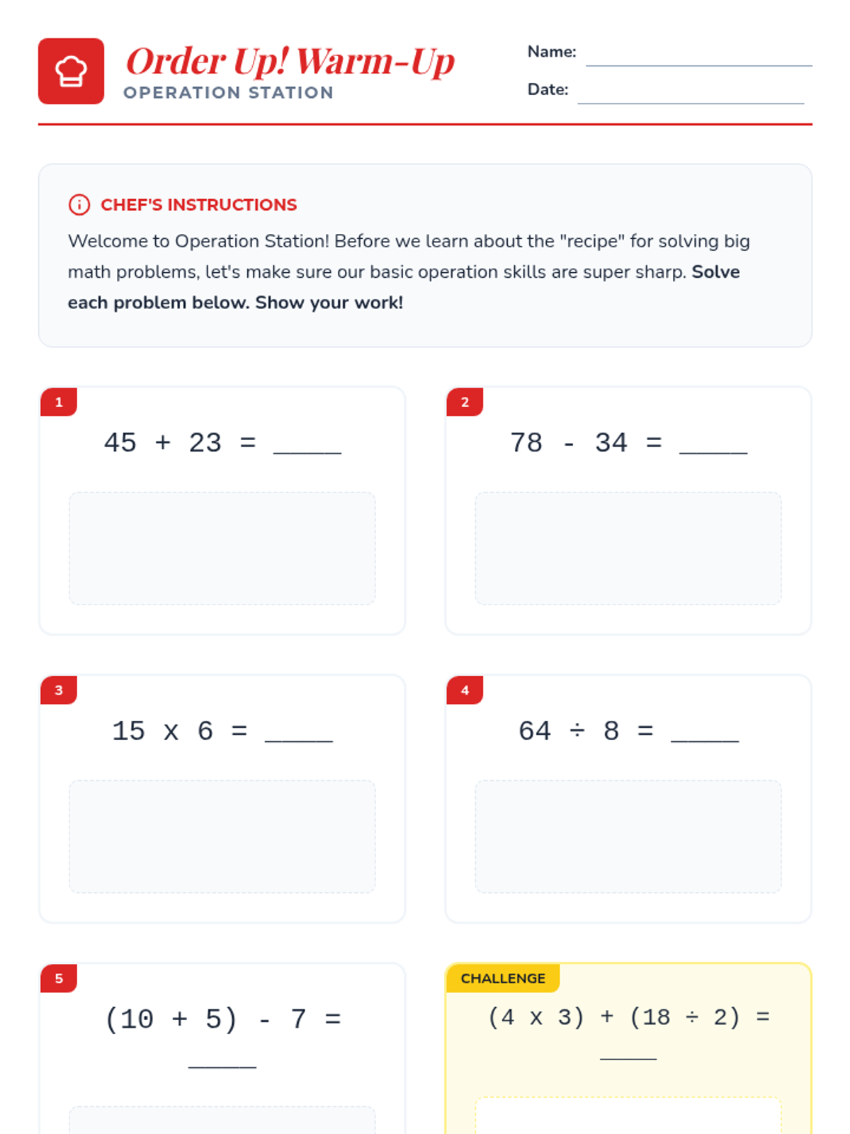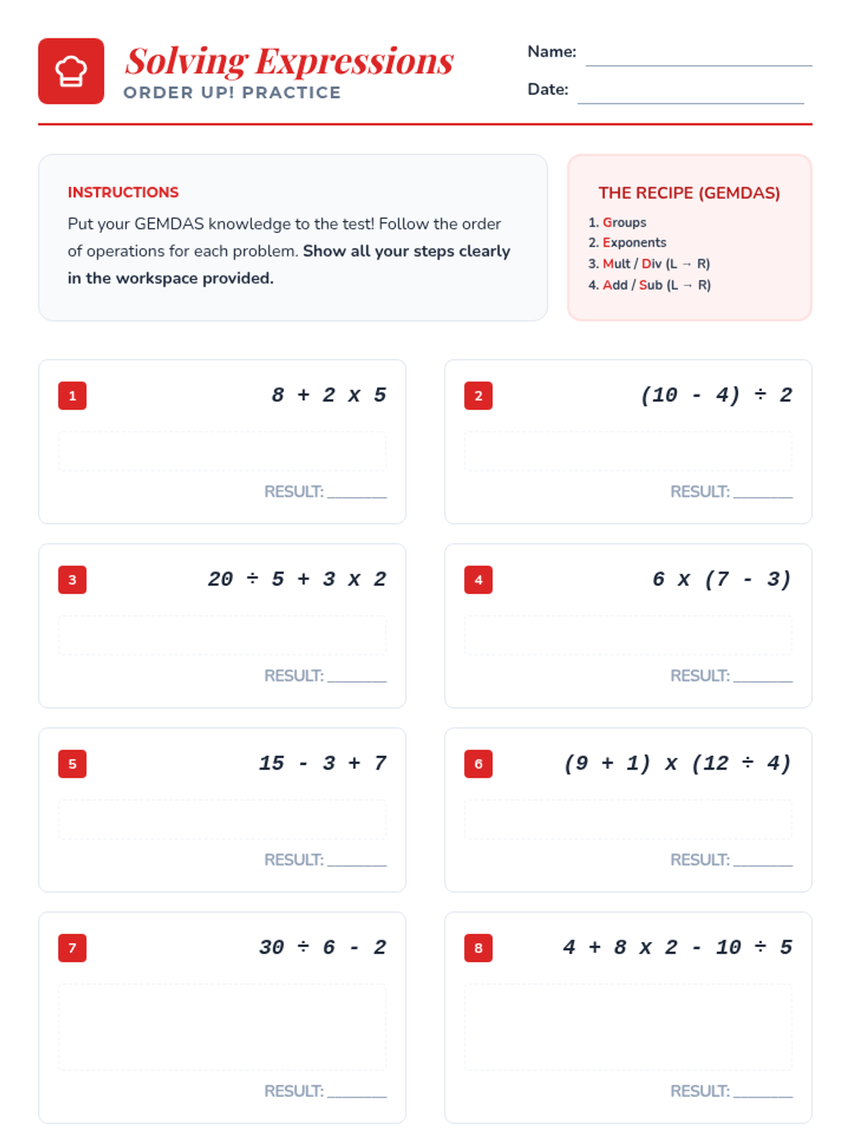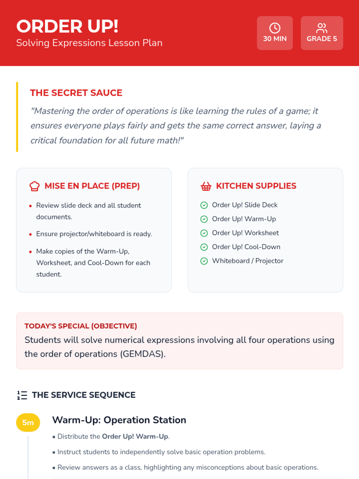 This lesson introduces 5th-grade students to the order of operations (PEMDAS/GEMS) to accurately solve numerical expressions involving addition, subtraction, multiplication, and division. Designed for a whole-class setting, this 30-minute lesson uses a restaurant-themed 'recipe' metaphor to help students master the systematic approach to multi-operation problems.