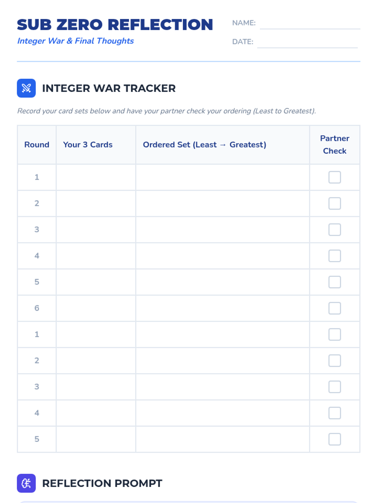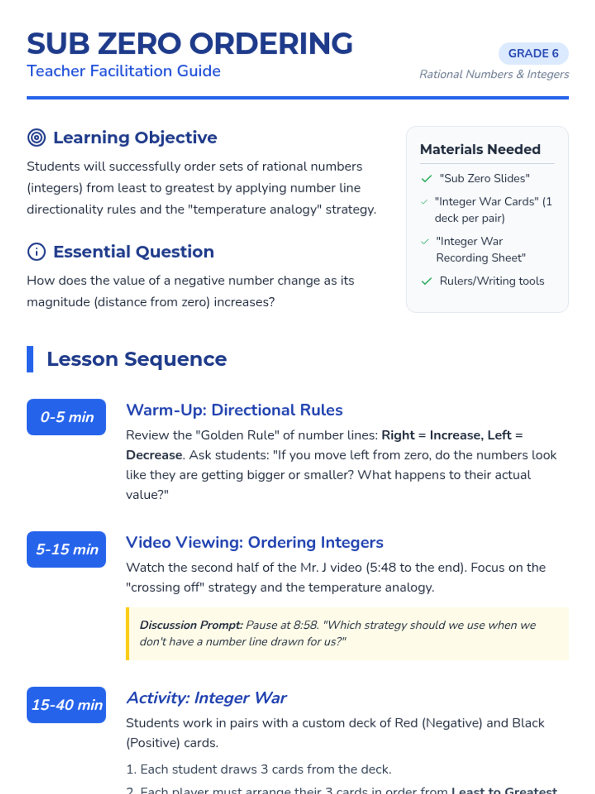 A 6th-grade math lesson on ordering integers from least to greatest using number line strategies, temperature analogies, and a 'Integer War' card game. students explore the concept that smaller-looking negative numbers have greater value.