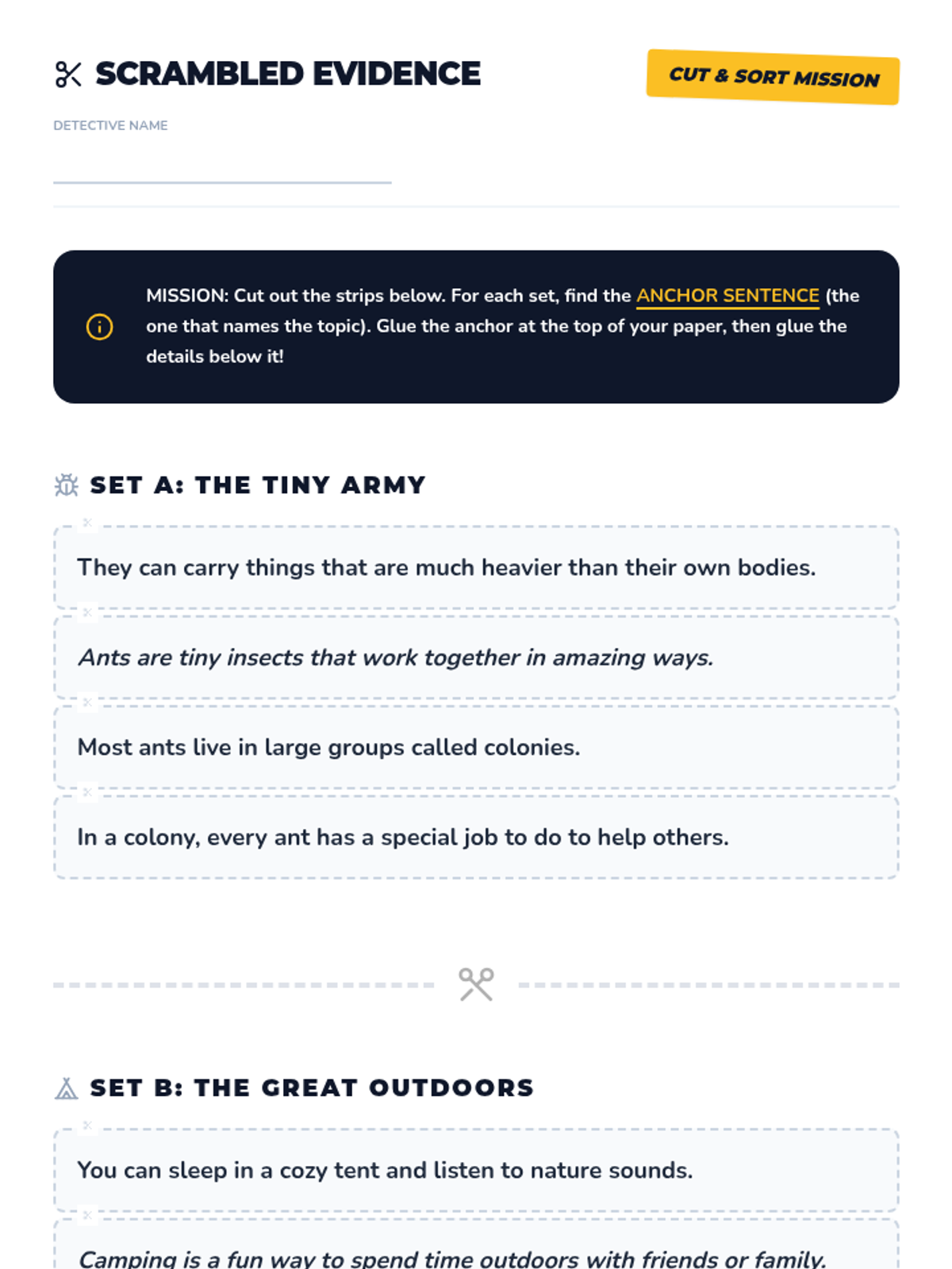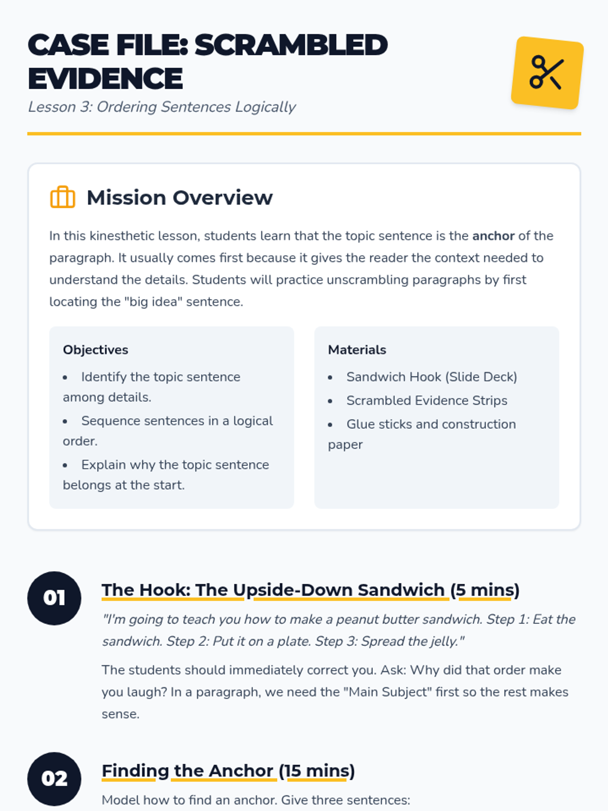 Students practice logical flow by identifying the anchor topic sentence in scrambled paragraphs and physically rearranging sentence strips.