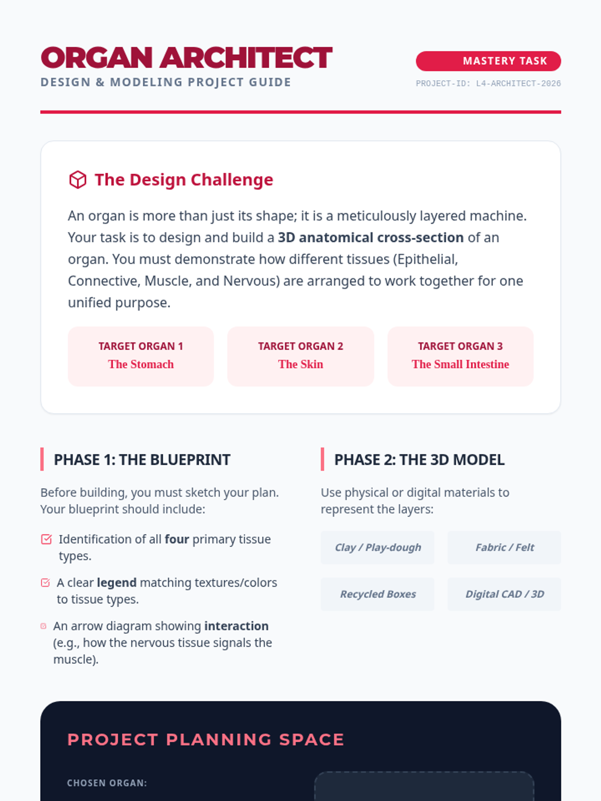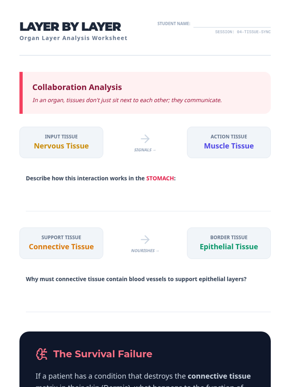 Students analyze the stomach or skin as model organs to see how all four tissue types collaborate to perform a specific function within the body.