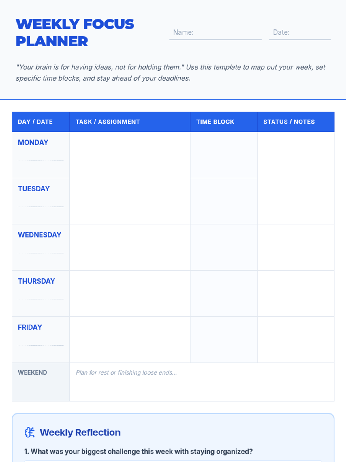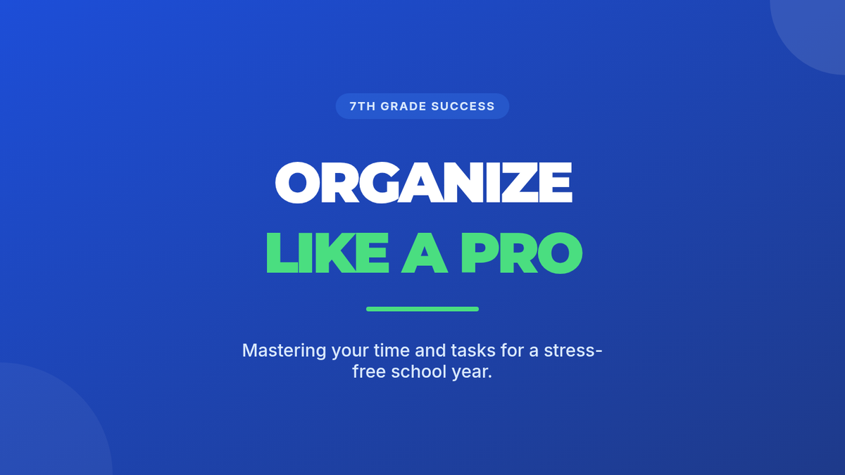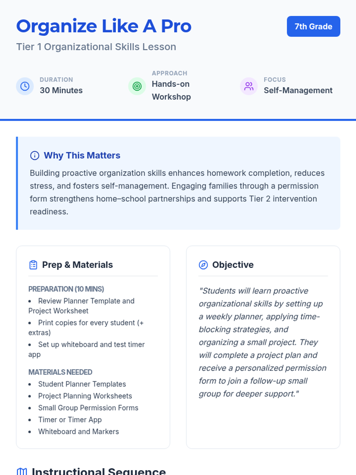 A 30-minute Tier 1 lesson for 7th graders focusing on proactive organizational skills, including planner setup, time blocking, and project management, with a follow-up small group component.