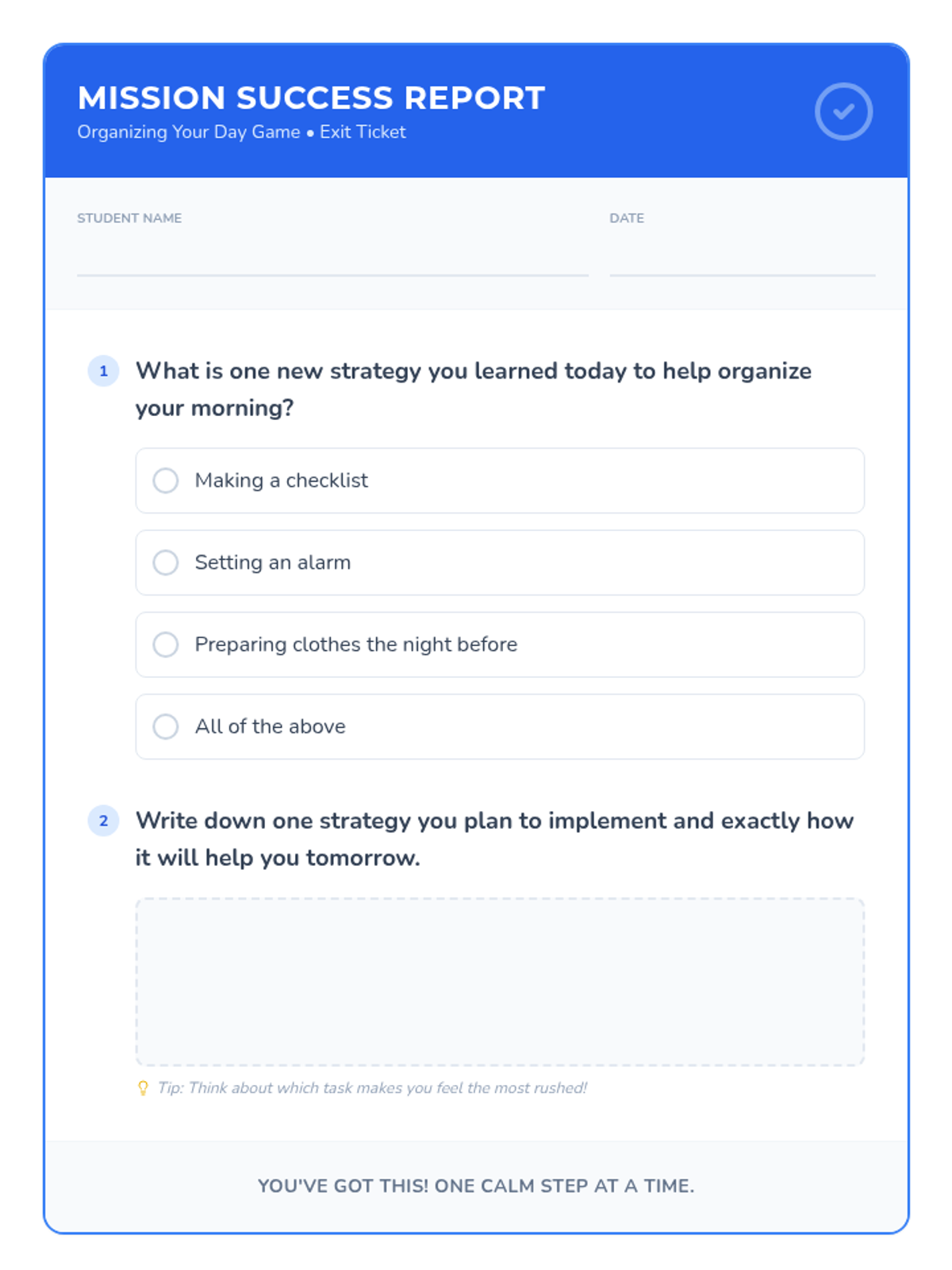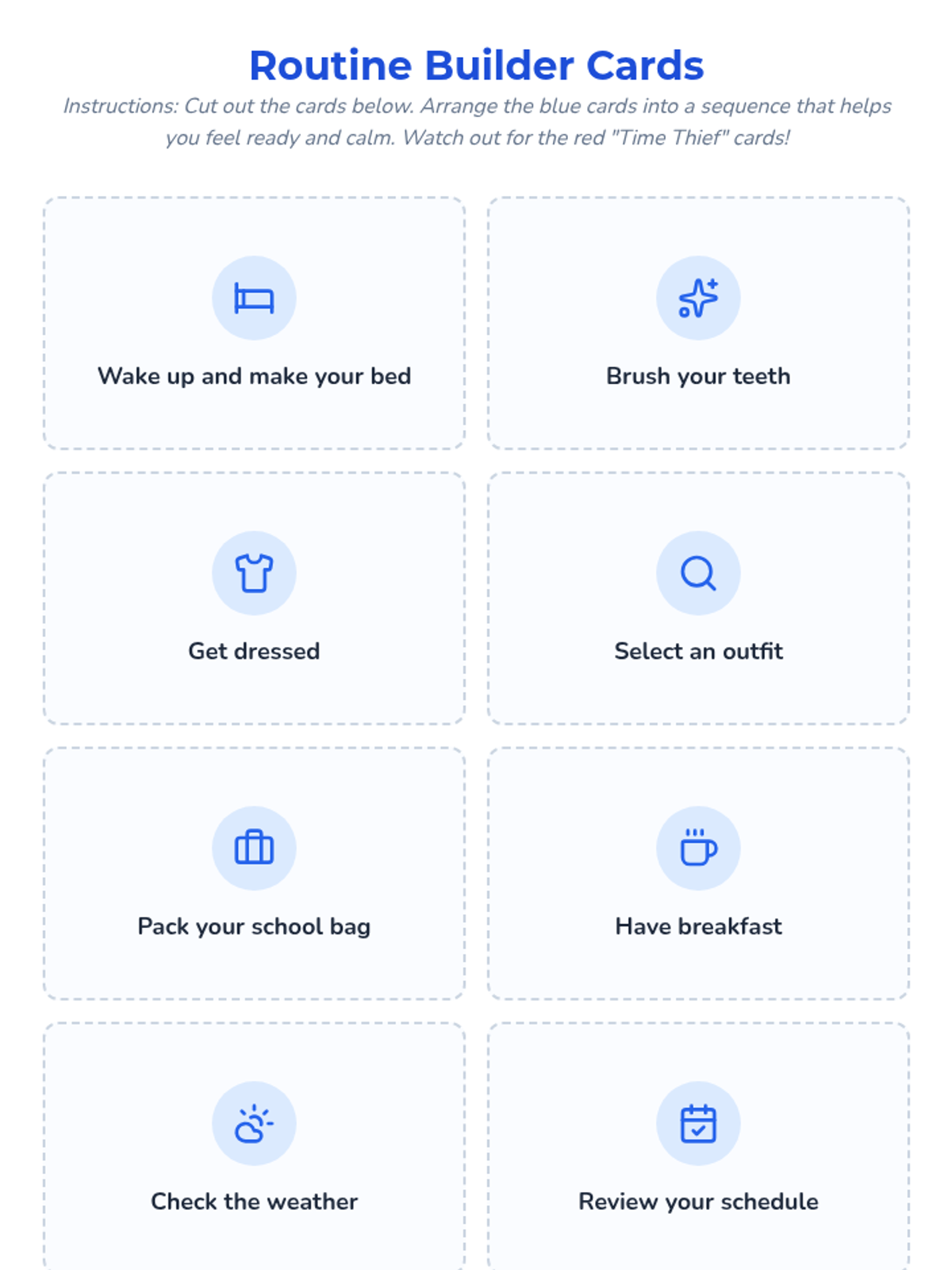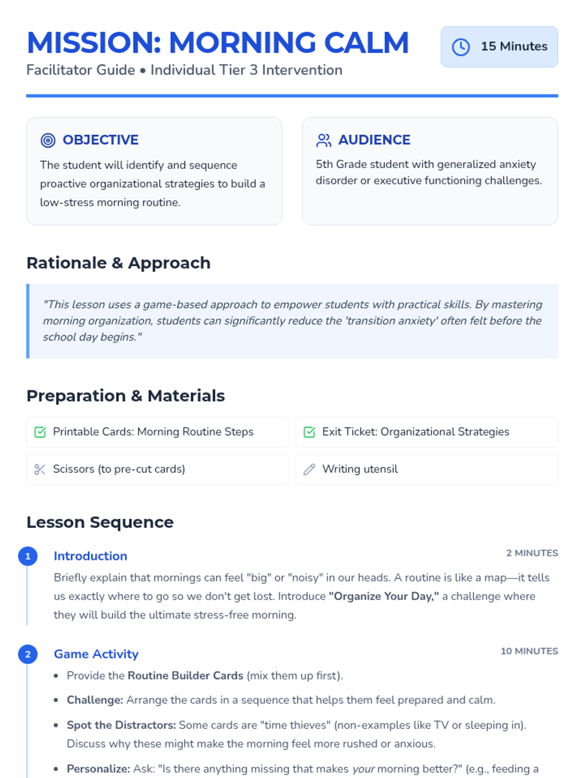 A game-based lesson for 5th graders with anxiety, focused on building a structured morning routine to reduce stress and improve school transitions.